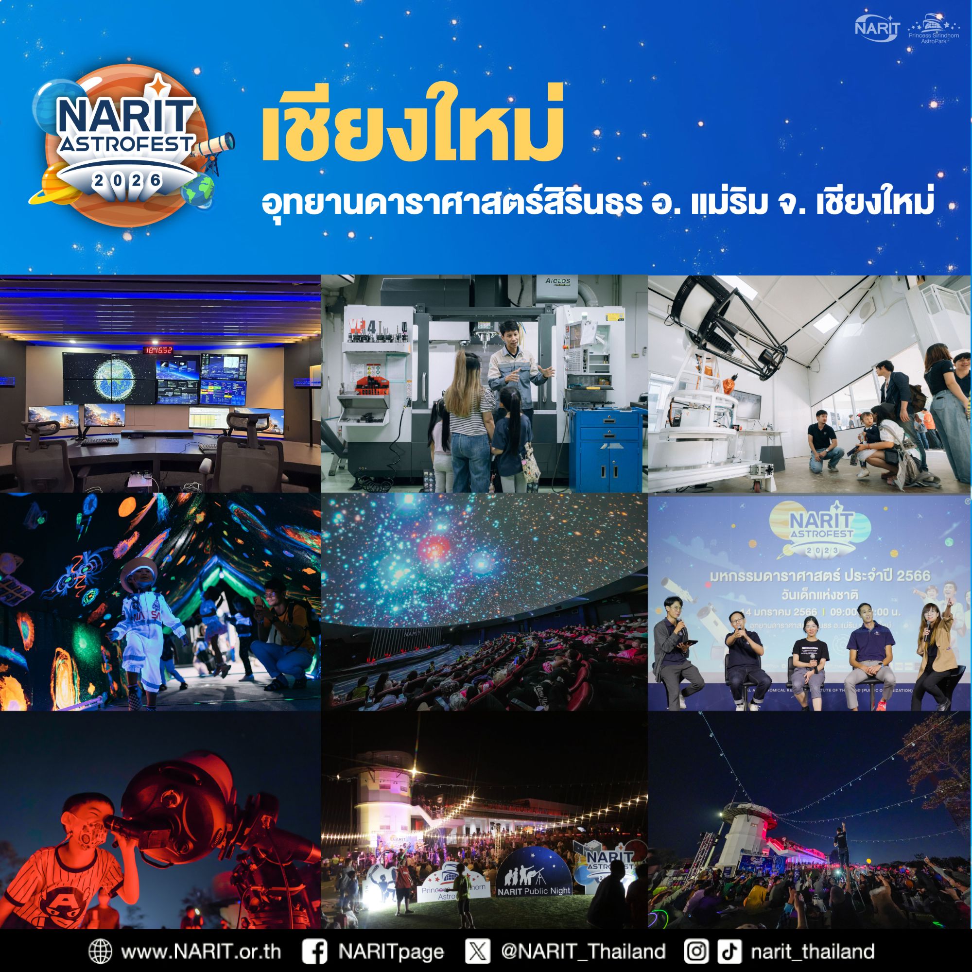 สดร. ชวนเที่ยวงานมหกรรมดาราศาสตร์ครั้งใหญ่แห่งปี NARIT AstroFest 2026 ในวันเด็กแห่งชาติ 2569 ตั้งแต่เวลา 09:00 – 22:00 น. จัดพร้อมกัน 5 แห่ง ณ อุทยานดาราศาสตร์สิรินธร อ. แม่ริม จ. เชียงใหม่ และหอดูดาวเฉลิมพระเกียรติ 7 รอบ พระชนมพรรษา นครราชสีมา ขอนแก่น ฉะเชิงเทรา สงขลา ชวนมาตะลุยโลกดาราศาสตร์ กับหลากหลายกิจกรรมตลอดวัน ตั้งแต่เช้าจนดึก ช่วงกลางวันเรียนรู้และสนุกกับนิทรรศการดาราศาสตร์ ท้องฟ้าจำลองรอบพิเศษ กิจกรรมสำหรับเด็กและครอบครัว ต่อด้วยช่วงกลางคืนที่ปีนี้สุดพิเศษ ตรงกับปรากฏการณ์ “ดาวพฤหัสบดีใกล้โลกที่สุดในรอบปี” ดาวพฤหัสบดีจะปรากฏสุกสว่างบนฟ้าตลอดคืน เป็นโอกาสดีที่จะได้ส่องชมความสวยงามของแถบเมฆ และดวงจันทร์กาลิเลียน ผ่านกล้องโทรทรรศน์ที่หอดูดาวของ NARIT ทั้งหมดนี้เข้าร่วมฟรี ไม่มีค่าใช้จ่าย