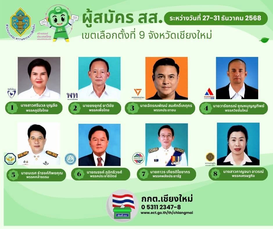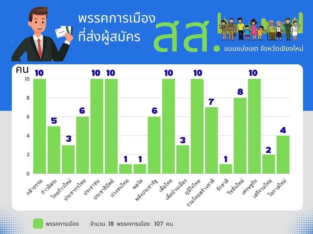 นายนพดล สุยะ ผู้อำนวยการสำนักงานคณะกรรมการการเลือกตั้งจังหวัดเชียงใหม่ เผยต่อผู้สื่อข่าวว่าหลังจากเปิดรับสมัครรับเลือกตั้งสมาชิกสภาผู้แทนราษฎรจำนวน 10 เขต มีผู้สมัครรับเลือกตั้งจาก 18 พรรคการเมือง จำนวนทั้งสิ้น 107 คน ซึ่งเป็นอันดับ 3 ของประเทศ เป็น เขตที่ 1 จำนวน 12 คน ,เขตที่ 2 จำนวน 12 คน ,เขตที่ 3 จำนวน 14 คน ,เขตที่ 4 จำนวน 13 คน ,เขตที่ 5 จำนวน 12 คน ,เขตที่ 6 จำนวน 8 คน ,เขตที่ 7 จำนวน 9 คน ,เขตที่ 8 จำนวน 12 คน ,เขตที่ 9 จำนวน 8 คน และเขตที่ 10 จำนวน 7 คน พรรคการเมืองที่ส่งครบทั้ง 10 เขต มีจำนวน 6 พรรค คือ 1,พรรคกล้าธรรม, 2 พรรคประชาชน ,3 พรรคประชาธิปัตย์ ,4พรรคเพื่อไทย ,5 พรรคภูมิใจไทยและ6 พรรคเศรษฐกิจ