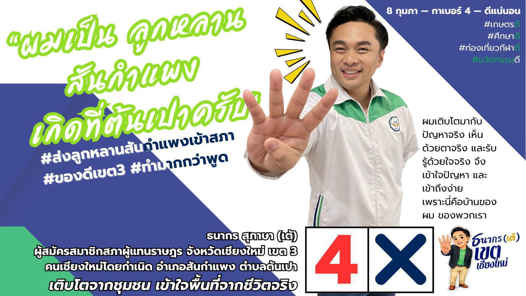 เต้ เชื่อว่า การเมืองที่ดี ต้องเริ่มจากการ “ฟัง” และ “ลงมือทำไปพร้อมกัน” วันที่ 8 กุมภาพันธ์ 2569 ขอแรงใจ ขอโอกาสจากพี่น้องเขต 3 ลงคะแนนให้ เต้ ธนากร เบอร์ 4 พรรคกล้าธรรม เบอร์ 42 เพื่อเข้าไปเป็นเสียงของชุมชนในสภาเพื่อเขต 3 เชียงใหม่