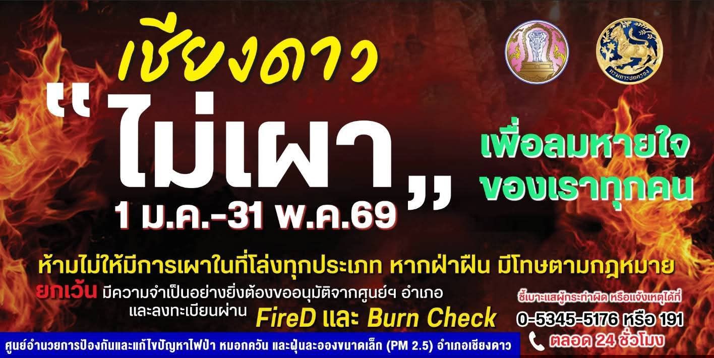 ศูนย์บัญชาการป้องกันและแก้ไขปัญหาไฟป่า หมอกควัน และฝุ่นละอองขนาดเล็ก (PM 2.5) อำเภอเชียงดาว ภายใต้การอำนวยการของ นายรัฐพล นราดิศร ผู้ว่าราชการจังหวัดเชียงใหม่ ได้ยกระดับความเข้มงวดตามประกาศจังหวัดเชียงใหม่ เรื่องกำหนดเขตการบริหารจัดการเชื้อเพลิงและเขตควบคุมการเผา ประจำปีงบประมาณ พ.ศ. 2569 อย่างเคร่งครัด
