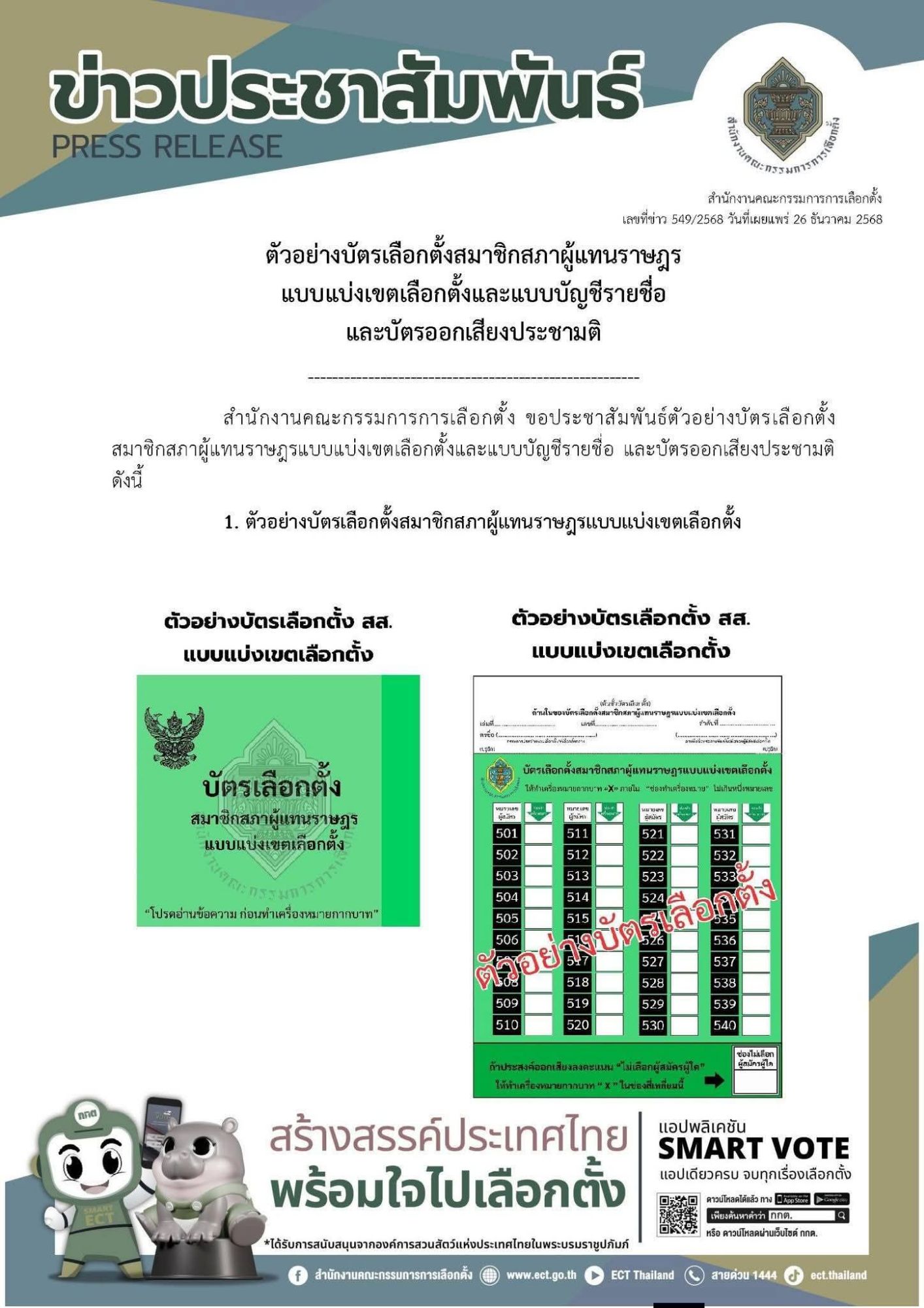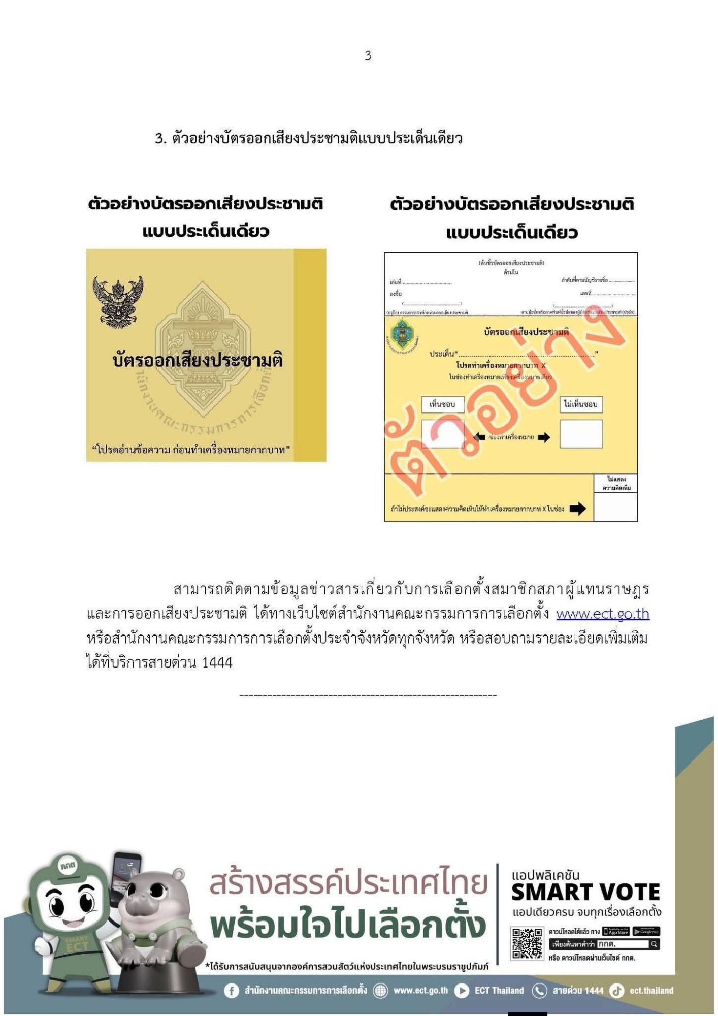 ทั้งนี้ กกต.เชียงใหม่ยังได้ประชาสัมพันธ์ ตัวอย่างบัตร เลือกตั้ง สส./ออกเสียง ที่ผู้จะไปใช้สิทธิ สส. แบบแบ่งเขต = สีเขียว, สส. แบบบัญขีรายชื่อ = สีชมพู และออกเสียงประชามติ = สีเหลืองทอง สามารถติดตามข้อมูลข่าวสารเกี่ยวกับการเลือกตั้งสมาชิกสภาผู้แทนราษฎรและการออกเสียงประชามติ ได้ทางเว็บไซต์สำนักงานคณะกรรมการการเลือกตั้ง www.ect go.th หรือสำนักงานคณะกรรมการการเลือกตั้งประจำจังหวัดทุกจังหวัด หรือสอบถามรายละเอียดเพิ่มเติม