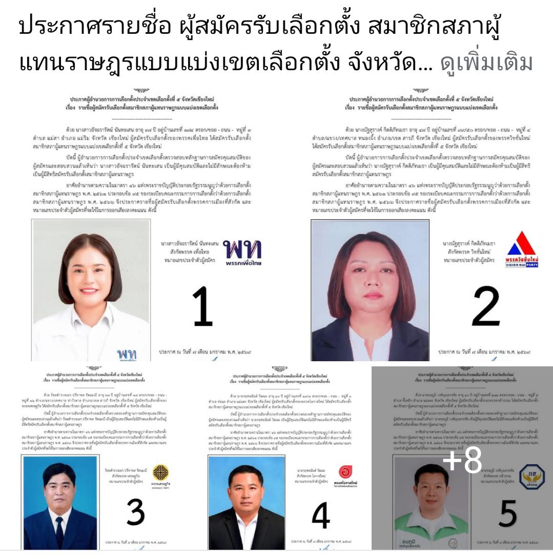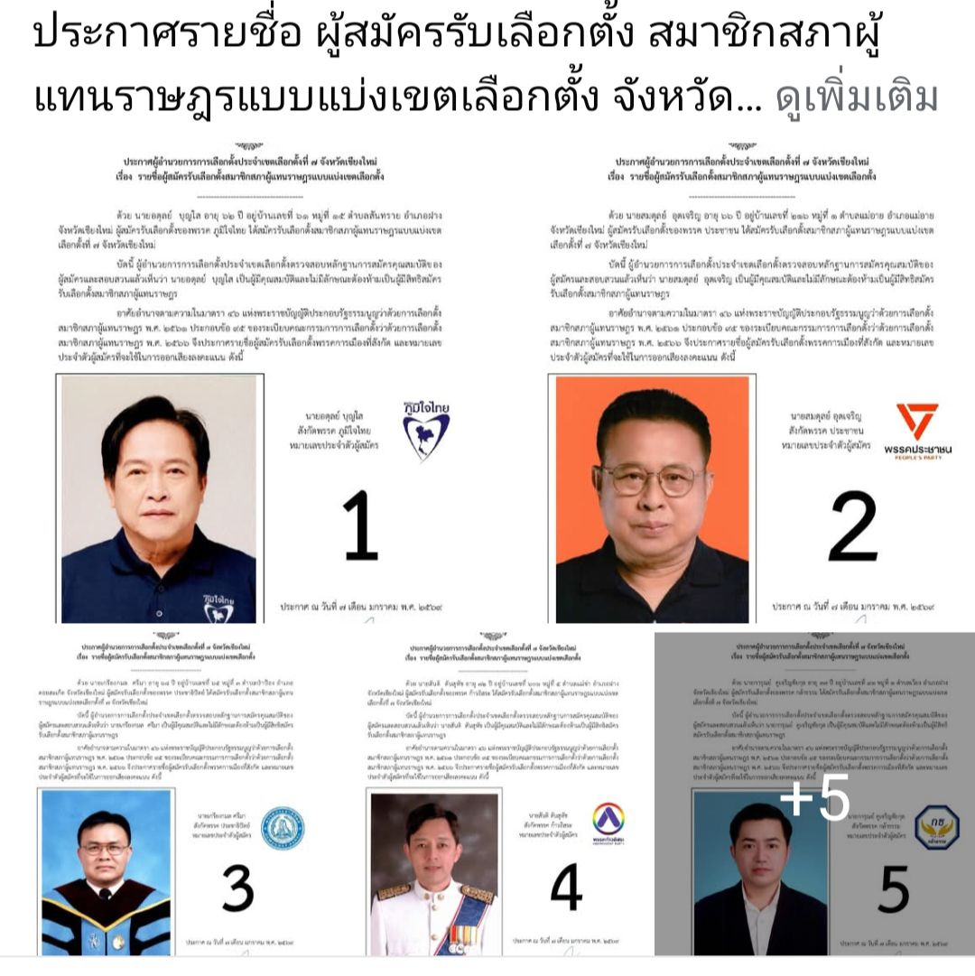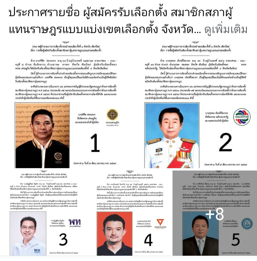ประชาชนสามารถตรวจสอบรายชื่อผู้สมัครรับเลือกตั้งแบบบัญชีรายชื่อ และประกาศการแจ้งรายชื่อบุคคลที่พรรคการเมืองจะเสนอให้สภาผู้แทนราษฎรพิจารณาแต่งตั้งเป็นนายกรัฐมนตรี ได้ที่เว็บไซต์: https://www.ect.go.th/th/chiangmai/
