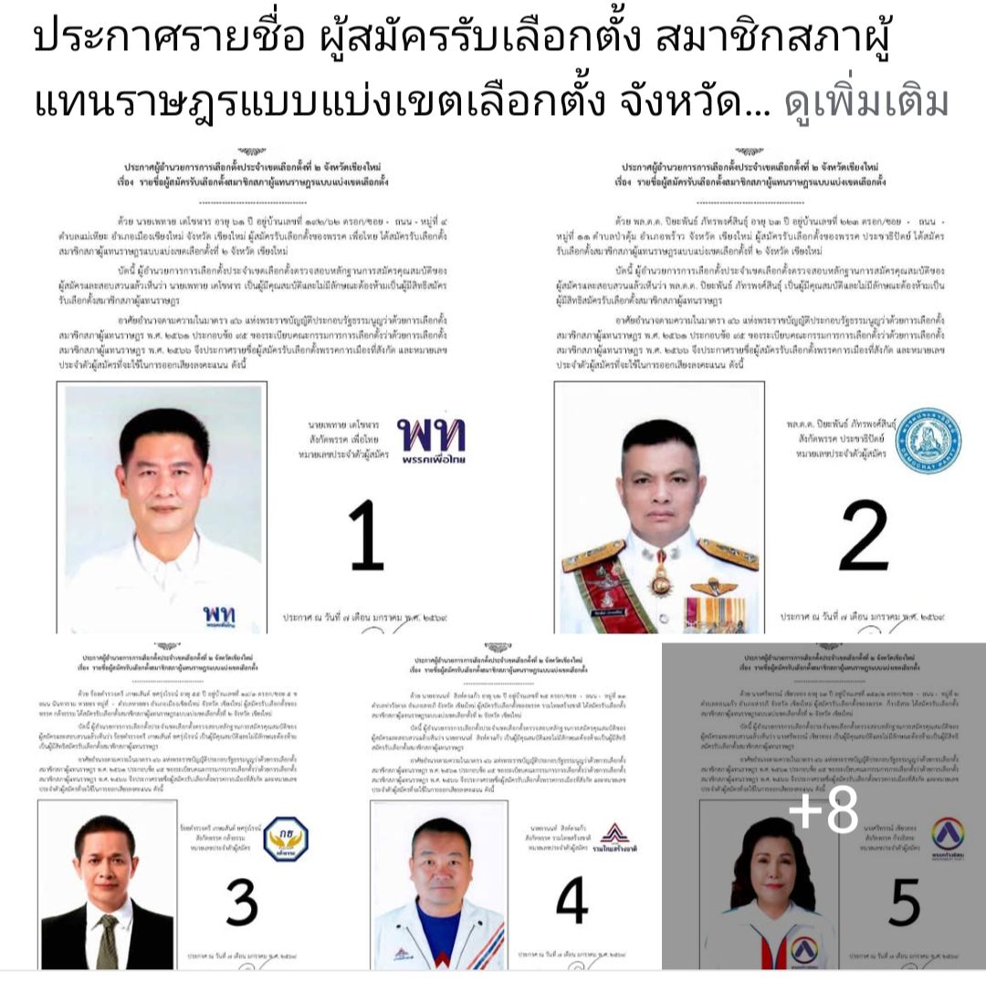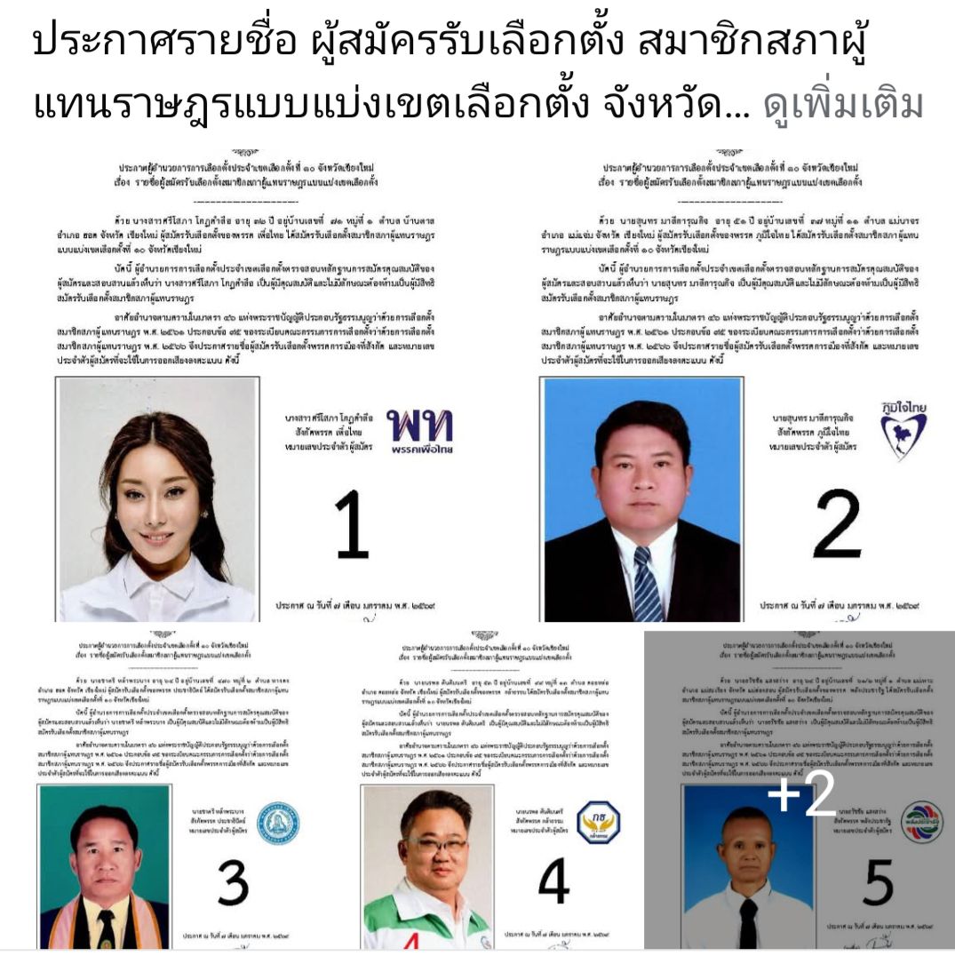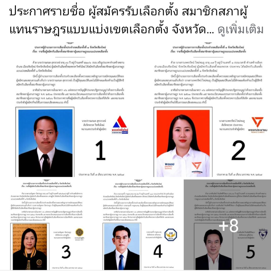 ประชาชนสามารถตรวจสอบรายชื่อผู้สมัครรับเลือกตั้งแบบบัญชีรายชื่อ และประกาศการแจ้งรายชื่อบุคคลที่พรรคการเมืองจะเสนอให้สภาผู้แทนราษฎรพิจารณาแต่งตั้งเป็นนายกรัฐมนตรี ได้ที่เว็บไซต์: https://www.ect.go.th/th/chiangmai/