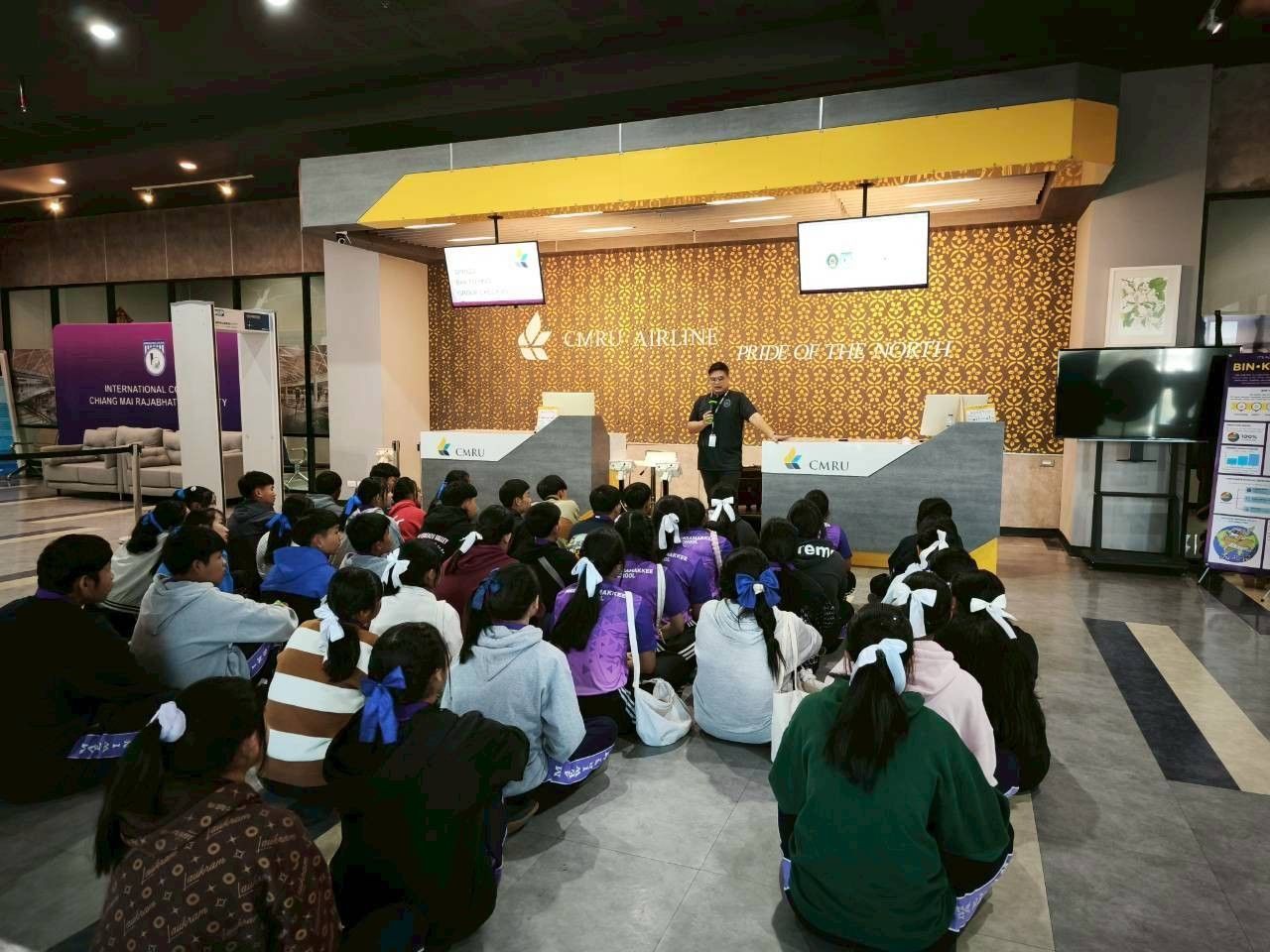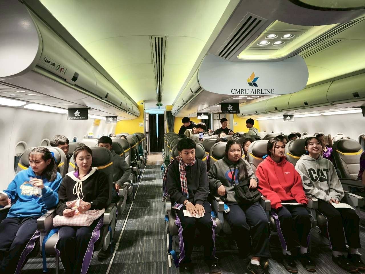 จากนั้น นักเรียนได้เดินทางไปศึกษาดูงานต่อ ณ วิทยาลัยนานาชาติ มหาวิทยาลัยราชภัฏเชียงใหม่ ในส่วนของหลักสูตรธุรกิจการบิน กิจกรรมดังกล่าวเปิดโอกาสให้นักเรียนได้สัมผัสประสบการณ์ตรงภายในห้องปฏิบัติการจำลองการบิน เรียนรู้บทบาทหน้าที่ของพนักงานต้อนรับบนเครื่องบิน การบริการผู้โดยสาร และการแก้ไขสถานการณ์เฉพาะหน้าด้วยภาษาอังกฤษและภาษาจีน ซึ่งช่วยให้นักเรียนเห็นภาพการใช้ภาษาในบริบทวิชาชีพที่มีความซับซ้อนและเป็นสากลมากยิ่งขึ้น