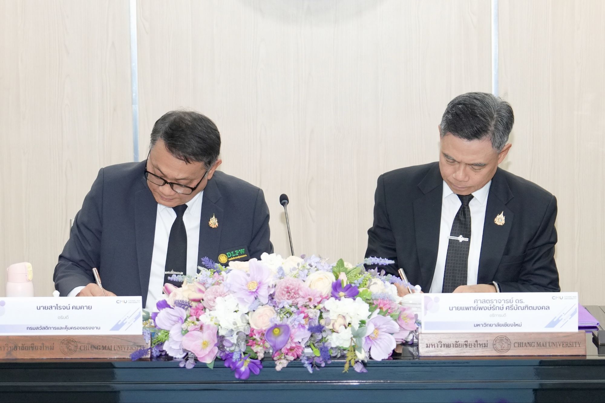 ศาสตราจารย์ ดร.นายแพทย์พงษ์รักษ์ ศรีบัณฑิตมงคล อธิการบดีมหาวิทยาลัยเชียงใหม่ ลงนามใน บันทึกข้อตกลงความร่วมมือว่าด้วยการส่งเสริมและการคุ้มครองแรงงานนอกระบบ ร่วมกับ เรือเอกสาโรจน์ คมคาย อธิบดีกรมสวัสดิการและคุ้มครองแรงงาน กระทรวงแรงงาน เมื่อวันพุธที่ 14 มกราคม 2569 ณ ห้องประชุมพระยาศรีวิสารวาจา สำนักงานมหาวิทยาลัย โดยมี ผู้ช่วยศาสตราจารย์ ดร.ระวี จันทร์ส่อง คณบดีคณะมนุษยศาสตร์และผู้ช่วยศาสตราจารย์ทรงพันธ์ ตันตระกูล รองคณบดี เข้าร่วมพิธี ลงนามในฐานะพยาน