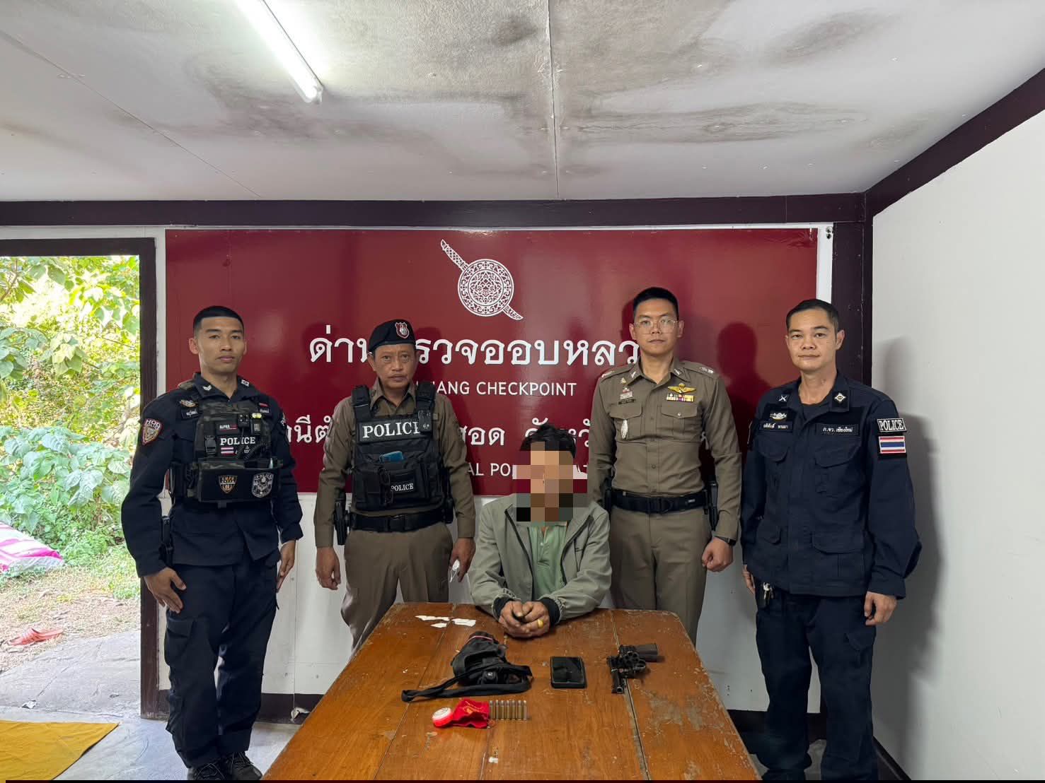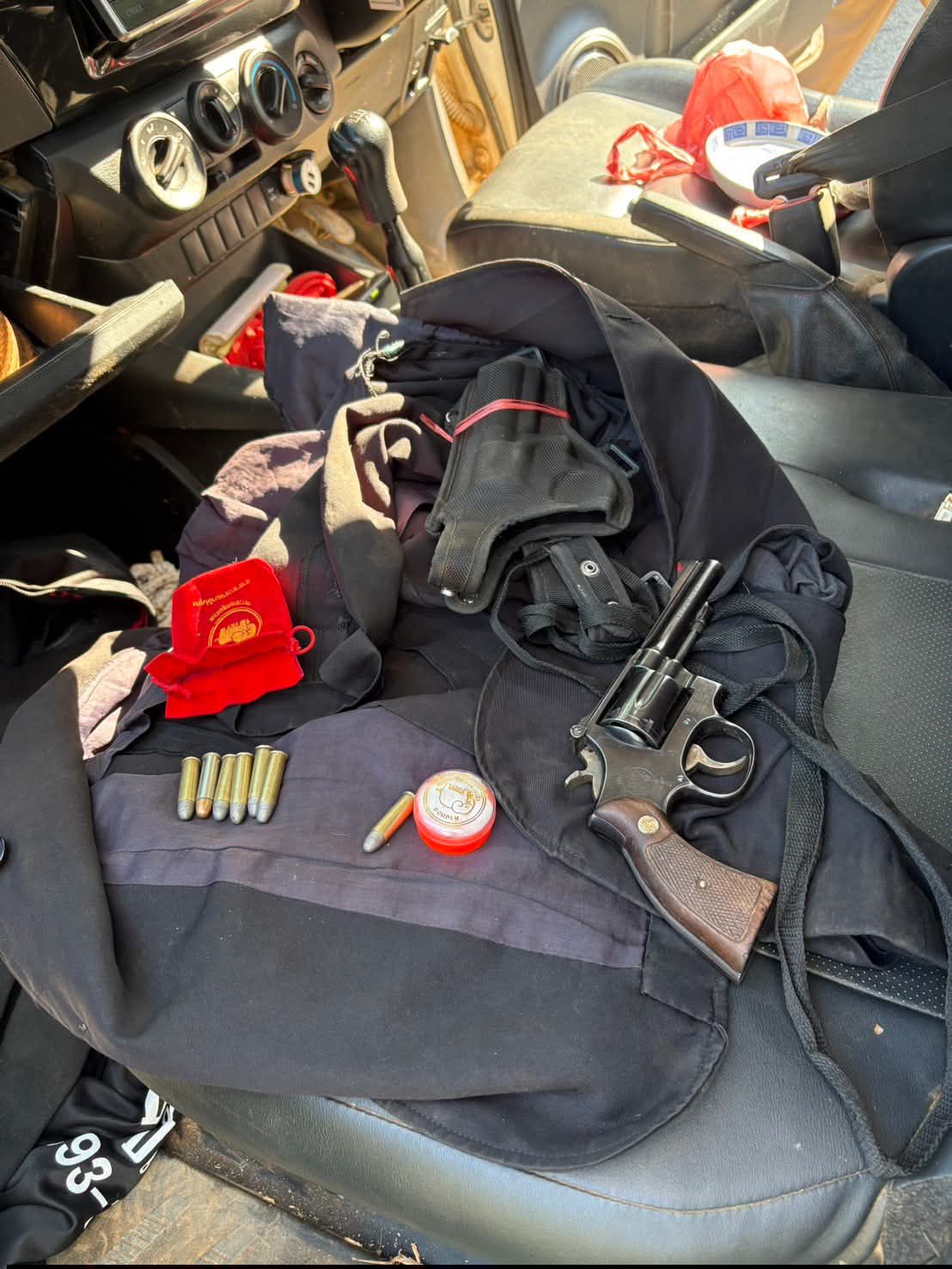จากการตรวจสอบเบื้องต้นพบ นายธน*** (สงวนนามสกุล) อายุ 55 ปี ชาวจังหวัดแม่ฮ่องสอน เป็นผู้ขับขี่ โดยบุคคลดังกล่าวแสดงอาการลุกลี้ลุกลนและมีพิรุธอย่างเห็นได้ชัด เจ้าหน้าที่จึงได้แสดงความบริสุทธิ์ใจและขอทำการตรวจค้นรถยนต์คันดังกล่าว ซึ่งจากการตรวจค้นบริเวณช่องเก็บของด้านหลังเบาะผู้ขับขี่ พบอาวุธปืนพกแบบลูกโม่ ยี่ห้อ SMITH & WESSON สีดำ หมายเลขทะเบียน กท686037 จำนวน 1 กระบอก บรรจุอยู่ในซองผ้า พร้อมด้วยเครื่องกระสุนปืนขนาด .38 จำนวน 7 นัด ซุกซ่อนอยู่ในเสื้อแขนยาวสีดำอีกชั้นหนึ่ง