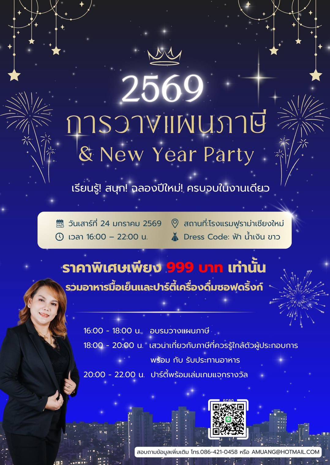ทักษิณาการบัญชี ขอเชิญชวนผู้ประกอบการและเจ้าของธุรกิจเข้าร่วมงานสัมมนาและกิจกรรมสังสรรค์ส่งท้ายปีเก่าต้อนรับปีใหม่ในงาน “NEW YEAR PARTY & อบรมวางแผนบัญชีสำหรับธุรกิจ” ซึ่งจะจัดขึ้นในวันเสาร์ที่ 24 มกราคม 2569 ณ ห้องลีลาวดี ชั้น 5 โรงแรมฟูราม่า (Furama) เชียงใหม่ เพื่อเตรียมความพร้อมด้านการบริหารจัดการบัญชีและภาษีให้ถูกต้องแม่นยำในปีหน้า