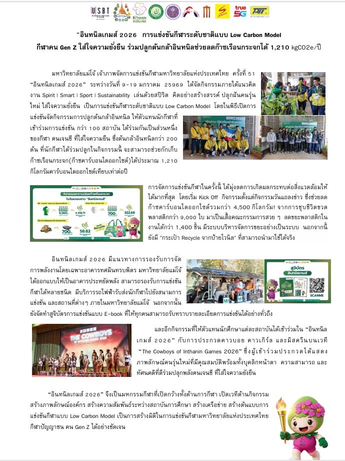 มหาวิทยาลัยแม่โจ้ เจ้าภาพจัดการแข่งขันกีฬามหาวิทยาลัยแห่งประเทศไทย ครั้งที่ 51 “อินทนิลเกมส์ 2026” ระหว่างวันที่ 9-19 มกราคม 25969 ได้จัดกิจกรรมภายใต้แนวคิด งาน Spirit | Smart | Sport | Sustainability เล่นด้วยสปิริต คิดอย่างสร้างสรรค์ ปลุกฝันคนรุ่นใหม่ ใส่ใจความยั่งยืน เป็นการแข่งขันกีฬาระดับชาติแบบ Low Carbon Model โดยในพิธีเปิดการแข่งขันจัดกิจกรรมการปลูกต้นกล้าอินทนิล ให้ตัวแทนนักกีฬาที่เข้าร่วมการแข่งขัน กว่า 100 สถาบัน ได้ร่วมกันเป็นส่วนหนึ่ง ของกีฬา คนเจนซี ที่ใส่ใจความยืน ซึ่งต้นกล้าอินทนิลกว่า 200 ต้น ที่นักกีฬาได้ร่วมปลูกในกิจกรรมนี้ จะสามารถช่วยกักเก็บก๊าซเรือนกระจก(ก๊าซคาร์บอนไดออกไซด์)ได้ประมาณ 1,210 กิโลกรัมคาร์บอนไดออกไซด์เทียบเท่าต่อปี