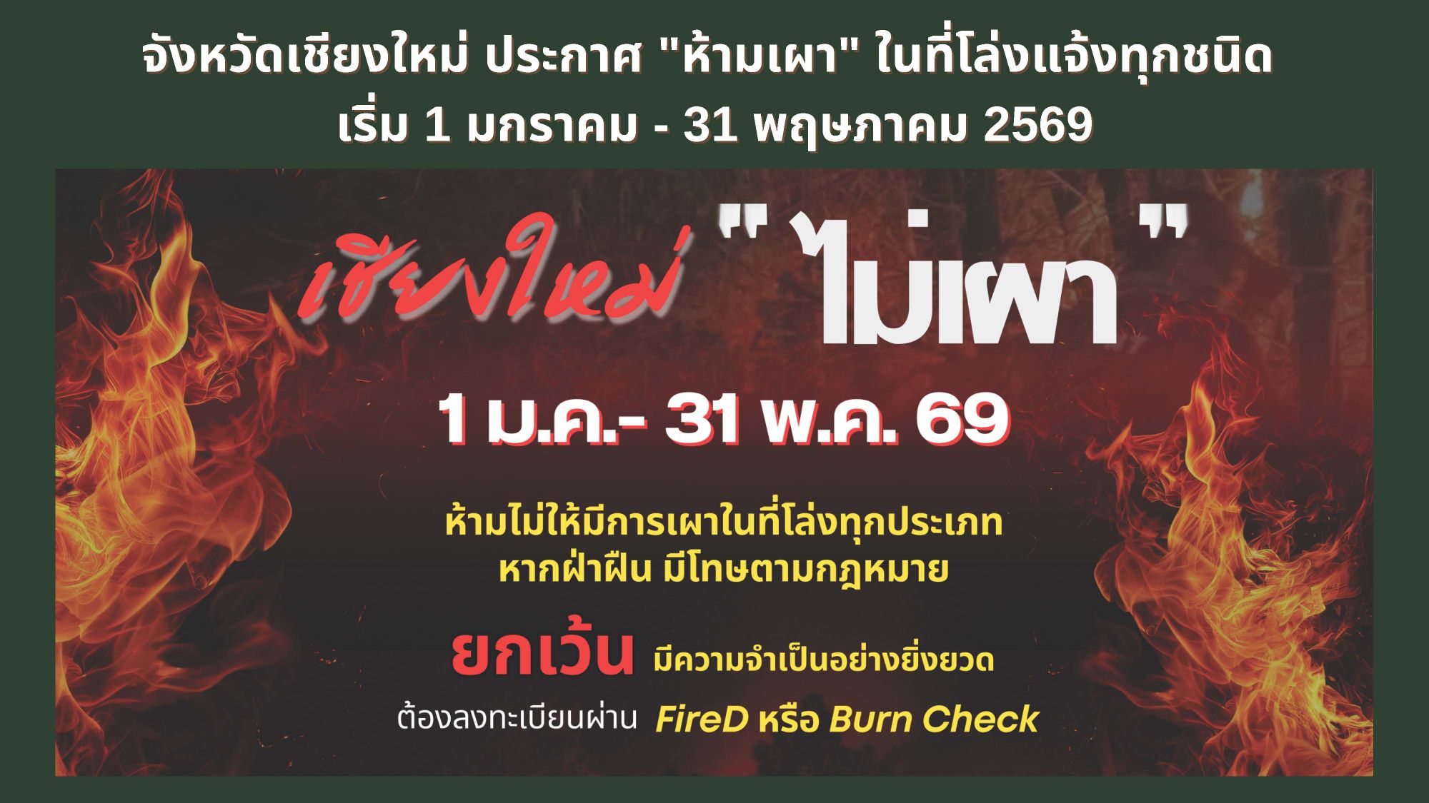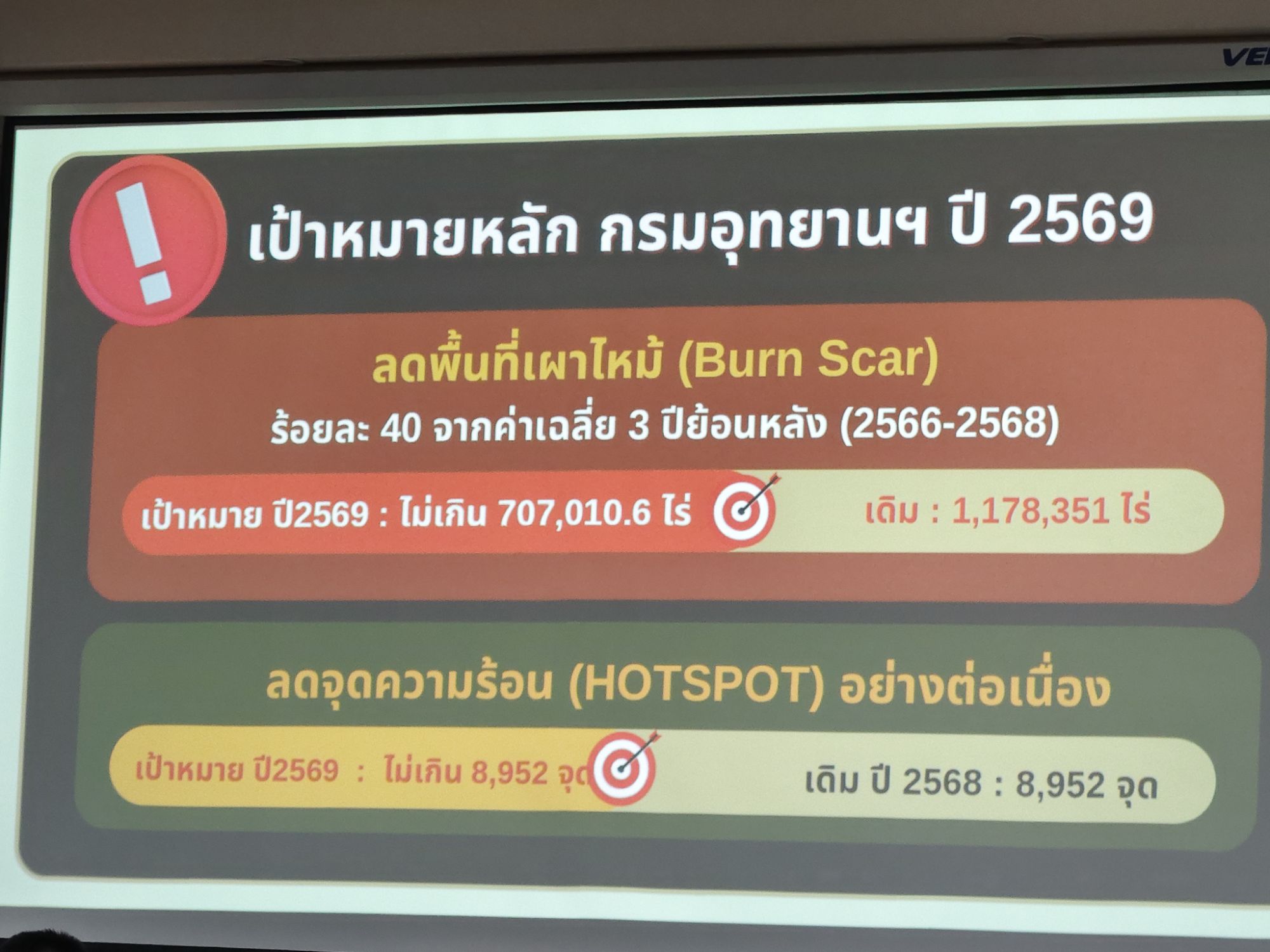 สำหรับปี 2569 นี้ เป้าหมายหลักของกรมอุทยานแห่งชาติ สัตว์ป่า และพันธุ็พืช กำหนดให้ลดพื้นที่เผาไหม้ลง ร้อยละ 40 จากค่าเฉลี่ย 3ปี ย้อนหลัง (2566-2568) ในปี 2569 พื้นที่เผาไหม้ไม่เกิน 707.010.6 ไร่ ส่วนจุดความร้อน เป้าหมาย ปี 2569 ตั้งไว้ไม่เกิน 8,952 จุด