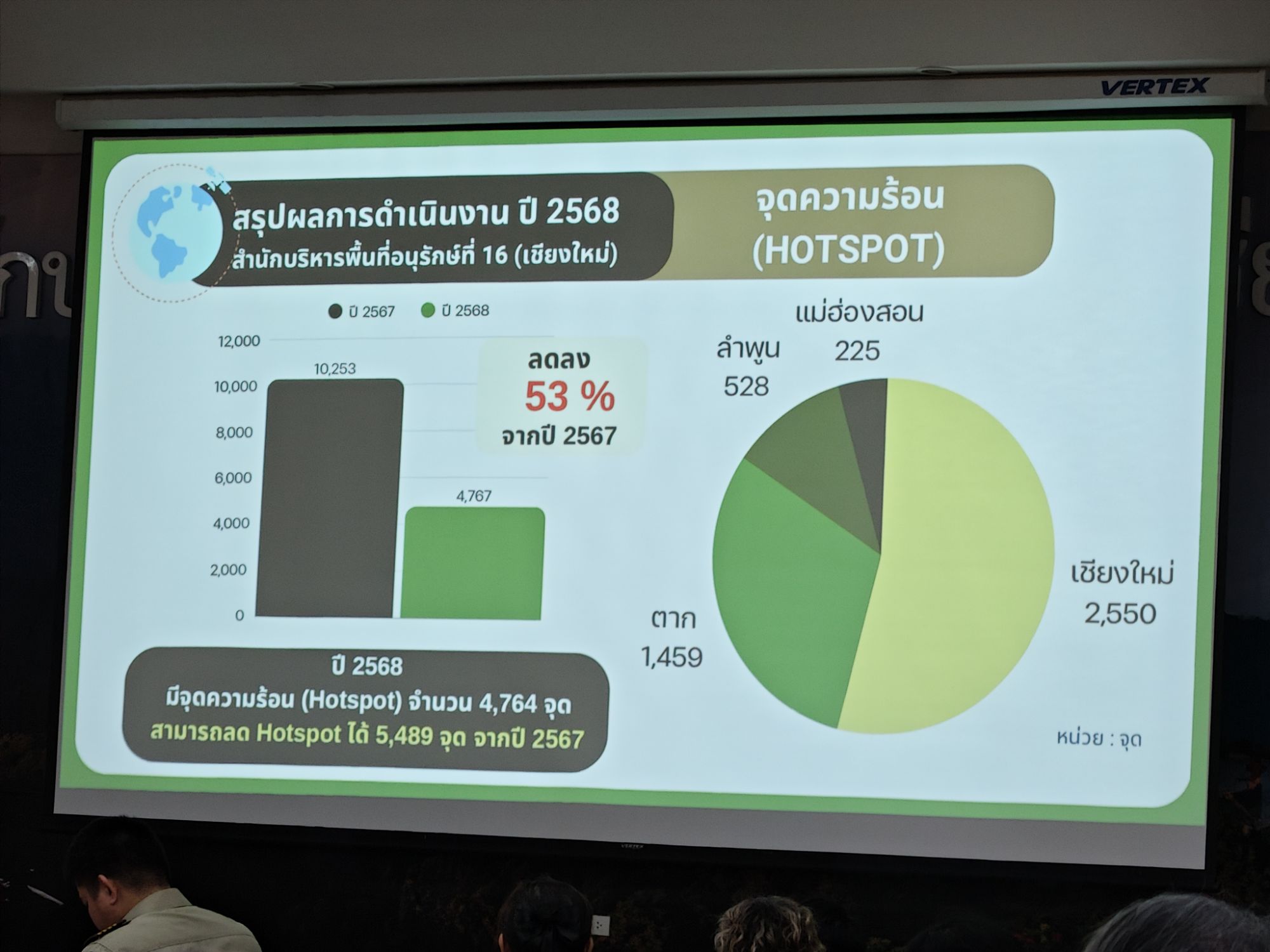 นายสมนึก ท้าวพา ผู้อำนวยการส่วนควบคุมและปฏิบัติการไฟป่า รายงานถึงสถานการณ์ไฟป่าในปี 2568 และแผนการรับมือปี 2569 ว่า ในปี 2568 ว่า สบอ.16 (เชียงใหม่) รับผิดชอบพื้นที่ป่าอนุรักษ์รวมทั้งสิ้น 7,824,062 ไร่ อยู่ในพื้นที่ 5 จังหวัด ได้แก่ จ.เชียงใหม่ ซึ่งมากสุด 69.7% ลำพูน 10.6% ตาก 9.6% แม่ฮ่องสอน 9% และ จ.เชียงราย อีก 1.1% ผลการดำเนินงานในปี 2568 ที่ผ่านมา ในพื้นที่ สบอ.16 (เชียงใหม่) เกิดจุดความร้อน (Hotspot) จำนวน 4,764 จุด ลดลง 5,489 จุด จากปี 2567 ซึ่งเกิดในพื้นที่จำนวน 10253 จุด ลดลงราว 53% ส่วนพื้นที่เผาไหม้ (Burn Scars) ปี 2568 มีพื้นที่เผาไหม้ 770,557.83 ไร่ สามารถลดพื้นที่เผาไหม้ลงจากปี 2567 ได้ 456,879.69 ไร่ หรือลดลงราว 37% จากปี 2567