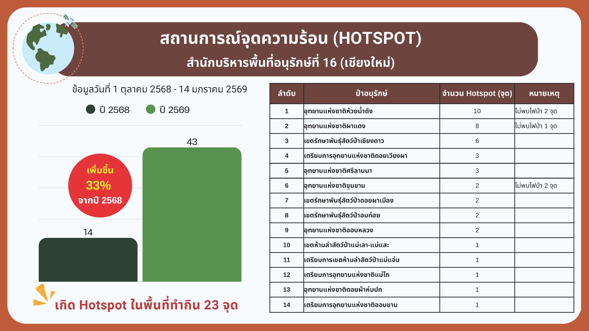 ปัญหาไฟป่า 2569 ยกเป็นวาระของ สบอ.16 “ผอ.กริชสยาม” ย้ำทุกคนต้องจริงจังกับการแก้ปัญหา แผน “ชิงเผา” ต้องทำเท่าที่จำเป็น ทำให้น้อยที่สุด เผยกรมอุทยานฯ ตั้งเป้าลด Burn Scar ลง 40% Hot Spot ต้องลดลงต่อเนื่อง เผยผลดำเนินการปี 2568 Hot Spot ลดลง 53% พื้นที่เผาไหม้ลด 37%