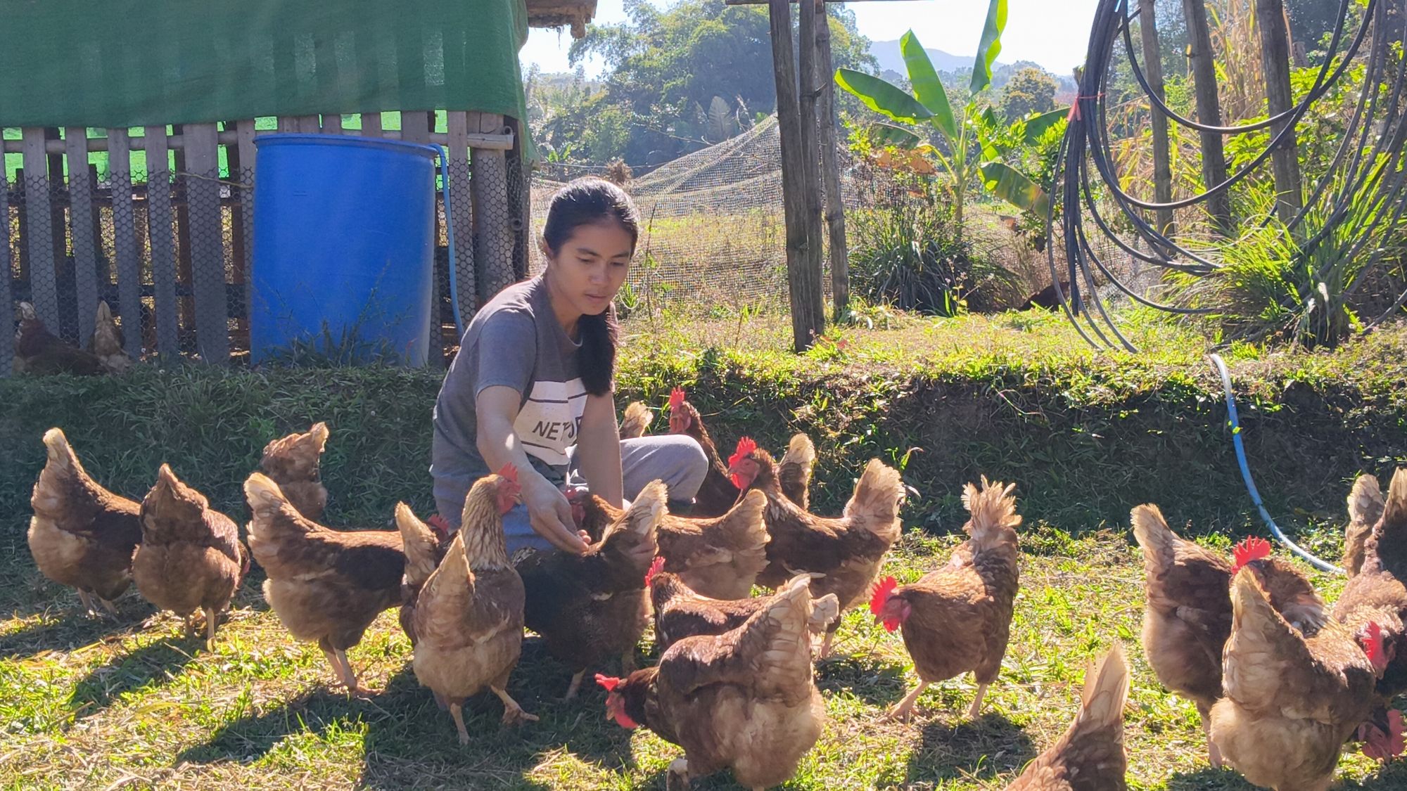 ไก่ไข่อารมณ์ดี เปิดเพลงกินเม็ดกัญชง กากงา และแหนแดง ปล่อยอาบแดด ผลงานวิจัยของสวพส. อ.แม่จริม จ.น่าน เลี้ยงแบบไม่เครียดในเล้าที่ไม่แออัด ไม่เกิน 70 ตัว ออกไข่ทุกเช้าไม่ว่าอากาศจะหนาว 50-60 ฟองต่อวัน