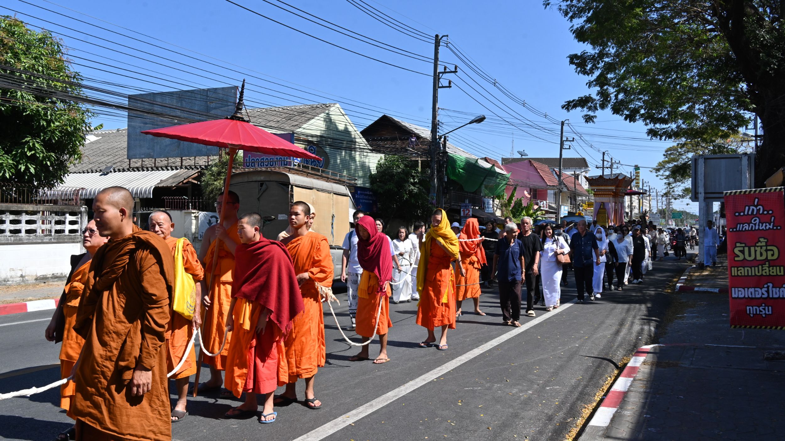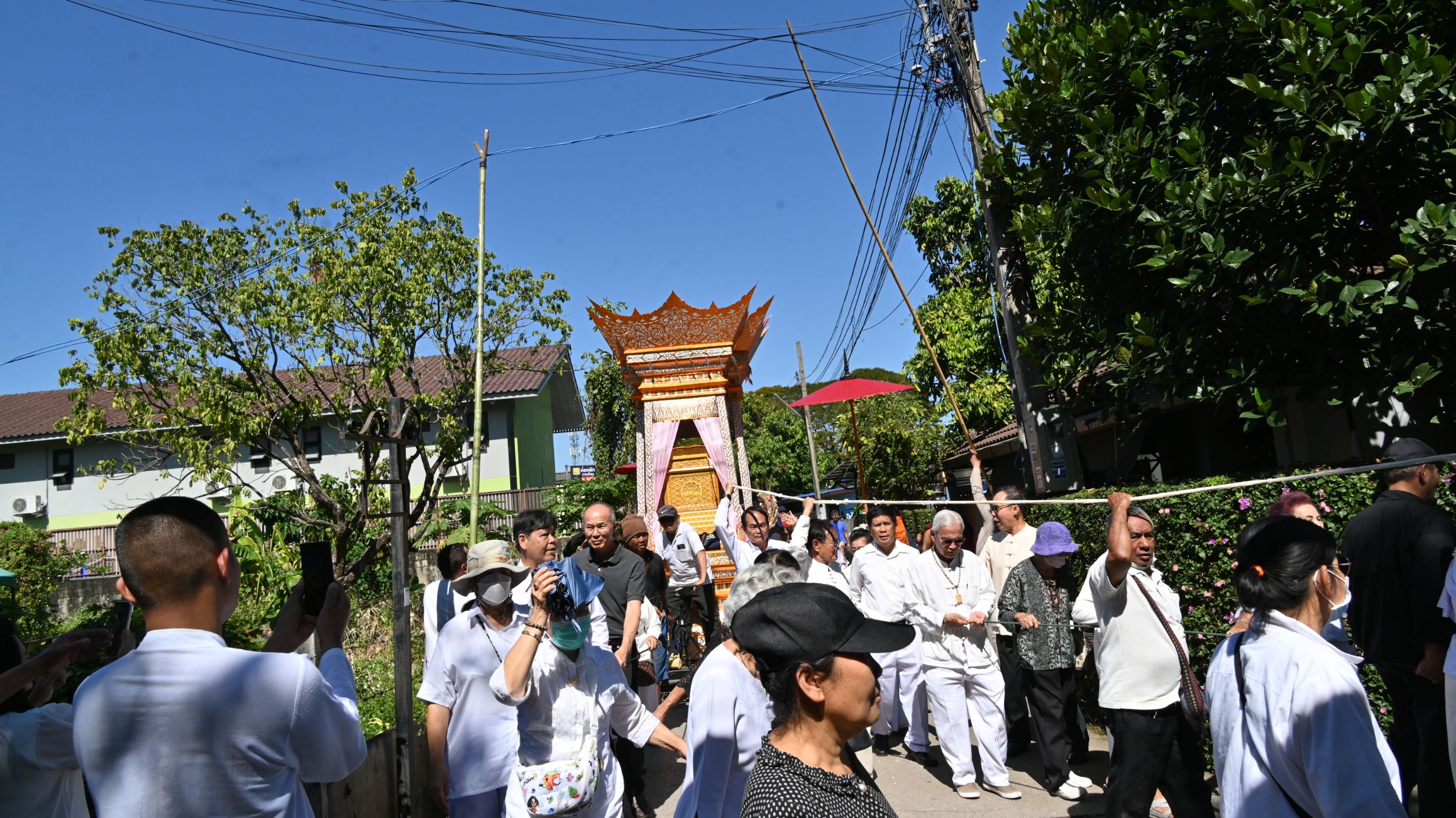 ภายหลังเสร็จสิ้นพิธีทางสงฆ์ ได้มีการอัญเชิญสรีรสังขารพระครูสุมงคลรัตลงจากวิหาร แห่เวียนรอบวิหารจำนวน 1 รอบ ก่อนเคลื่อนขบวนออกทางหน้าวัดสู่ถนนหลวง จากนั้นเลี้ยวซ้ายเข้าสู่วัดบวกครก และอัญเชิญขึ้นตั้ง ณ มณฑปปราสาทสุวรรณหงส์ ซึ่งจัดเตรียมไว้อย่างวิจิตรบรรจง สง่างาม สมฐานานุศักดิ์ของอดีตเจ้าอาวาสผู้เป็นที่เคารพรักของสาธุชน