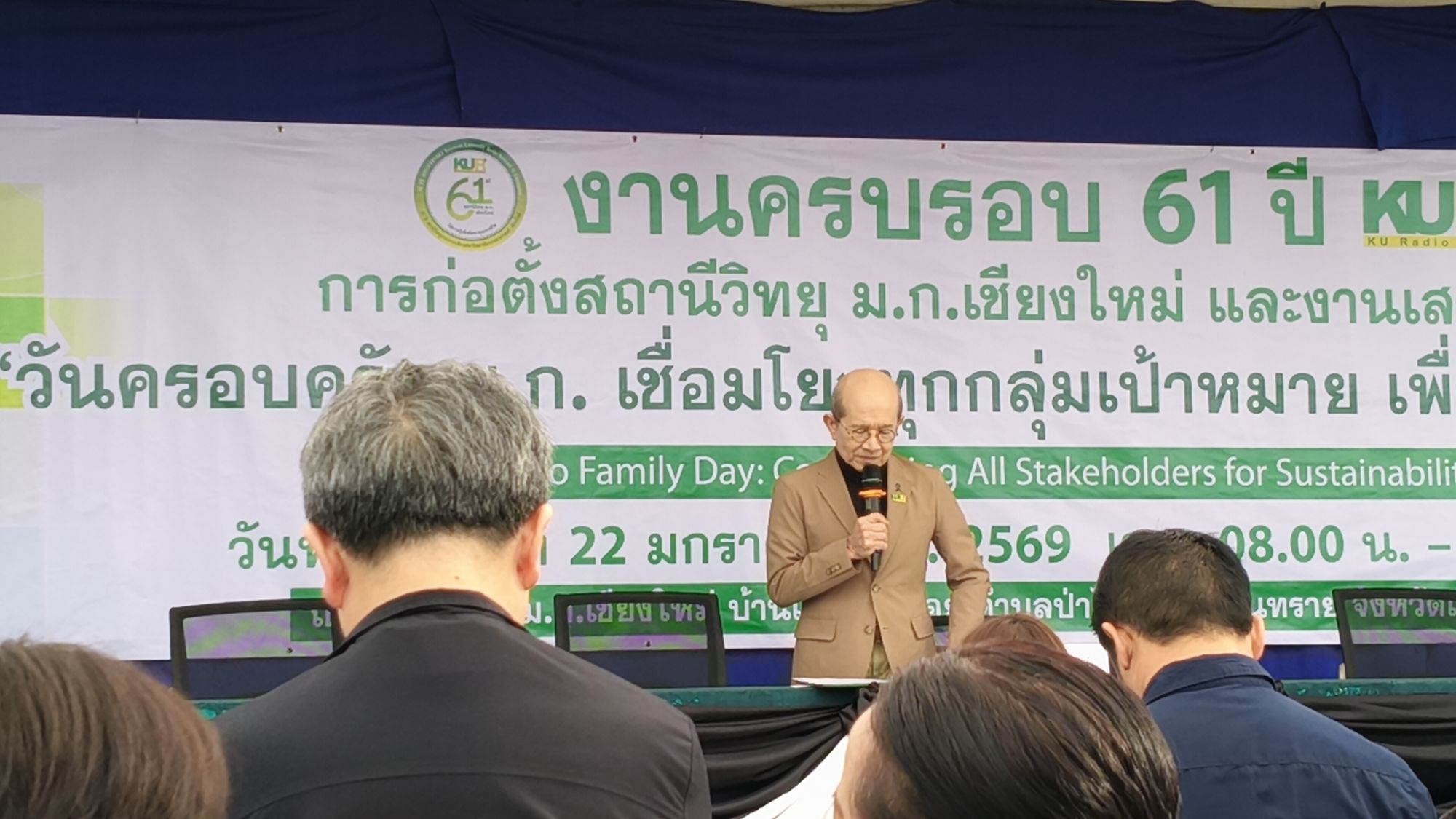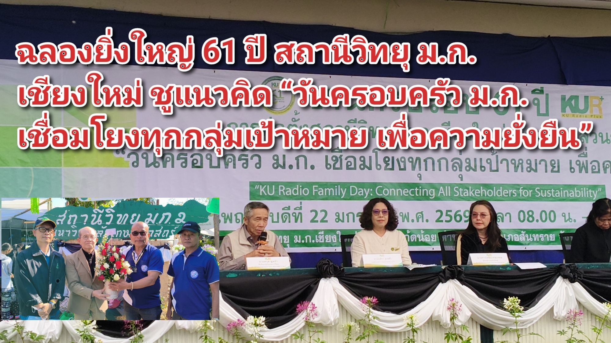 เมื่อวันที่ 22 ม.ค.69 สถานีวิทยุกระจายเสียงมหาวิทยาลัยเกษตรศาสตร์ จังหวัดเชียงใหม่ (สถานีวิทยุ ม.ก. เชียงใหม่) จัดงานเฉลิมฉลองเนื่องในโอกาสครบรอบ 61 ปี แห่งการก่อตั้ง ในวันพฤหัสบดีที่ 22 มกราคม ณ ที่ทำการสถานีวิทยุ ม.ก. เชียงใหม่ บ้านแม่แก้ดน้อย ต.ป่าไผ่ อ.สันทราย จ.เชียงใหม่ ภายใต้ชื่องาน “วันครอบครัว ม.ก. เชื่อมโยงทุกกลุ่มเป้าหมาย เพื่อความยั่งยืน” หรือ “KU Radio Family Day: Connecting All Stakeholders for Sustainability” เพื่อตอกย้ำบทบาทการเป็นสื่อกลางศาสตร์แห่งแผ่นดินที่รับใช้สังคมมาอย่างยาวนาน
