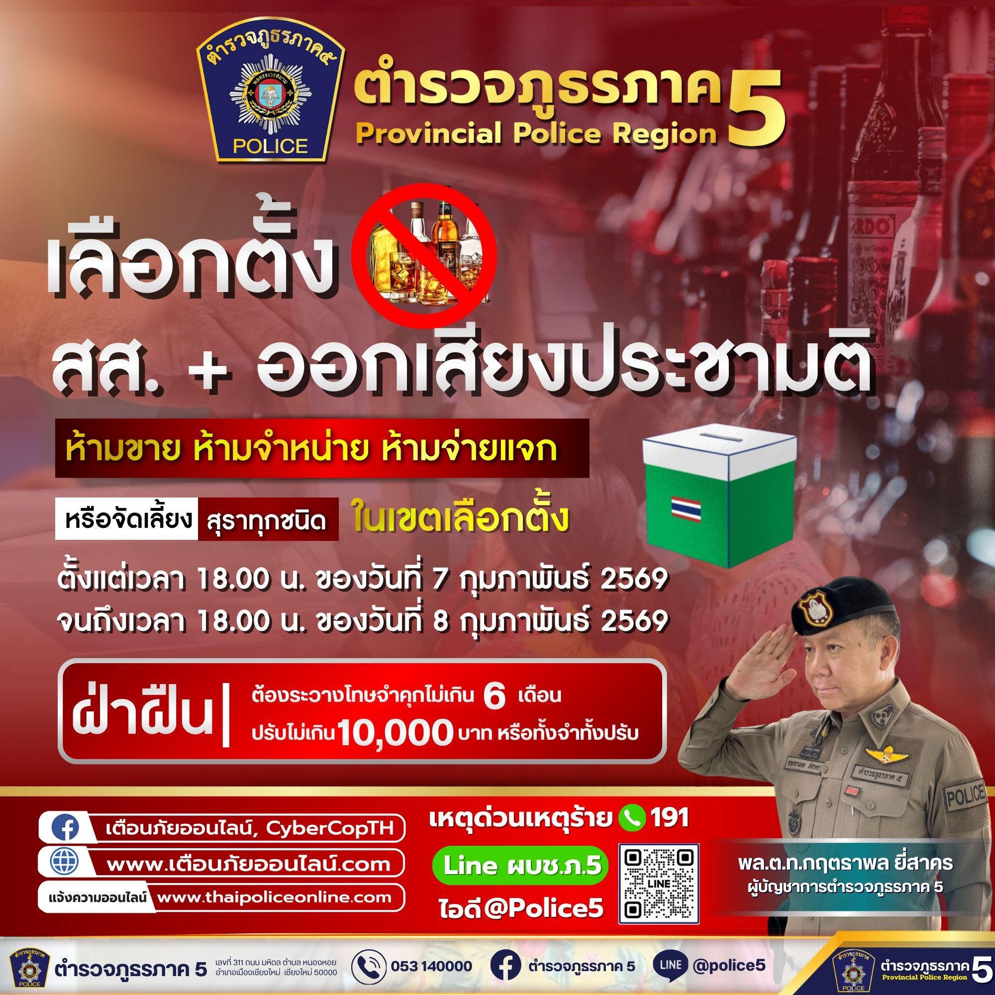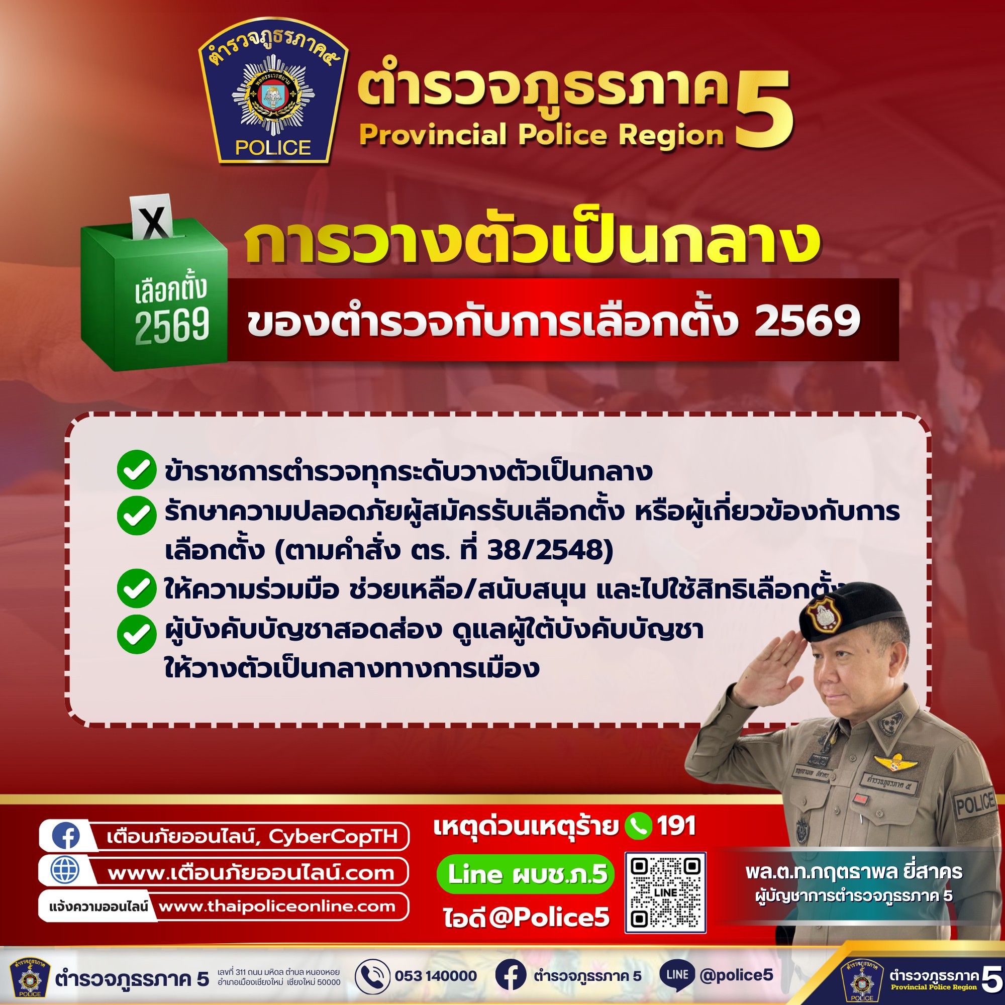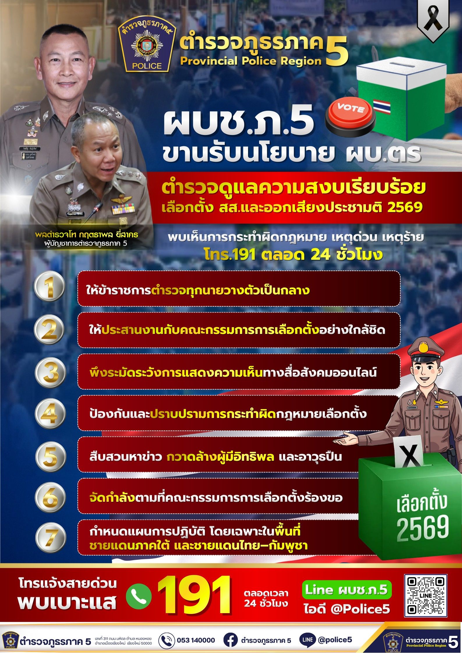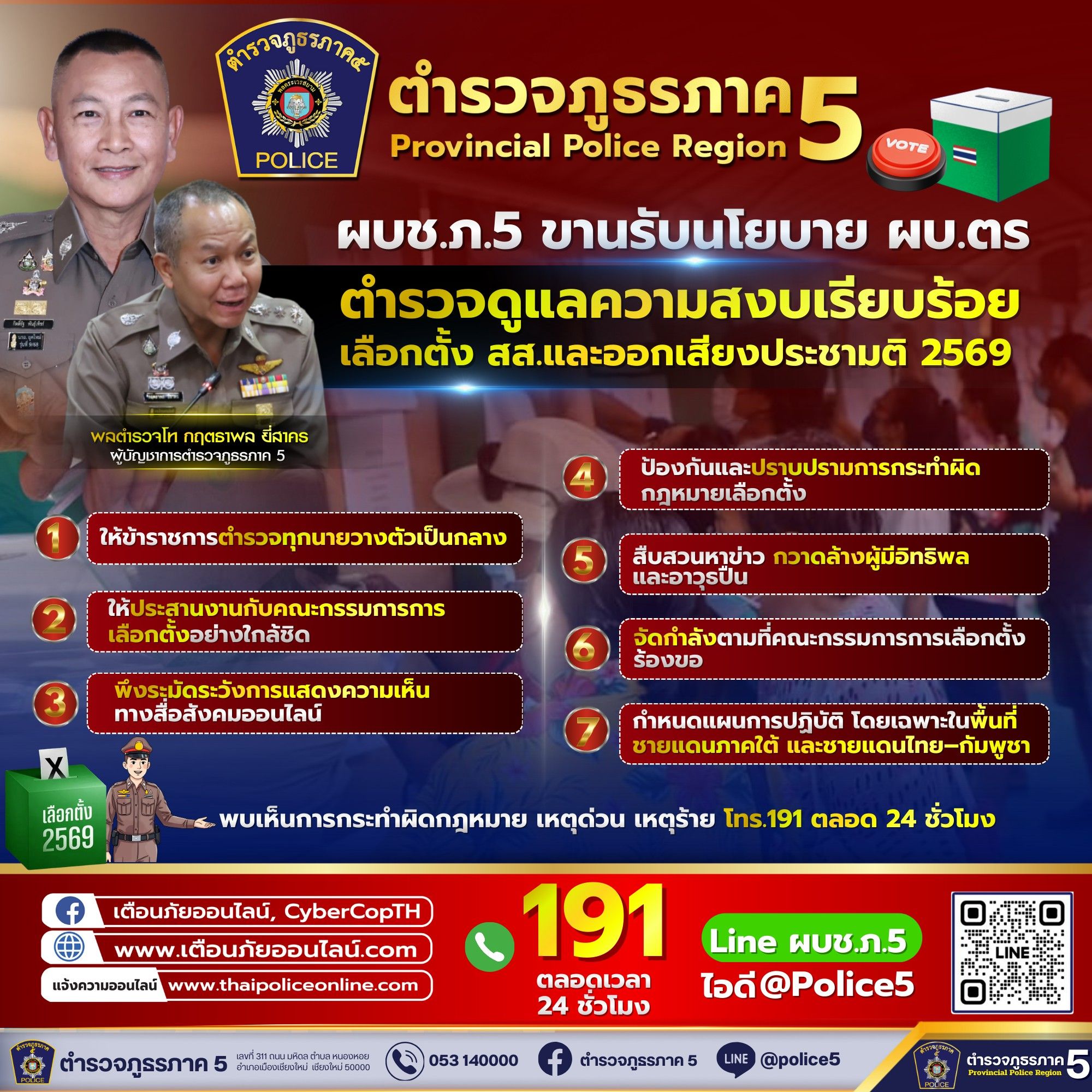 ผบช.ภ.5 ขานรับตามข้อสั่งการ พล.ต.อ.กิตติ์รัฐ พันธุ์เพ็ชร์ ผู้บัญชาการตำรวจแห่งชาติ กำชับ “ตำรวจ” ดูแลความปลอดภัย สงบเรียบร้อยการเลือกตั้ง สส. และออกเสียงประชามติ 2569