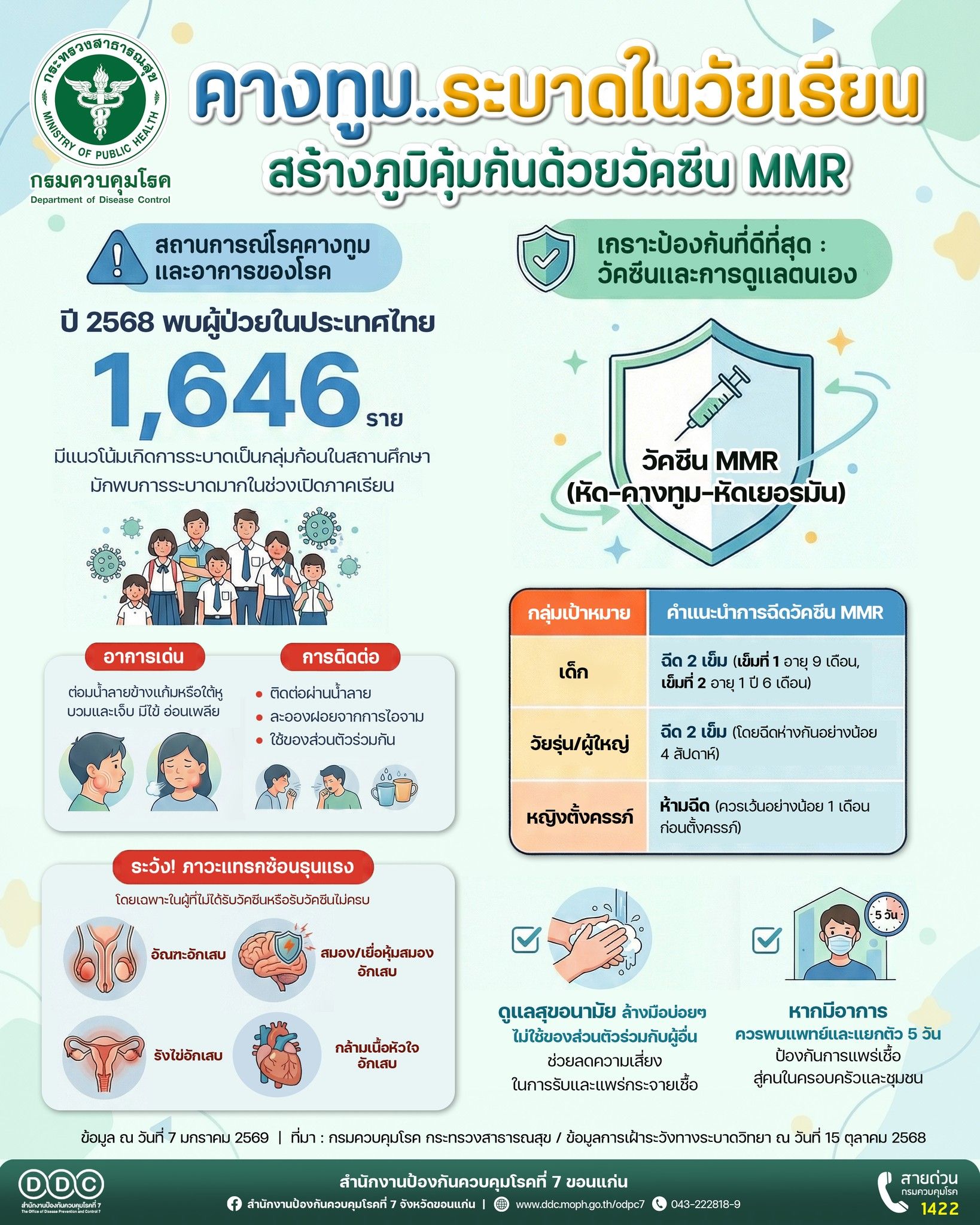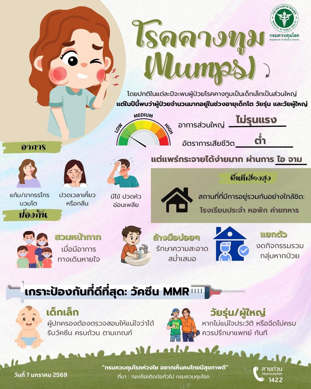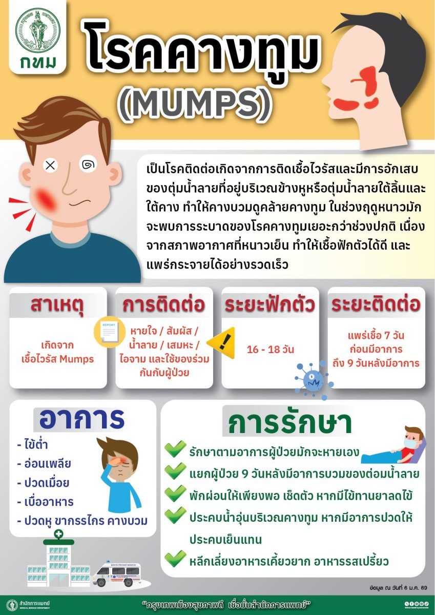 โดยข้อมูลการเฝ้าระวังทางระบาดวิทยา ณ วันที่ 15 ตุลาคม 2568 พบผู้ป่วยโรคคางทูมในประเทศไทย จำนวนกว่า 1,646 ราย อัตราป่วยประมาณ 2.5 ต่อประชากรแสนคน แม้ยังไม่พบรายงานผู้เสียชีวิต แต่มีแนวโน้มเกิดการระบาดเป็นกลุ่มก้อนในสถานศึกษา และพื้นที่ที่มีการสัมผัสใกล้ชิด ซึ่งโรคคางทูมเกิดจากเชื้อไวรัส ติดต่อผ่านน้ำลายและละอองฝอยจากการไอ จาม หรือการใช้สิ่งของร่วมกัน ผู้ป่วยมักมีอาการไข้ อ่อนเพลีย และมีลักษณะเด่นคือ ต่อมน้ำลายบริเวณข้างแก้มหรือใต้หูบวม และมีอาการเจ็บ โดยบางรายอาจมีภาวะแทรกซ้อน เช่น อัณฑะอักเสบ รังไข่อักเสบ กล้ามเนื้อหัวใจอักเสบ และสมอง/เยื่อหุ้มสมองอักเสบ โดยเฉพาะในผู้ที่ไม่ได้รับวัคซีนหรือรับวัคซีนไม่ครบ