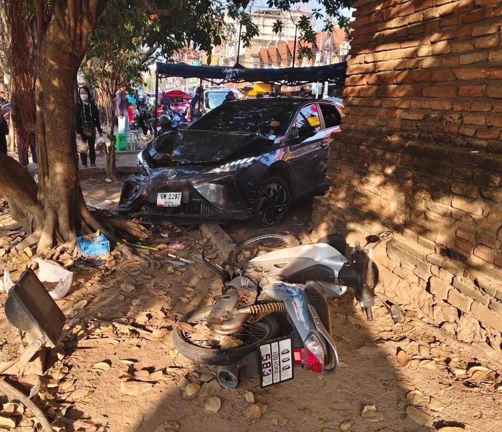 เมื่อเวลา 07.40 น. วันที่ 28 มกราคม 2569 เกิดอุบัติเหตุระทึกขวัญบริเวณหน้าตลาดประตูเชียงใหม่ เมื่อรถยนต์เก๋งแกร็บซึ่งบรรทุกผู้โดยสารชาวต่างชาติมา 2 คน เสียหลักพุ่งปีนขึ้นฟุตบาทก่อนจะพุ่งเข้าชนร้านขายน้ำเต้าหู้ริมทางอย่างรุนแรง แรงกระแทกส่งผลให้แม่ค้าน้ำเต้าหู้ถูกชนจนได้รับบาดเจ็บสาหัสทันทีในที่เกิดเหตุ นอกจากนี้ยังมีรายงานว่าผู้โดยสารชาวต่างชาติ 1 ใน 2 รายที่นั่งมาในรถได้รับบาดเจ็บสาหัสจนอยู่ในอาการโคม่าและไม่รู้สึกตัว ทำให้เจ้าหน้าที่กู้ชีพต้องเร่งเข้าทำการ CPR ปั๊มหัวใจเพื่อยื้อชีวิตกลางที่เกิดเหตุก่อนนำตัวส่งโรงพยาบาลเป็นการด่วน ส่วนผู้บาดเจ็บรายอื่น ๆ เจ้าหน้าที่กำลังอยู่ระหว่างการประเมินอาการและให้การช่วยเหลือเบื้องต้น ทั้งนี้เจ้าหน้าที่ตำรวจได้ลงพื้นที่ตรวจสอบที่เกิดเหตุและเตรียมสอบสวนคนขับรถแกร็บอย่างละเอียด เพื่อสรุปสาเหตุที่แท้จริงของอุบัติเหตุในครั้งนี้ต่อไป.