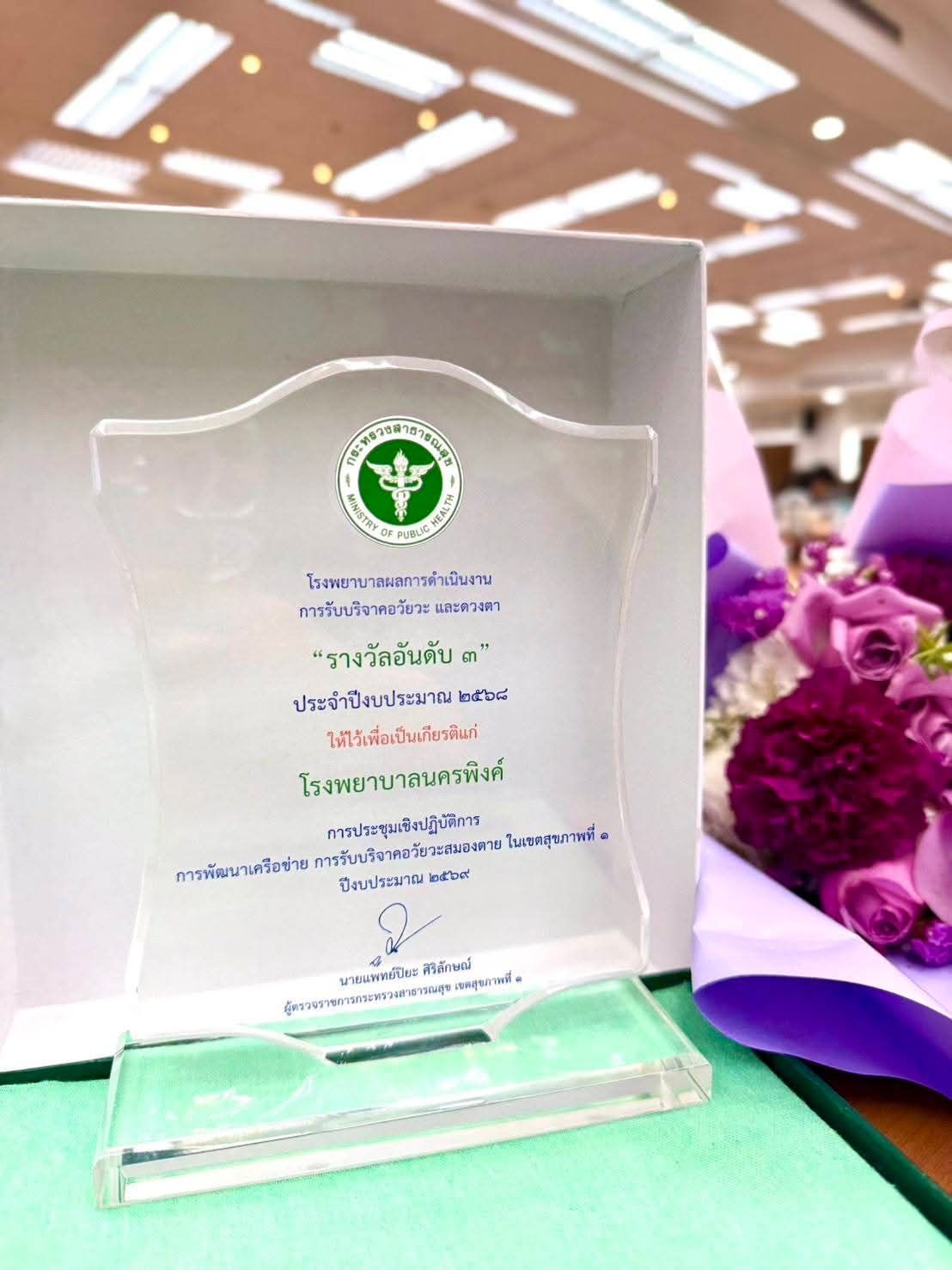 ในการนี้ โรงพยาบาลนครพิงค์ ได้รับรางวัล โรงพยาบาลที่มีผลการปฏิบัติงานดีเด่น ด้านการรับบริจาคอวัยวะและดวงตา อันดับที่ 3 เขตสุขภาพที่ 1 โดยมี นพ.ประพนธ์ เปี่ยมอนันต์ ประธาน Service plan สาขารับบริจาคและปลูกถ่ายอวัยวะ โรงพยาบาลนครพิงค์ และคณะขึ้นรับมอบ