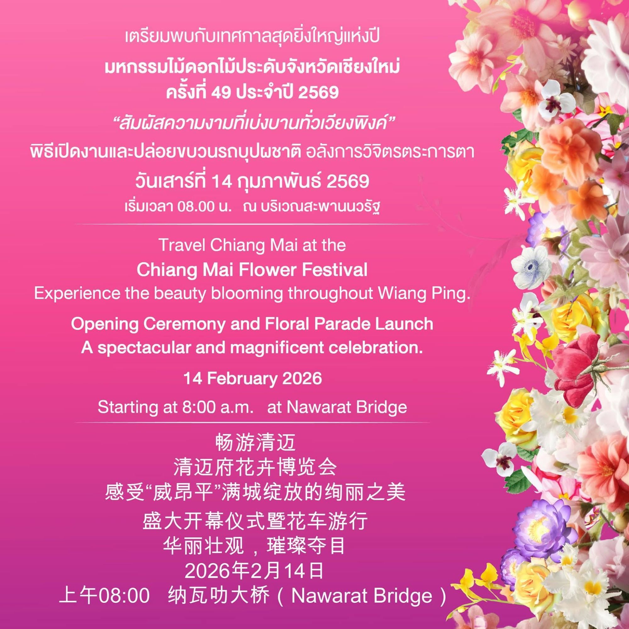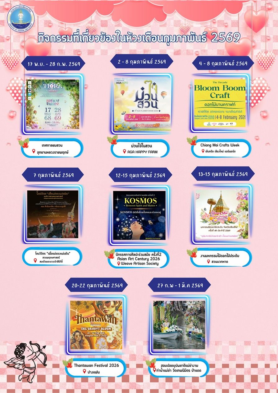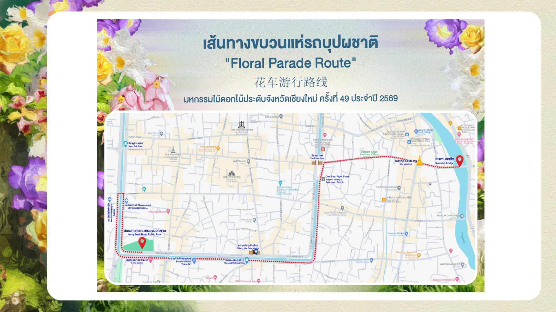 ทั้งนี้ จังหวัดเชียงใหม่ขอเชิญชวนนักท่องเที่ยวและประชาชน ร่วมสัมผัสความงดงามของดอกไม้ที่บานสะพรั่ง และมนต์เสน่ห์แห่งศิลปวัฒนธรรมล้านนา ในงานมหกรรมไม้ดอกไม้ประดับจังหวัดเชียงใหม่ ครั้งที่ 49 ระหว่างวันที่ 13 – 15 กุมภาพันธ์ 2569 ณ สวนสาธารณะหนองบวกหาด.
