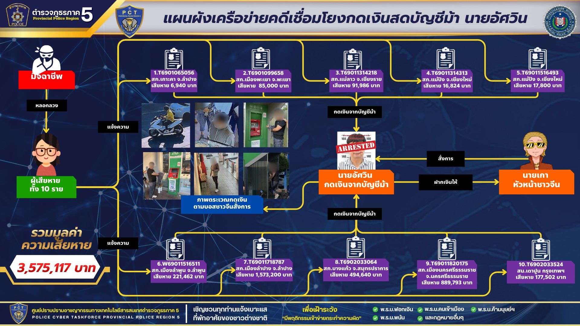 ตำรวจ PCT ภาค 5 ภายใต้การอำนวยการของ พล.ต.ท.กฤตธาพล ยี่สาคร ผบช.ภาค 5 พร้อมคณะผู้บังคับบัญชา แถลงผลการจับกุมนายอัศวิน (สงวนนามสกุล) ผู้ต้องหารายสำคัญที่ทำหน้าที่เป็น “มือถอนเงิน” ให้กับขบวนการแก๊งคอลเซ็นเตอร์ข้ามชาติ โดยเจ้าหน้าที่ชุดสืบสวน ศปอส.ภ.5 ได้แกะรอยจนพบตัวผู้ต้องสงสัยขณะกำลังถอนเงินสดจากตู้ ATM ภายในปั๊มน้ำมันแห่งหนึ่งในพื้นที่อำเภอสันทราย จังหวัดเชียงใหม่ จึงแสดงตัวเข้าตรวจค้นและจับกุมได้พร้อมของกลางเงินสด 49,900 บาท รวมถึงโทรศัพท์มือถือที่ใช้ติดต่อสื่อสารกับกลุ่มอาชญากร