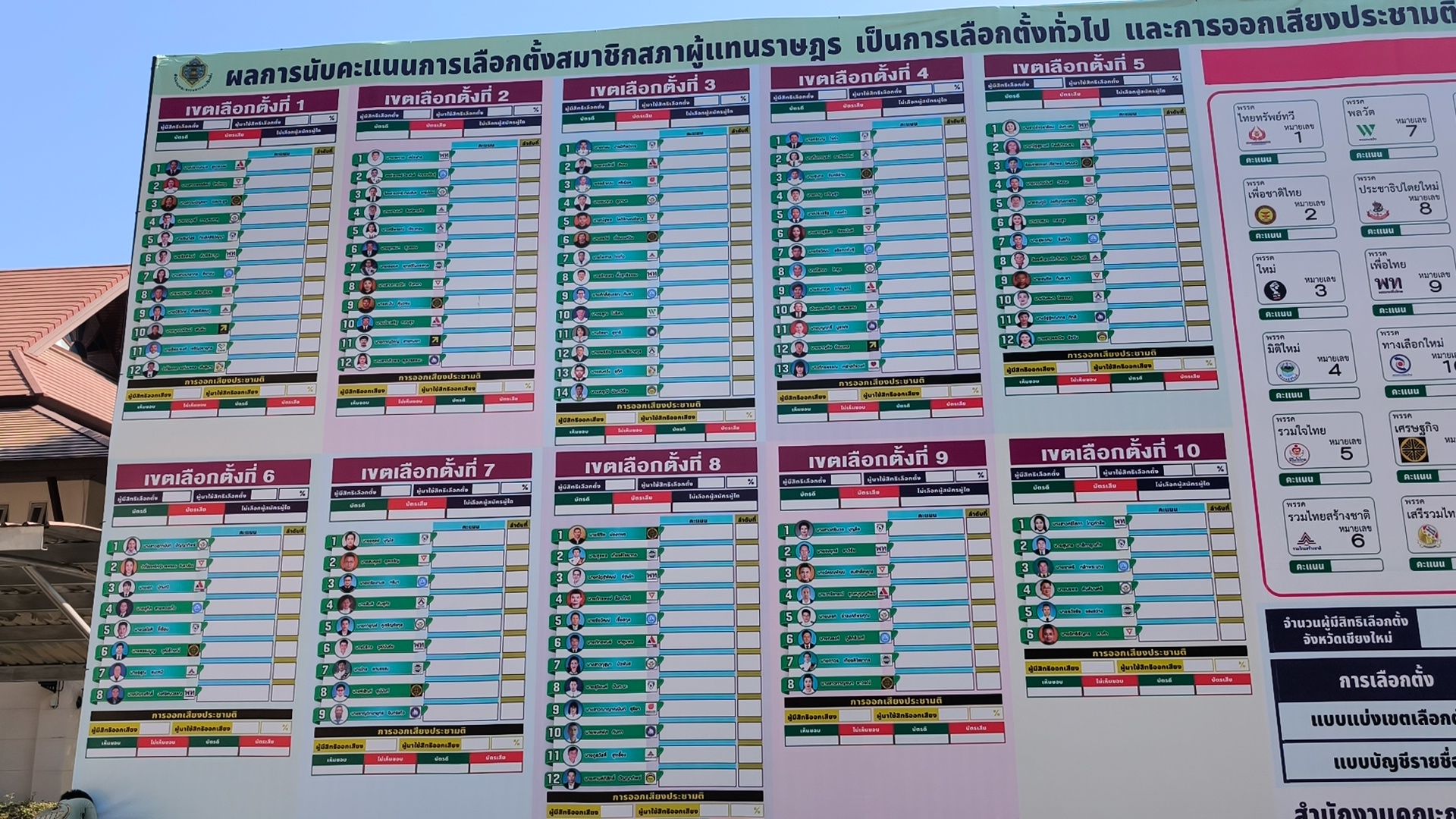 ที่สำนักงานคณะกรรมการการเลือกตั้งประจำจังหวัดเชียงใหม่ ได้ติดตั้งป้ายแสดงผลการเลือกตั้งสมาชิกสภาผู้แทนทั้ง 10 เขตมีภาพผู้สมัคร เบอร์ และชื่อของผู้สมัครรับเลือกตั้งทุกคน ผลการลงคะแนนของพรรคการเมืองทุกพรรคแบบบัญชีรายชื่อ และผลการเลือกตั้งลงคะแนนประชามติ ขนาดใหญ่ติดตั้งไว้ด้านข้างสำนักงาน เพื่อให้ผู้ที่สนใจเข้าติดตามผลการเลือกตั้งสมาชิกสภาพผู้แทนราษฎรของจังหวัดเชียงใหม่ แบบเรียวไทม์