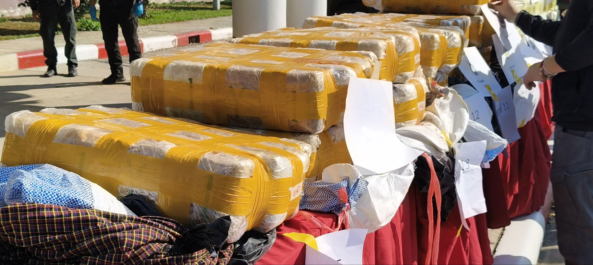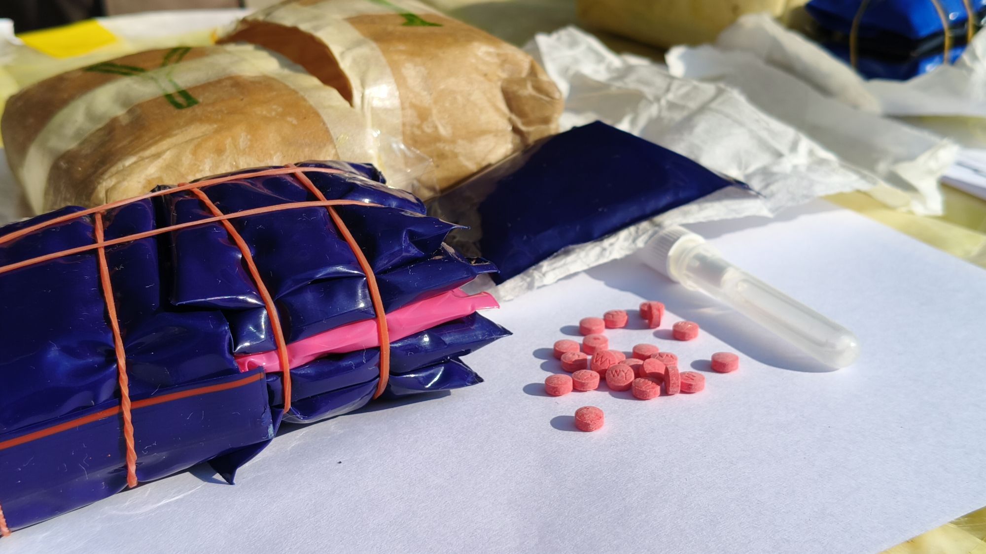 จากการตรวจสอบท้ายรถกระบะ พบกระสอบจำนวน 15 กระสอบ ซุกซ่อนอยู่ภายใต้ผ้าใบสีดำ ภายในบรรจุยาเสพติดให้โทษประเภท 1 (ยาบ้า) ลักษณะเม็ดกลมแบนสีส้มและสีเขียวปนกัน ด้านหนึ่งเรียบและอีกด้านหนึ่งประทับตรา WY ห่อด้วยถุงพลาสติกชนิดกดปิดดึงเปิดสีน้ำเงินและหุ้มด้วยกระดาษสา รวมจำนวนทั้งสิ้นประมาณ 3,000,000 เม็ด เจ้าหน้าที่จึงได้ทำการตรวจยึดของกลางทั้งหมดเพื่อดำเนินคดีและขยายผลหาผู้กระทำผิดต่อไป.