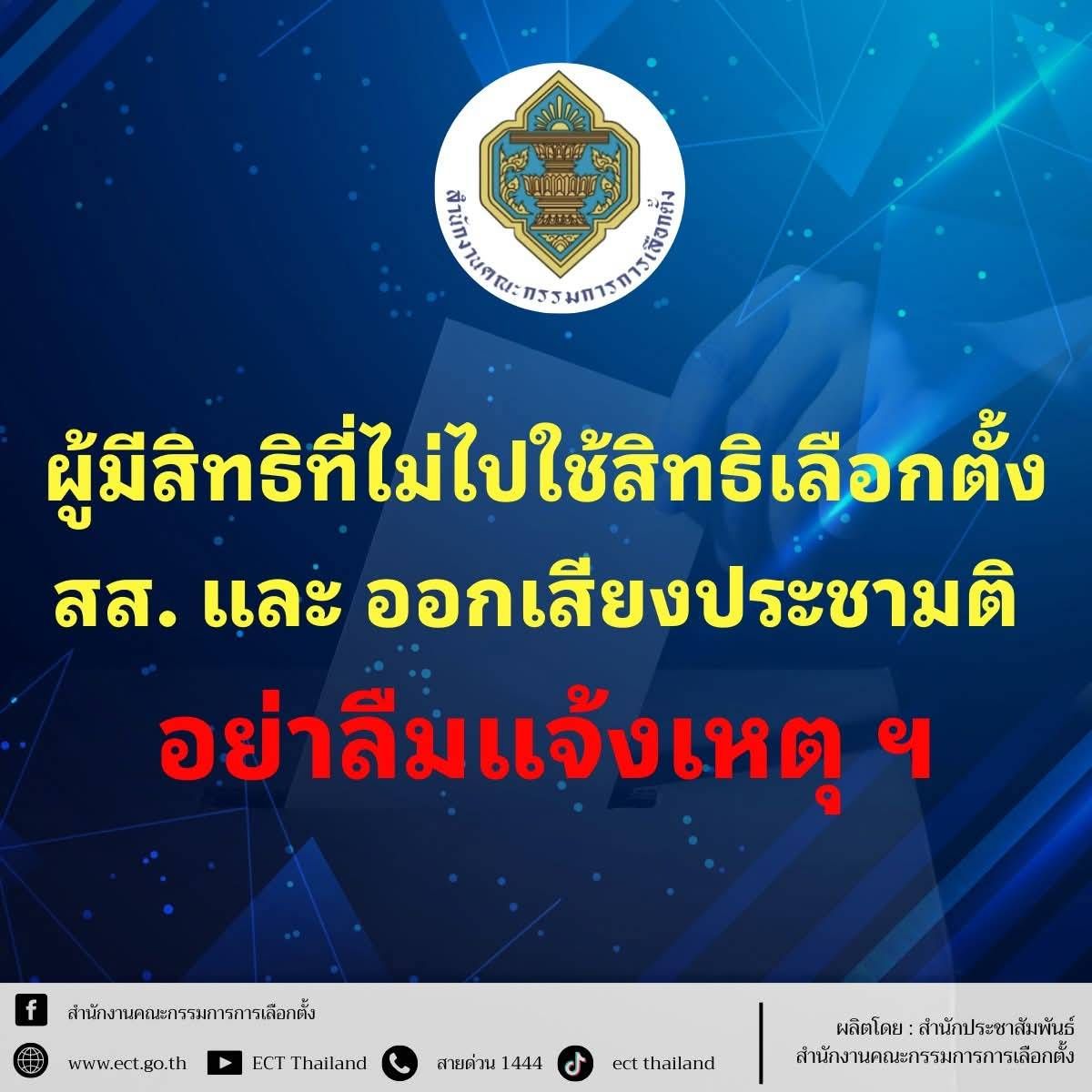 สำนักงานคณะกรรมการการเลือกตั้ง ขอประชาสัมพันธ์ให้ผู้มีสิทธิเลือกตั้ง สส. และออกเสียงประชามติ ที่ไม่สามารถไปใช้สิทธิเมื่อวันอาทิตย์ที่ 8 กุมภาพันธ์ 2569 สามารถแจ้งเหตุที่ไม่อาจไปใช้สิทธิ ระหว่างวันที่ 9 – 15 กุมภาพันธ์ 2569 โดยดำเนินการดังนี้