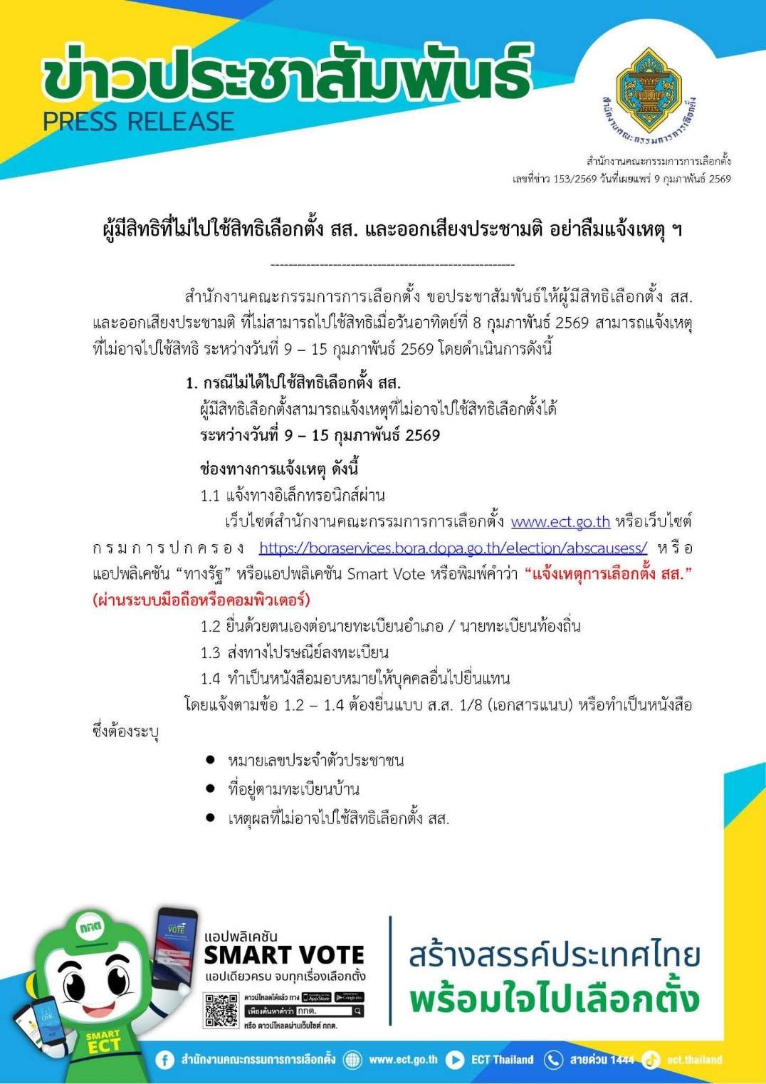 สำนักงานคณะกรรมการการเลือกตั้งเผยแพร่ข่าวเลขที่ 153/2569 วันที่ 9 กุมภาพันธ์ 2569 ผู้มีสิทธิที่ไม่ไปใช้สิทธิเลือกตั้ง สส. และออกเสียงประชามติ อย่าลืมแจ้งเหตุ ฯ