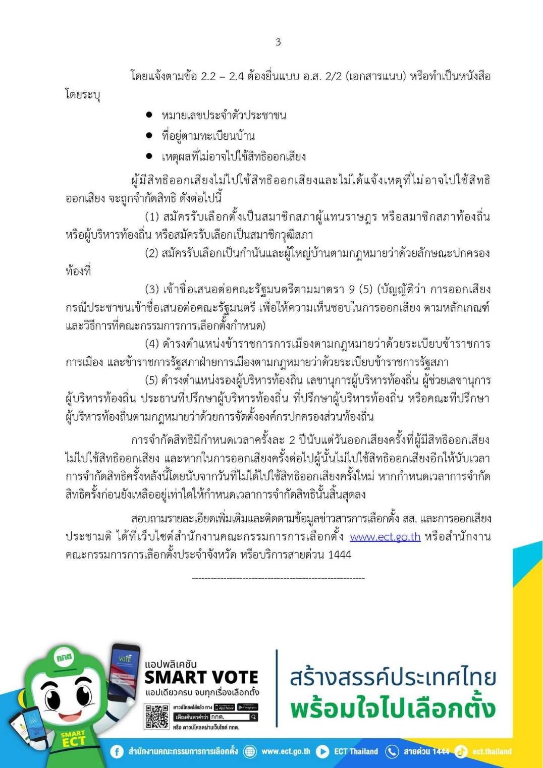สอบถามรายละเอียดเพิ่มเติมและติดตามข้อมูลข่าวสารการเลือกตั้ง สส. และการออกเสียงประชามติ ได้ที่เว็บไซต์สำนักงานคณะกรรมการการเลือกตั้ง www.ect.go.th หรือสำนักงานคณะกรรมการการเลือกตั้งประจำจังหวัด หรือบริการสายด่วน 1444.