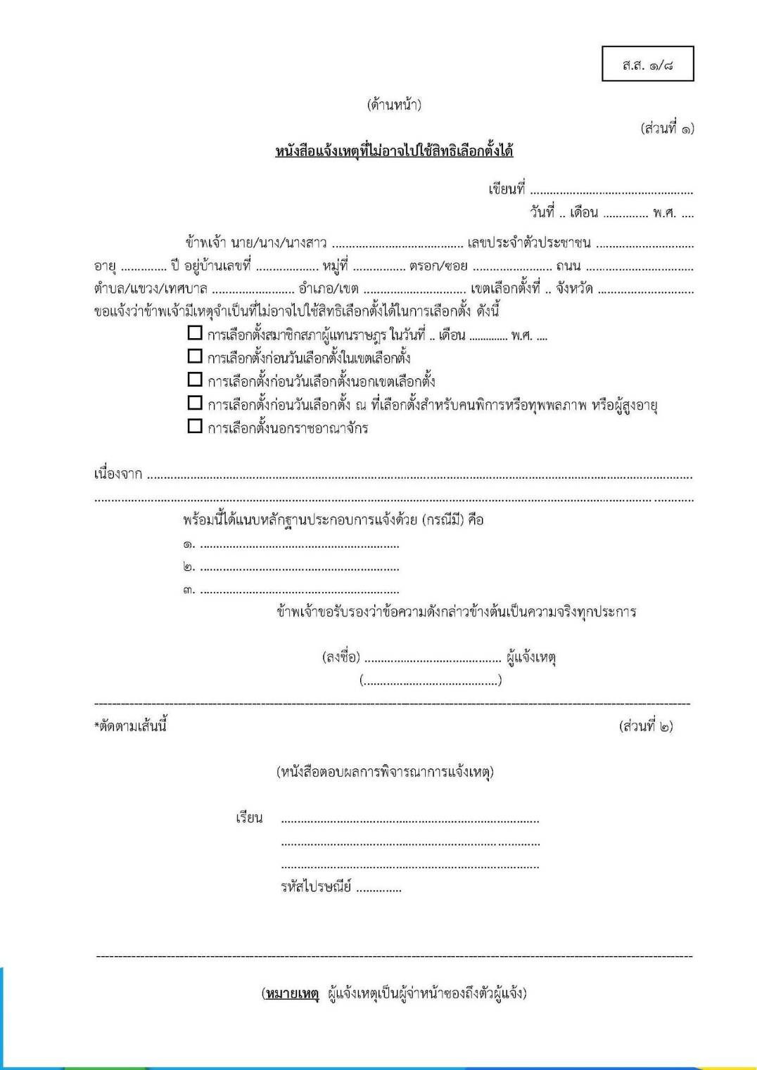 โดยแจ้งตามข้อ 1.2 – 1.4 ต้องยื่นแบบ ส.ส. 1/8 (เอกสารแนบ) หรือทำเป็นหนังสือ ซึ่งต้องระบุ