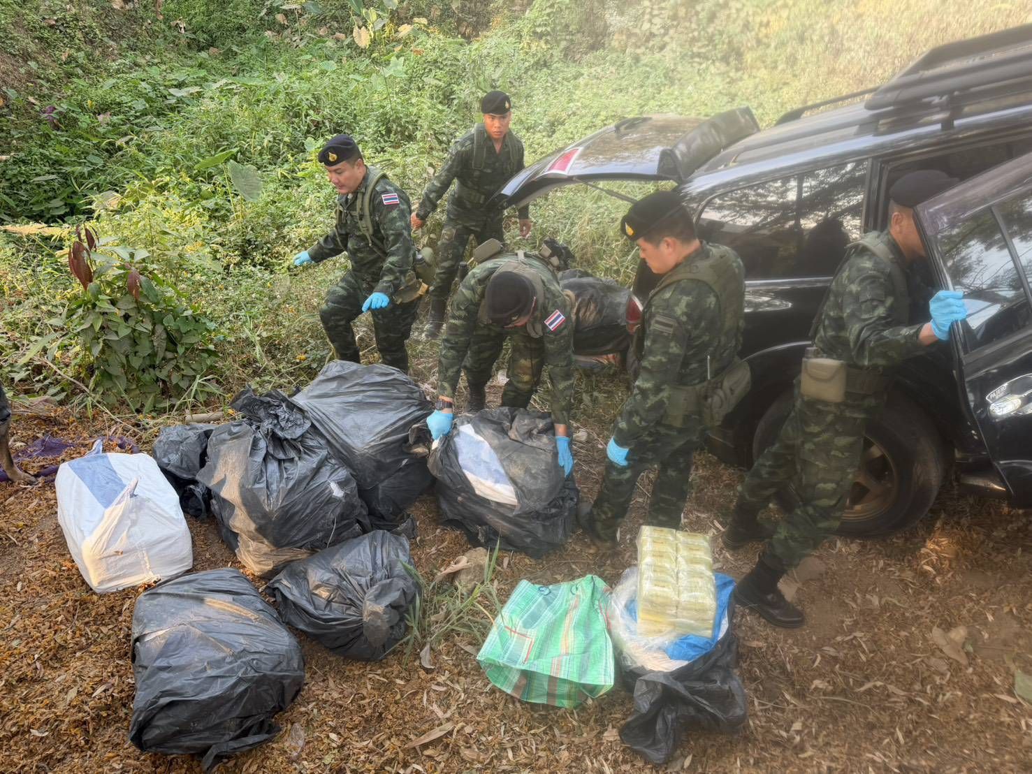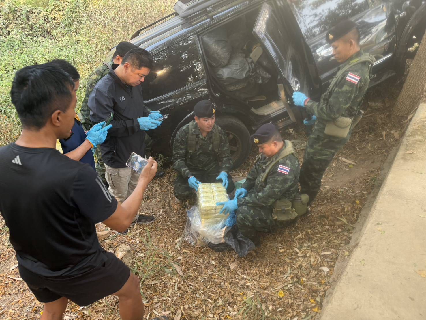 เมื่อวันที่ 9 กุมภาพันธ์ 2569 เวลา 01.00 น. กองกำลังผาเมือง โดย กองร้อยทหารม้าที่ 3 หน่วยเฉพาะกิจทัพเจ้าตาก จัดกำลังพล จำนวน 1 ชุดปฏิบัติการ ร่วมกับ ชุดปฏิบัติการกองร้อยเคลื่อนที่เร็ว กองกำลังผาเมือง, ชุดสุนัขทหารที่ 10 กองกำลังผาเมือง ทำการเฝ้าตรวจเพื่อป้องกันและสกัดกั้นการกระทำผิดตาม พระราชบัญญัติยาเสพติด บริเวณ บ้านเหมืองแดงใต้ หมู่ที่ 1 ตำบลแม่สาย อำเภอแม่สาย จังหวัดเชียงราย ได้ตรวจพบรถยนต์ต้องสงสัย กลับรถกระทันหันก่อนถึงจุดตรวจ ประมาณ 500 เมตร ทำให้รถเสียหลักตกลงไหล่ทางถนน ตรงข้ามหน้า ฐานปฏิบัติการนเรศวร กองบังคับการหมวดทหารม้าที่ 2ฯ หน่วยจึงได้เข้าดำเนินการตรวจสอบรถยนต์คันดังกล่าว ยี่ห้อ มิตซูบิชิ ปาเจโร สีดำ หมายเลขทะเบียน 1 ขฉ 5916 กรุงเทพมหานคร โดยได้ล็อคประตูรถทิ้งไว้ ไม่พบตัวคนขับรถ ต่อมาเมื่อเวลา 08.00 น. หน่วยจึงได้จัดกำลังพล ร่วมกับ สถานีตำรวจภูธรแม่สาย และฝ่ายปกครอง อำเภอแม่สายฯ ร่วมกันตรวจสอบรถยนต์คันดังกล่าว ตรวจพบกระสอบดัดแปลง ภายในบรรจุยาเสพติดให้โทษประเภท 1 (ยาบ้า) กระสอบละ 200,000 เม็ด จำนวน 23 กระสอบ และกระสอบละ 120,000 เม็ด จำนวน 1 กระสอบ รวมจำนวนทั้งสิ้น 4,720,000 เม็ด