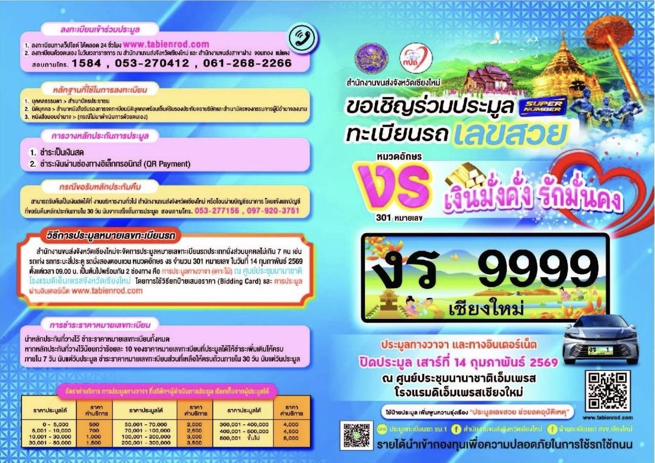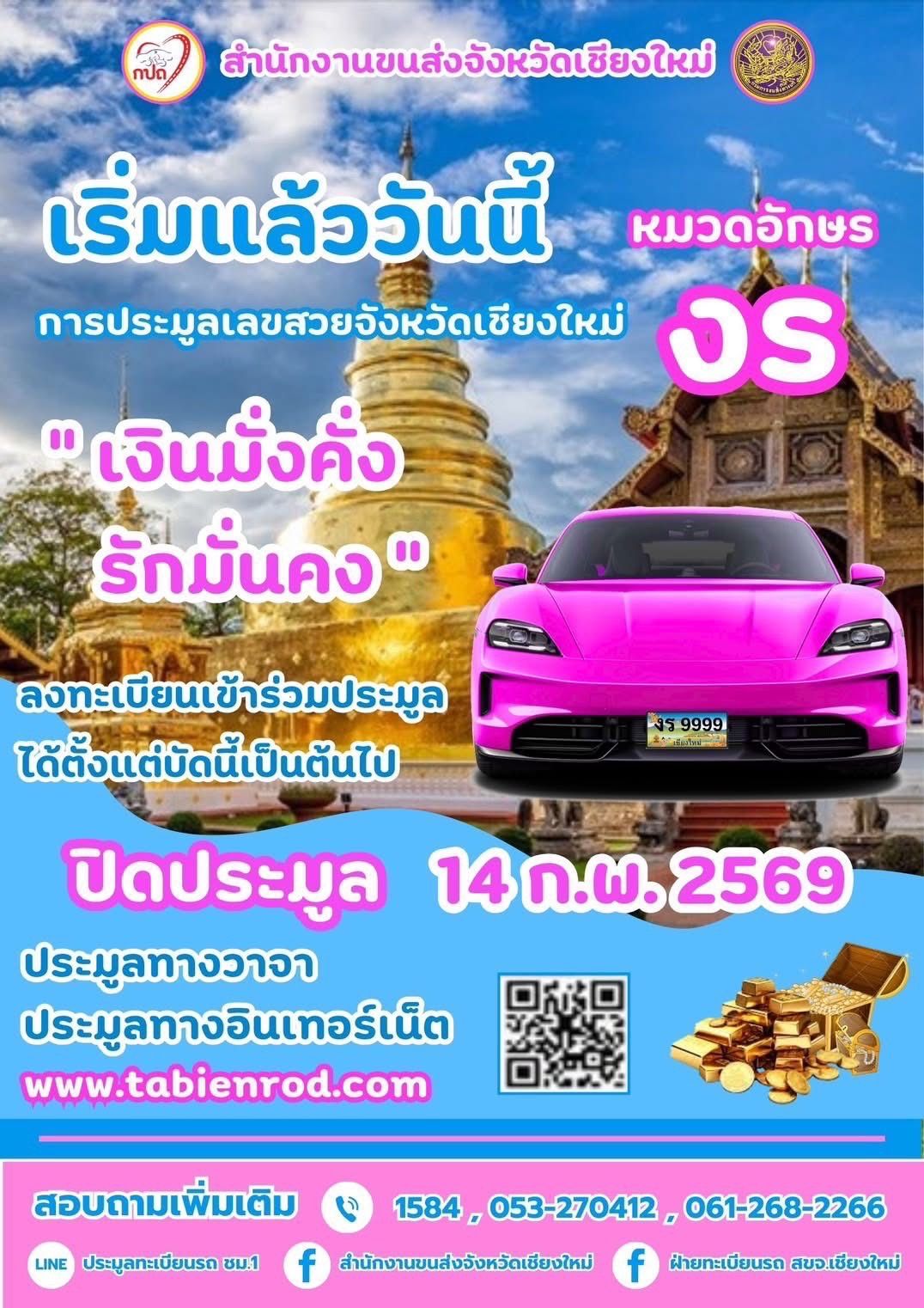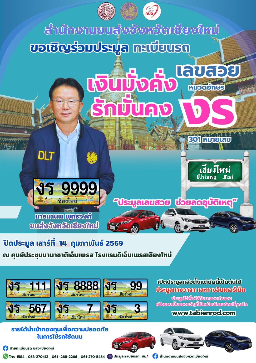 สำนักงานขนส่งจังหวัดเชียงใหม่ เตรียมจัดงานประมูลหมายเลขทะเบียนรถสวยครั้งใหญ่ ครั้งที่ 37 สำหรับรถยนต์นั่งส่วนบุคคลไม่เกิน 7 คน (รถเก๋ง) ใน หมวดอักษร งร ซึ่งมีความหมายอันเป็นมงคลว่า “เงินมั่งคั่ง รักมั่นคง” โดยจะจัดขึ้นในวันเสาร์ที่ 14 กุมภาพันธ์ 2569 ณ ศูนย์ประชุมนานาชาติเอ็มเพรส โรงแรมดิเอ็มเพรส จังหวัดเชียงใหม่ ตั้งแต่เวลา 09.00 น. เป็นต้นไป