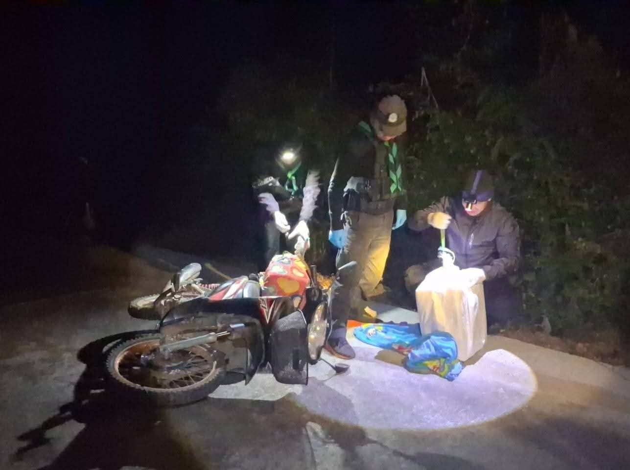 กระทั่งเข้าสู่เช้ามืดของวันที่ 11 กุมภาพันธ์ 2569 เวลาประมาณ 05.00 น. เจ้าหน้าที่ตรวจพบรถจักรยานยนต์ต้องสงสัยจำนวน 2 คัน ขับขี่มุ่งหน้าเข้ามายังจุดตรวจ แต่เมื่อกลุ่มบุคคลดังกล่าวสังเกตเห็นการปฏิบัติงานของเจ้าหน้าที่ จึงได้ตัดสินใจทิ้งรถจักรยานยนต์ทันทีและอาศัยความมืดรวมถึงความชำนาญในภูมิประเทศหลบหนีเข้าไปในป่าข้างทาง จากการเข้าตรวจสอบพื้นที่เกิดเหตุอย่างละเอียด พบรถจักรยานยนต์ยี่ห้อฮอนด้า รุ่นเวฟ สีแดง-ดำ และสีน้ำเงิน-ดำ ซึ่งทั้งสองคันไม่ติดแผ่นป้ายทะเบียน โดยมีการดัดแปลงบรรทุกกระสอบฟางวางพาดมาคันละ 2 กระสอบ รวมทั้งหมด 4 กระสอบ เมื่อเปิดออกดูพบยาเสพติดให้โทษประเภท 1 (ยาบ้า) บรรจุอยู่ภายในกระสอบละประมาณ 200,000 เม็ด รวมของกลางทั้งหมดประมาณ 800,000 เม็ด