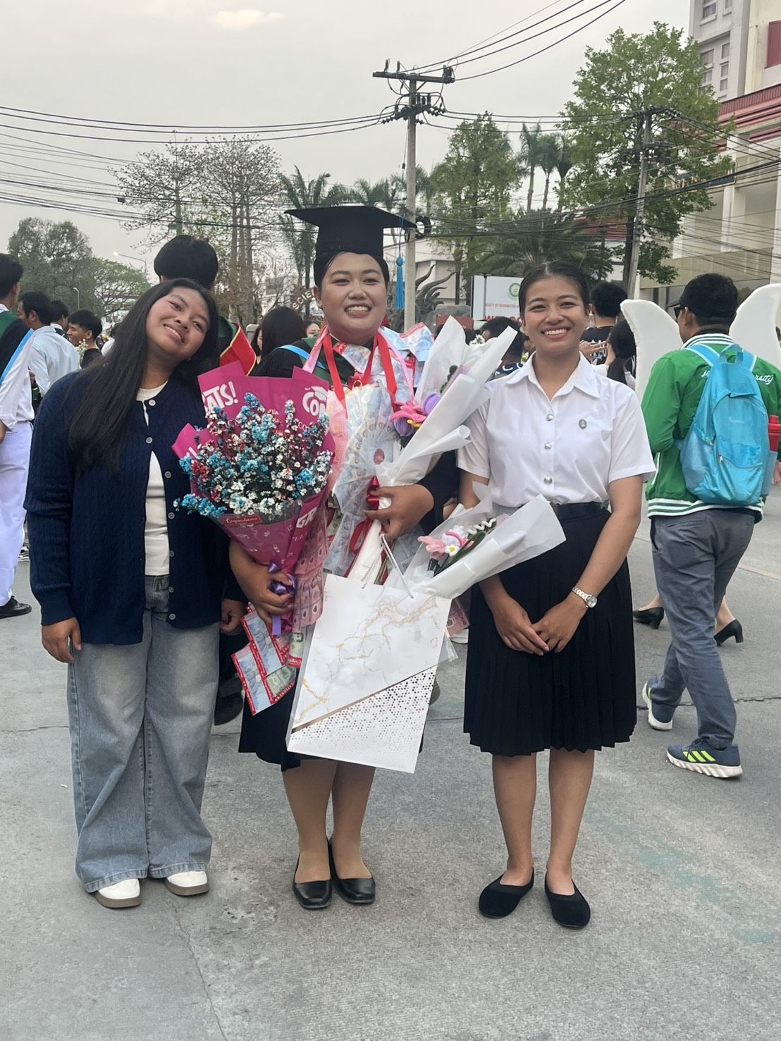 บรรยากาศภายในมหาวิทยาลัยเป็นไปอย่างคึกคัก ญาติสนิท มิตรสหาย และเพื่อนๆ ของบัณฑิตต่างเดินทางมาร่วมแสดงความยินดี พร้อมมอบช่อดอกไม้และของที่ระลึก เพื่อร่วมเฉลิมฉลองความสำเร็จในครั้งนี้ สะท้อนถึงความมุ่งมั่น ตั้งใจ และความเพียรพยายามตลอดระยะเวลาการศึกษา