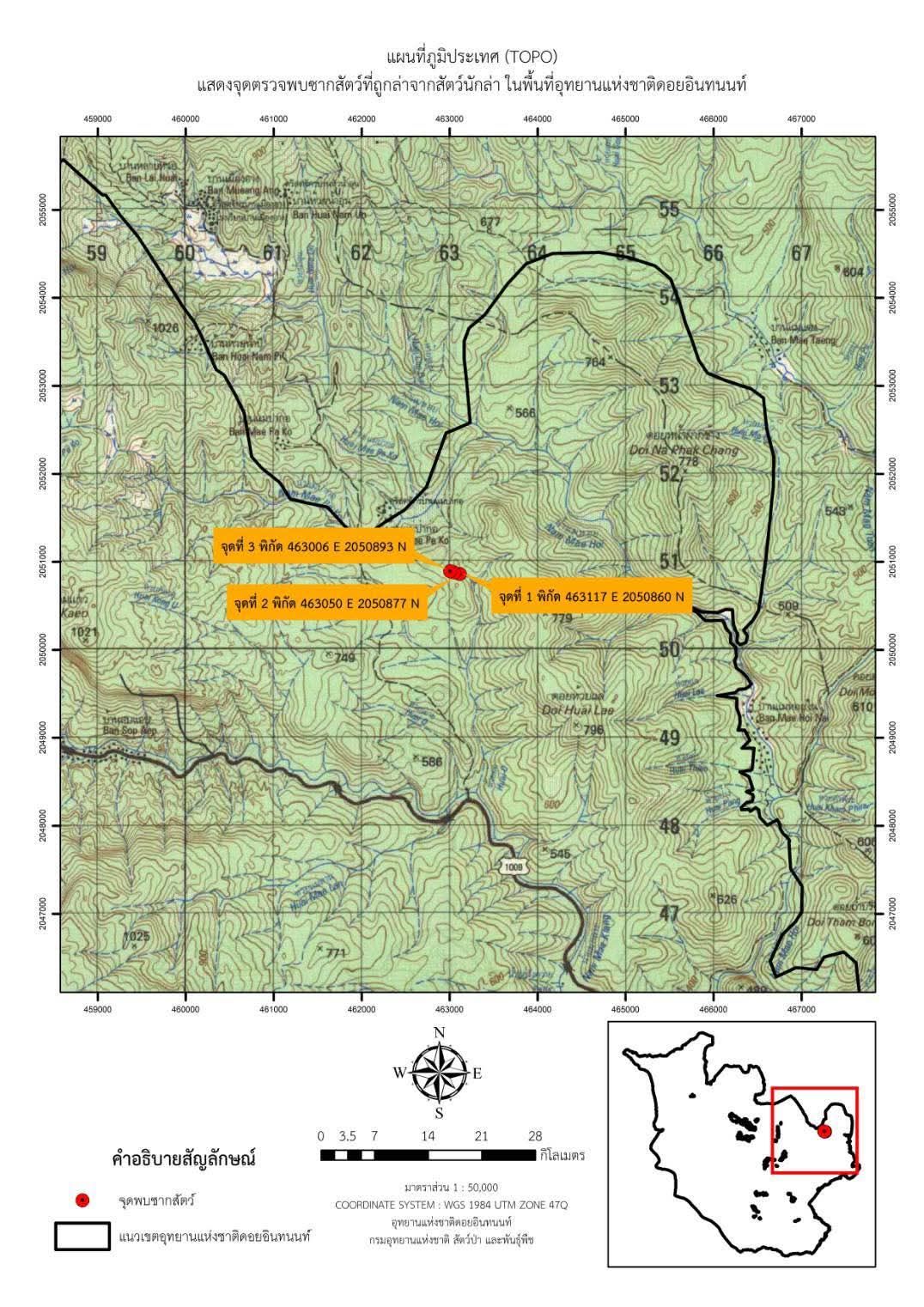 เมื่อวันที่ 24 กุมภาพันธ์ 2569 นายอรรถพล เจริญชันษา อธิบดีกรมอุทยานแห่งชาติ สัตว์ป่า และพันธุ์พืช เปิดเผยว่า จากรายงานของนายจิรนิติ เชิงสะอาด หัวหน้าอุทยานแห่งชาติดอยอินทนนท์ แจ้งว่าเมื่อเวลา 10.00 น. เจ้าหน้าที่อุทยานแห่งชาติดอยอินทนนท์ จังหวัดเชียงใหม่ ลงพื้นที่ตรวจสอบกรณีได้รับแจ้งจากชาวบ้านว่ามีการพบเห็นสัตว์ป่าคล้ายเสือโคร่งขนาดใหญ่ บริเวณป่าบ้านแม่ป่าก่อ หมู่ที่ 9 ตำบลบ้านหลวง อำเภอจอมทอง จังหวัดเชียงใหม่ จากการตรวจสอบพบร่องรอยอุ้งตีนสัตว์หลายรอยในบริเวณที่ได้รับแจ้ง แต่ยังไม่สามารถระบุชนิดสัตว์ได้อย่างชัดเจน โดยขนาดร่องรอยอุ้งตีนมีความกว้างประมาณ 6–7 เซนติเมตร นอกจากนี้ยังพบซากวัวถูกกัดบริเวณลำคอ จำนวน 3 ซาก ในพื้นที่ใกล้เคียงกัน 3 จุด ได้แก่ พิกัด 463117 E 2050860 N พิกัด 463050 E 2050877 N และ พิกัด 463006 E 2050893N ซึ่งแต่ละจุดอยู่ห่างกันประมาณ 50 เมตร จากนั้นเวลา 13.00 น. เจ้าหน้าที่อุทยานแห่งชาติดอยอินทนนท์ ได้ดำเนินการติดตั้งกล้องดักถ่ายภาพ (Camera Trap) เพื่อเฝ้าติดตามและตรวจสอบการเคลื่อนไหวของสัตว์ป่าในพื้นที่