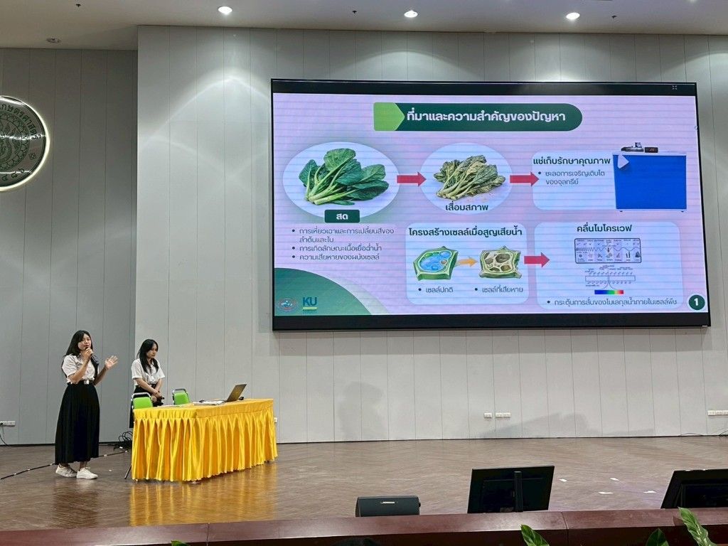 3. รางวัลชมเชย ด้านการนำเสนอ การแข่งขันด้านวิชาการภาคบรรยาย เรื่อง การประเมินความสมบูรณ์ของโครงสร้างระดับเซลล์ของคณะภายใต้กระบวนการทำความเย็นร่วมกับคลื่นไมโครเวฟ นักศึกษาเข้าร่วมแข่งขัน นางสาวธิชากรณ์ คำอ้อย และนางสาวพัทธนันท์ สมบูรณ์ โดยมีอาจารย์ควบคุมทีมการแข่งขัน ผศ.ดร.นิลวรรณ ไชยทนุ.