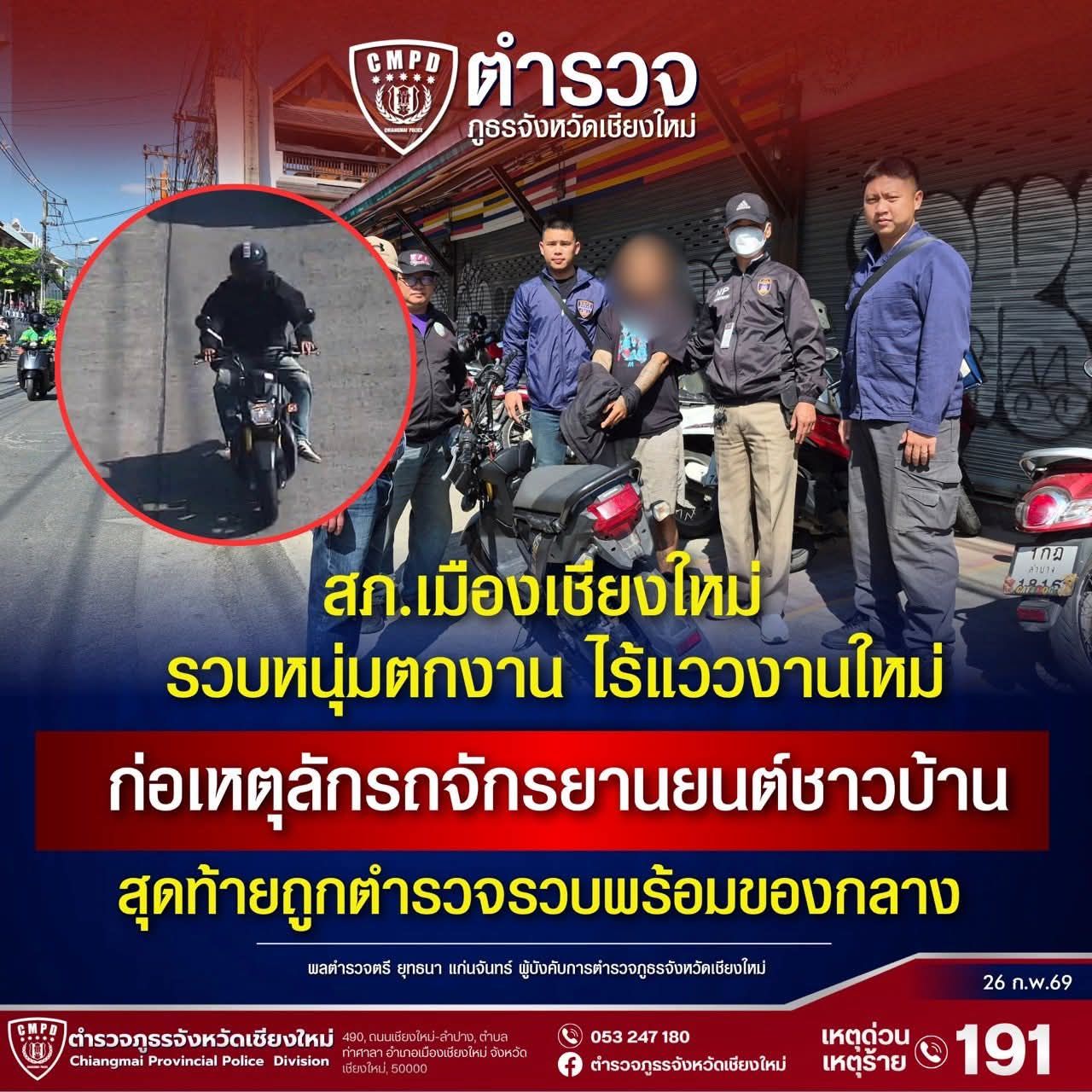 สภ.เมืองเชียงใหม่ รวบหนุ่มตกงาน ไร้แววงานใหม่ ก่อเหตุลักรถจักรยานยนต์ ชาวบ้าน
