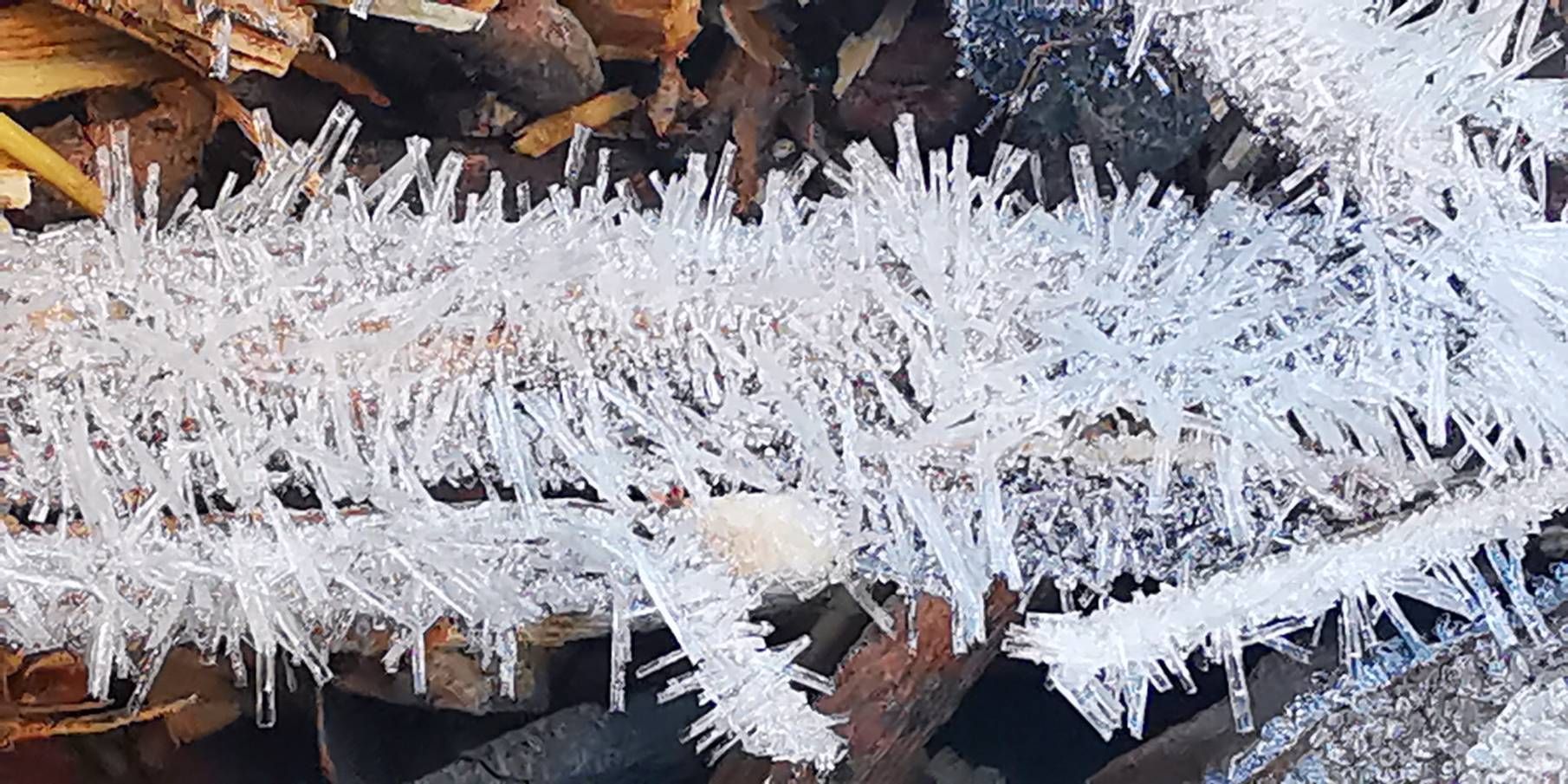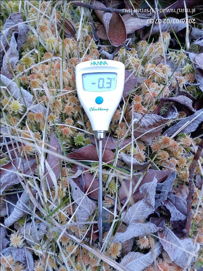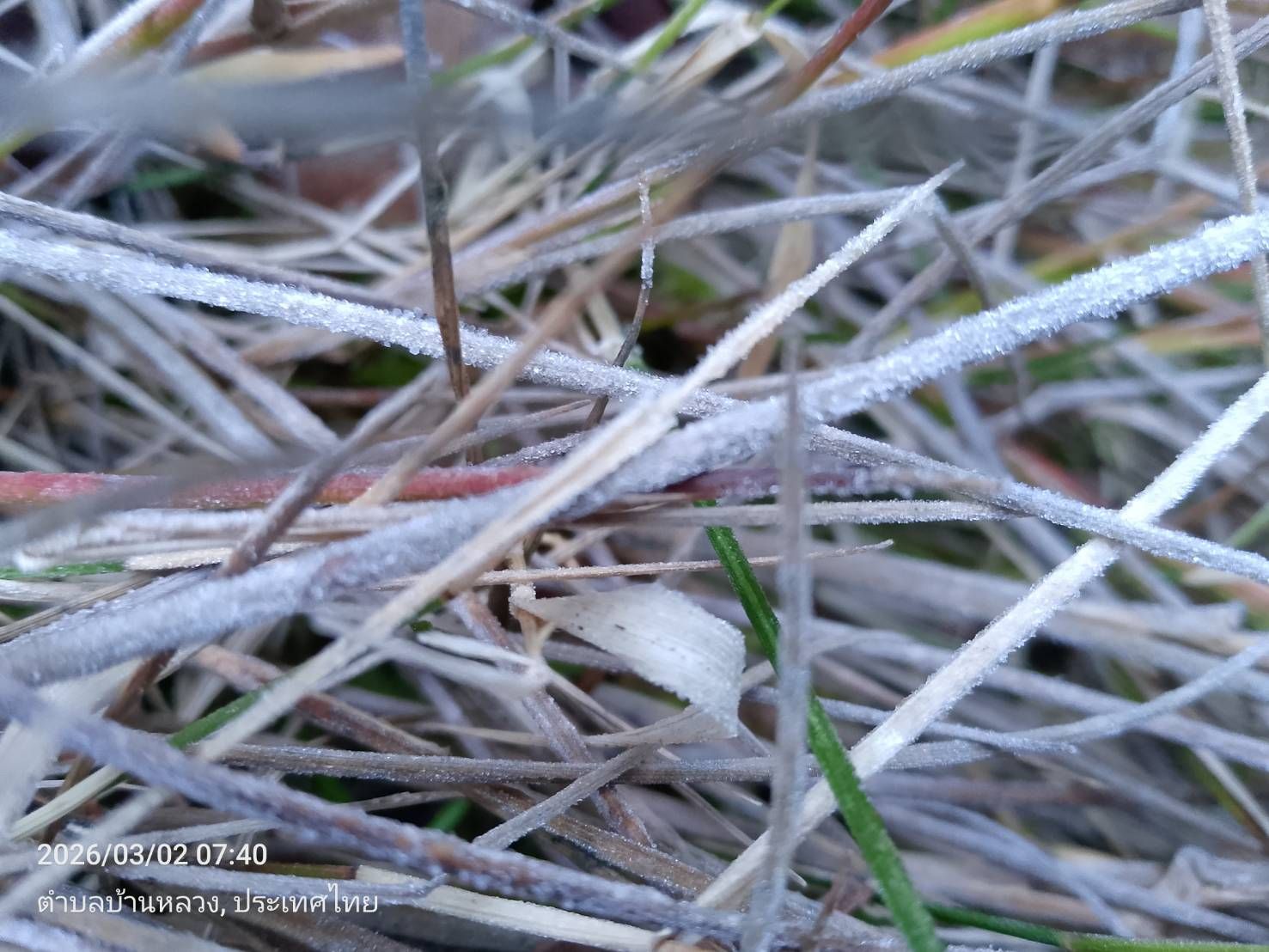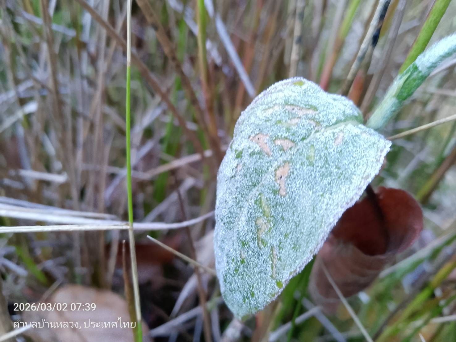 ไฮไลต์สำคัญของเช้านี้คือการปรากฏตัวของ “เหมยขาบ” หรือ “แม่คะนิ้ง” ครั้งที่ 46 ของฤดูหนาวปี 2568-2569 โดยพบเกาะพราวขาวโพลนบริเวณเส้นทางศึกษาธรรมชาติอ่างกา หลังจากอุณหภูมิยอดหญ้าดิ่งลดลงต่ำกว่าจุดเยือกแข็งแตะระดับ -0.3 องศาเซลเซียส ขณะที่อุณหภูมิต่ำสุดบริเวณยอดดอยและกิ่วแม่ปานวัดได้เท่ากันที่ 4 องศาเซลเซียส และบริเวณที่ทำการอุทยานฯ อยู่ที่ 9 องศาเซลเซียส