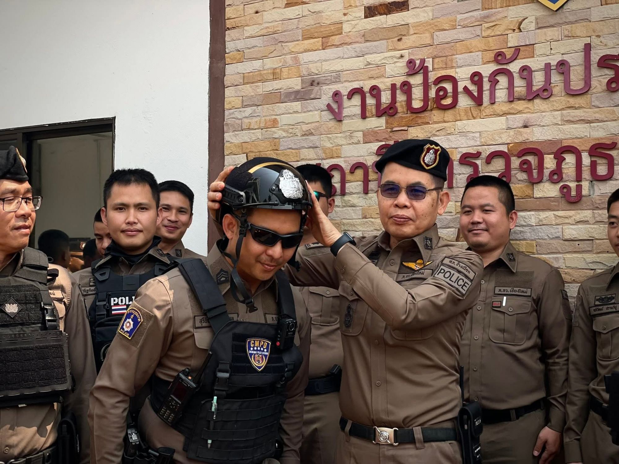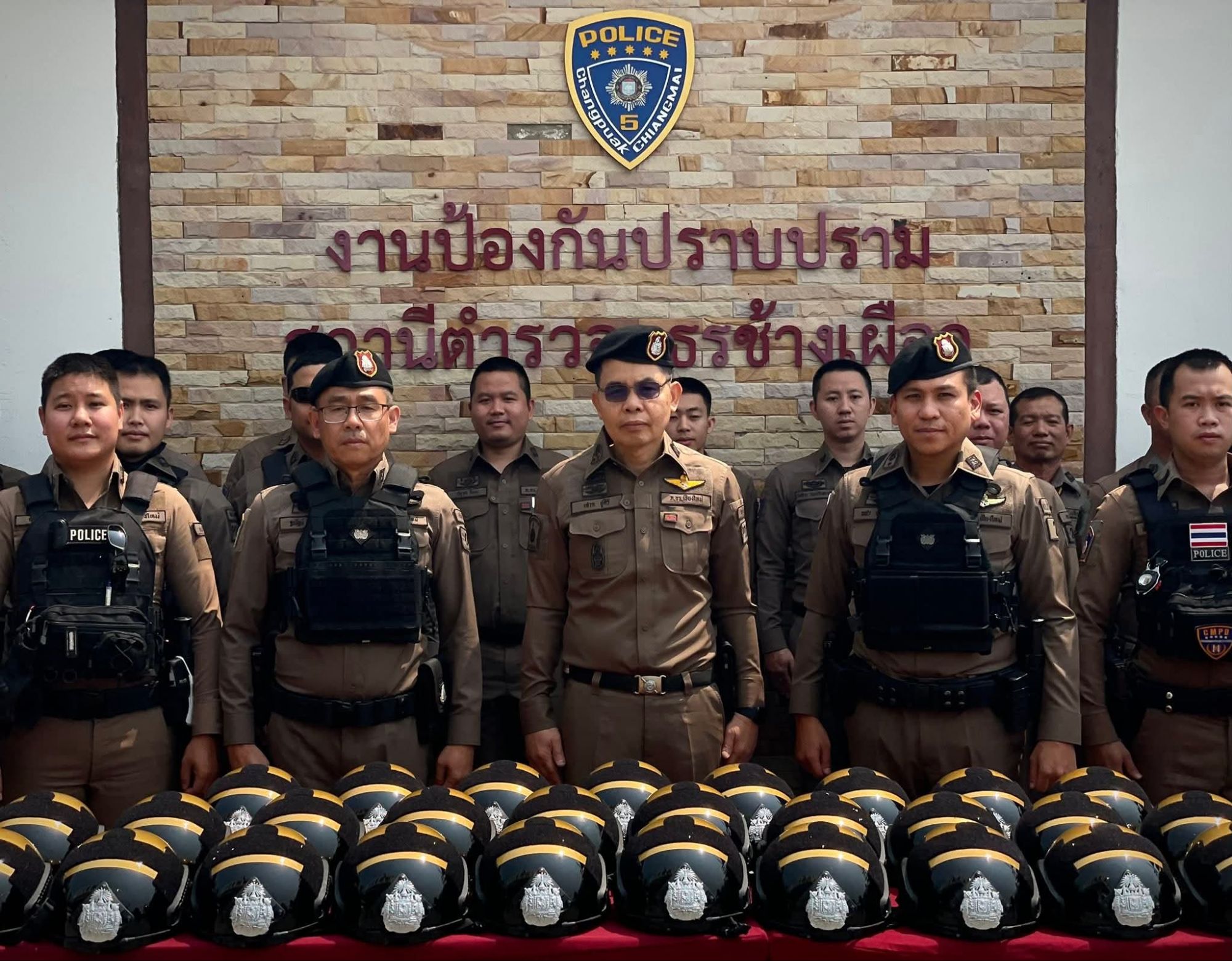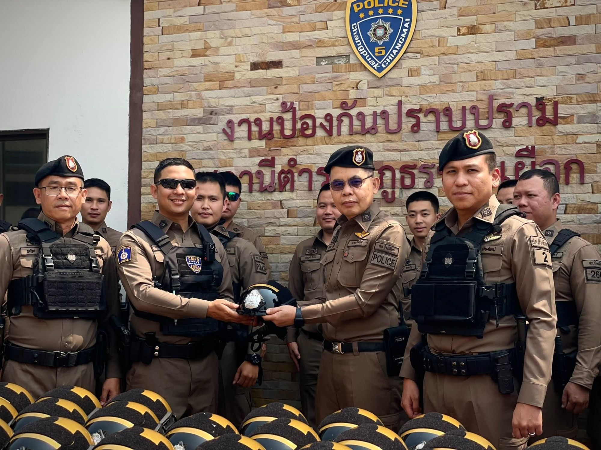 สถานีตำรวจภูธรช้างเผือก จังหวัดเชียงใหม่ เดินหน้าเสริมความพร้อมให้แก่เจ้าหน้าที่ผู้ปฏิบัติงานภาคสนาม โดยการอำนวยการของ พ.ต.อ.เสวก ชูศิริ ผกก.สภ.ช้างเผือก พร้อมด้วย พ.ต.ท.พชร พยัคฆา รอง ผกก.ป. และ พ.ต.ต.ฐณัฐน์ ปัดเป่า สวป. ได้ร่วมกันจัดพิธีมอบหมวกนิรภัย (หมวกกันน็อก) ชุดใหม่ให้แก่เจ้าหน้าที่ตำรวจสายตรวจ เพื่อใช้ประกอบการปฏิบัติหน้าที่รักษาความสงบเรียบร้อยและกวดขันวินัยจราจรในพื้นที่อย่างเต็มกำลัง