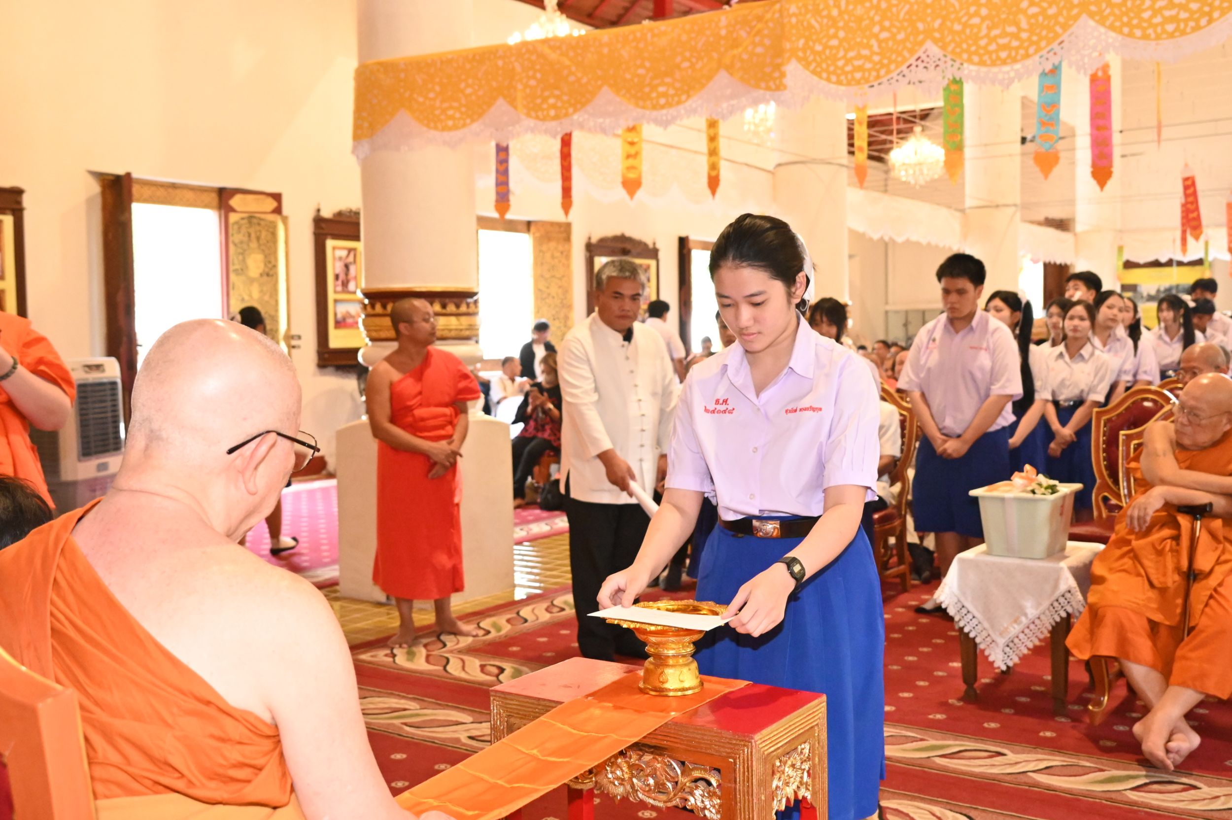 ต่อมา มัคคนายกได้นำอาราธนาพระปริตร พระสงฆ์เจริญพระพุทธมนต์ พร้อมเชิญแขกผู้มีเกียรติร่วมทอดผ้าไตรบังสุกุล พระสงฆ์พิจารณาผ้าไตรบังสุกุล และประกอบพิธีถวายสังฆทานจตุปัจจัยไทยธรรม โดยมีผู้มีจิตศรัทธาร่วมถวายทานอย่างพร้อมเพรียง