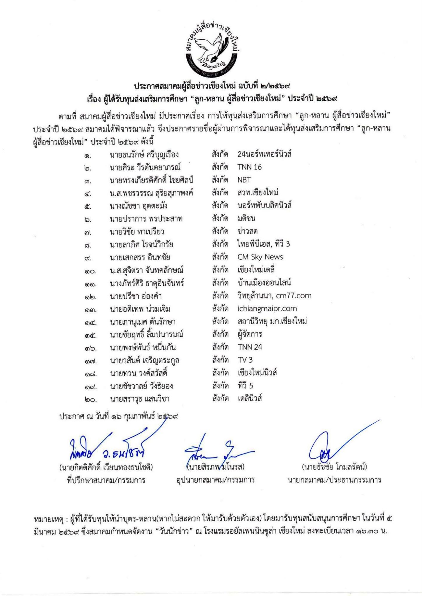 ผู้ได้รับทุนส่งเสริมการศึกษา “ลูก-หลาน ผู้สื่อข่าวเชียงใหม่” ประจำปี 2569 ตามที่ สมาคมผู้สื่อข่าวเชียงใหม่ มีประกาศเรื่อง การให้ทุนส่งเสริมการศึกษา “ลูก-หลาน ผู้สื่อข่าวเชียงใหม่” ประจำปี 2569 สมาคมได้พิจารณาแล้ว จึงประกาศรายชื่อผู้ผ่านการพิจารณาและได้รับทุนส่งเสริมการศึกษา “ลูก-หลาน ผู้สื่อข่าวเชียงใหม่” ประจำปี 2569 ดังนี้ นายธนรักษ์ ศรีบุญเรือง สังกัด 24นอร์ทเทอนิวส์, นายศิระ วีรตันตยาภรณ์ สังกัด TNN 16, นายทรงเกียรติศักดิ์ ไชยศิลป์ สังกัด NBT, น.ส.พชรวรรณ สุริยสุภาพงศ์ สังกัด สวท.เชียงใหม่, นางณัชชา อุตตะมัง สังกัด นอร์ทพับลิคนิวส์, นายปราการ พรประสาท สังกัด มติชน, นายวิชัย ทาเปรียว สังกัด ข่าวสด, นายลาภิศ โรจน์วิกรัย สังกัด ไทยพีบีเอส, ทีวี 3, นายเสกสรร อินทชัย สังกัด CM Sky News, น.ส.สุจิตรา จันทคลักษณ์ สังกัด เชียงใหม่เดลี่, นางภัทร์ศิริ ธาตุอินจันทร์ สังกัด บ้านเมืองออนไลน์,นายปรีชา อ่องคำ สังกัด วิทยุล้านนา, cm77.com, นายอดิเทพ น่วมเจิม สังกัด ichiangmaipr.com, นายภานุเมศ ตันรักษา สังกัด สถานีวิทยุ มก.เชียงใหม่, นายชัยฤทธิ์ ส้มปนารมณ์ สังกัด ผู้จัดการ, นายพงษ์พันธ์ หมื่นกัน สังกัด TNN 24, นายสันต์ เจริญตระกูล สังกัด TV 3, นายทวน วงศ์สวัสดิ์ สังกัด เชียงใหม่นิวส์, นายชัชวาลย์ วังขิยอง สังกัด ทีวี 5 และนายสราวุธ แสนวิชา สังกัด เดลินิวส์
