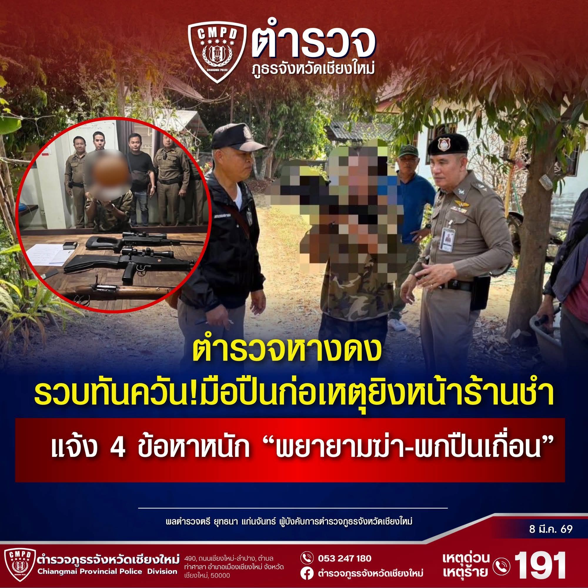 รวบทันควัน! ตำรวจหางดงจับมือปืนยิงสนั่นหน้าร้านชำน้ำแพร่ เจอแจ้ง 4 ข้อหาหนักสังเวยนโยบายเชียงใหม่เมืองปลอดภัย