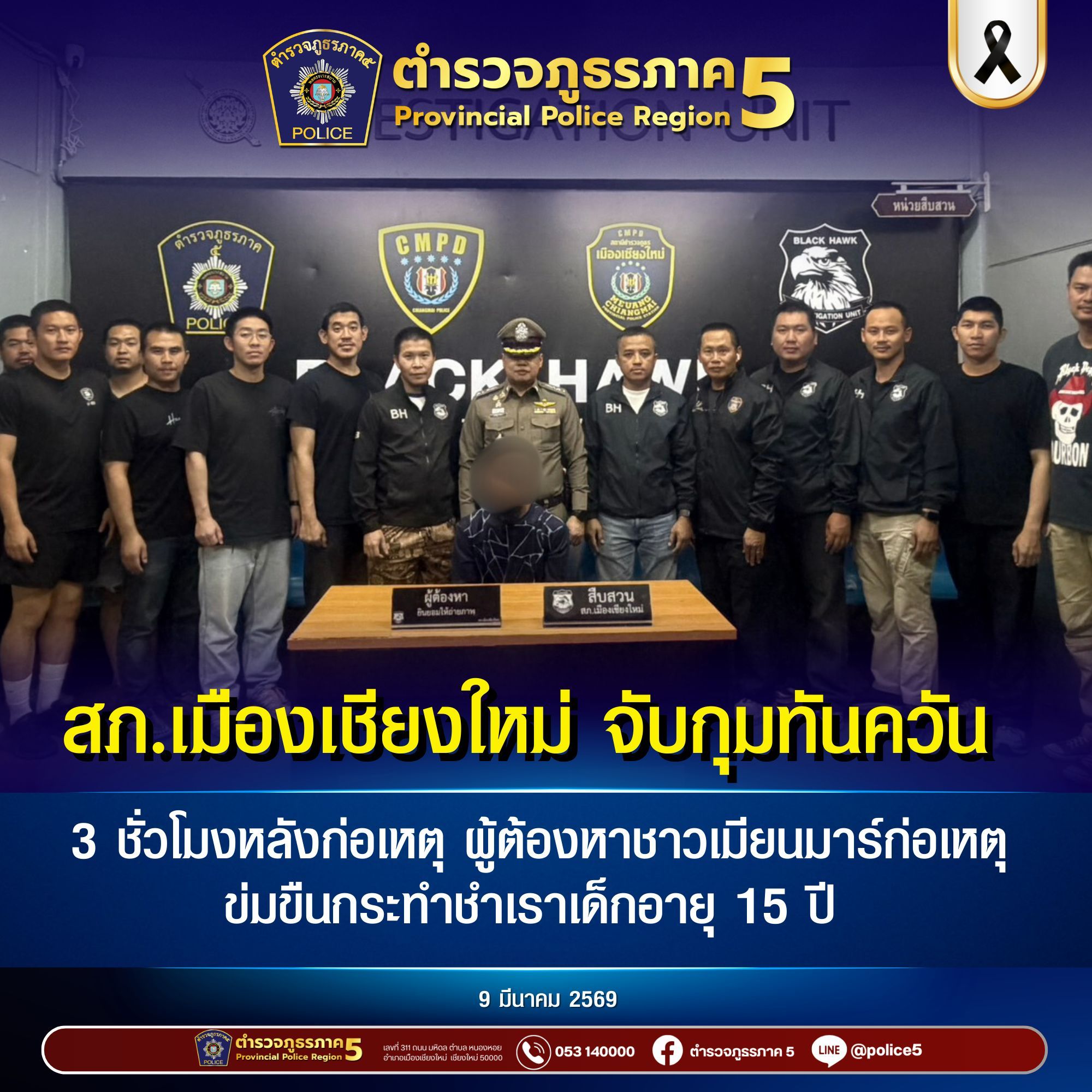 โดยมีพฤติการณ์ เมื่อวันที่ 9 มีนาคม 2569 เวลา 18.00 น. เจ้าหน้าที่ชุดสืบสวน สภ.เมืองเชียงใหม่ ได้รับแจ้ง จากพนักงานวิทยุ สภ.เมืองเชียงใหม่ว่ามีเหตุข่มขืนกระทำชำเราเด็ก ภายในบ้าน ต.ช้างคลาน ถ.เจริญประเทศ อ.เมืองเชียงใหม่ จ.เชียงใหม่ จึงได้ร่วมกับ พงส.เวรฯ ตรวจสอบที่เกิดเหตุ จากการสอบถามผู้เสียหายทราบว่า เมื่อเวลาประมาณ 17.15 น. ได้มีชายแต่งกายสวมเสื้อแขนสั้นสีน้ำเงิน กางเกงขายาวสีดำ เข้ามายังบริเวณภายในบ้านและใช้อาวุธมีดที่อยู่ภายในบ้านบังคับขู่เข็ญให้ผู้เสียหายร่วมประเวณีกับตน โดยที่ผู้เสียหายไม่ยินยอม หลังจากชายคนดังกล่าวกระทำชำเราผู้เสียหายเสร็จสิ้นแล้ว จึงได้หลบหนีไปยังประตูหน้าบ้าน ต่อมาเจ้าหน้าที่ตำรวจชุดสืบสวนได้ออกสืบสวนโดยรอบบริเวณที่เกิดเหตุและบริเวณใกล้เคียงประกอบกับการตรวจสอบกล้องวงจรปิดที่อยู่ตรงข้ามและใกล้เคียงกับบ้านผู้เสียหาย พบภาพบุคคลเป็นชายแต่งกายสวมเสื้อแขนสั้นสีน้ำเงิน กางเกงขายาวสีดำ เดินมุ่งหน้าไปยังบ้านผู้เสียหาย เจ้าหน้าที่จึงเชื่อว่าบุคคลดังกล่าวเป็นผู้ก่อเหตุตามที่ผู้เสียหายให้การไว้จริง จึงได้กระจายกำลังค้นหาภายในบ้านร้างและบริเวณใกล้เคียง