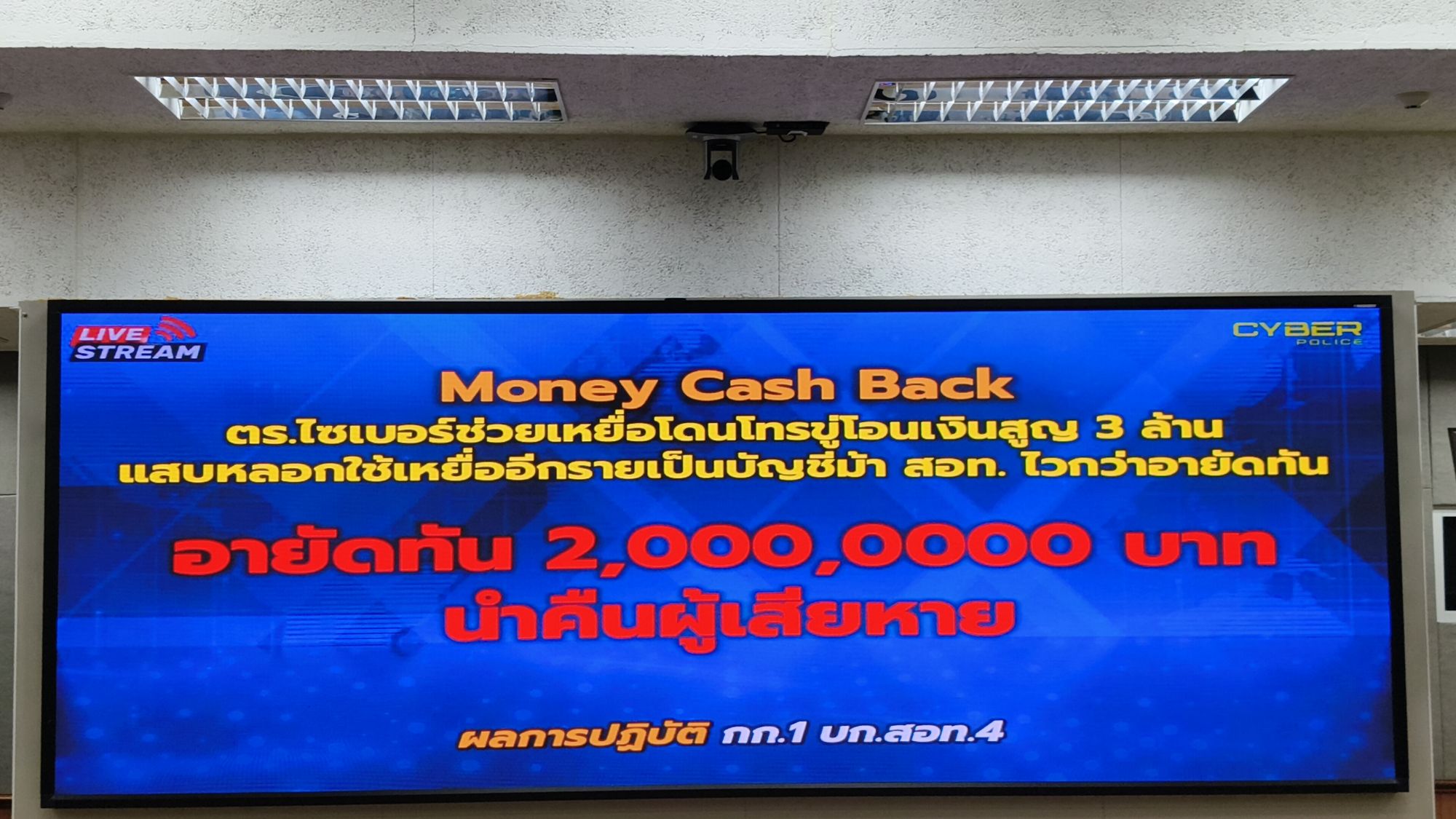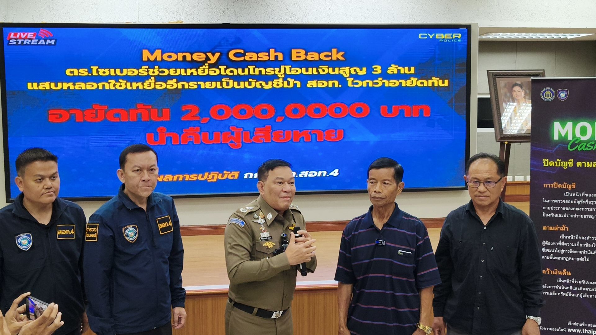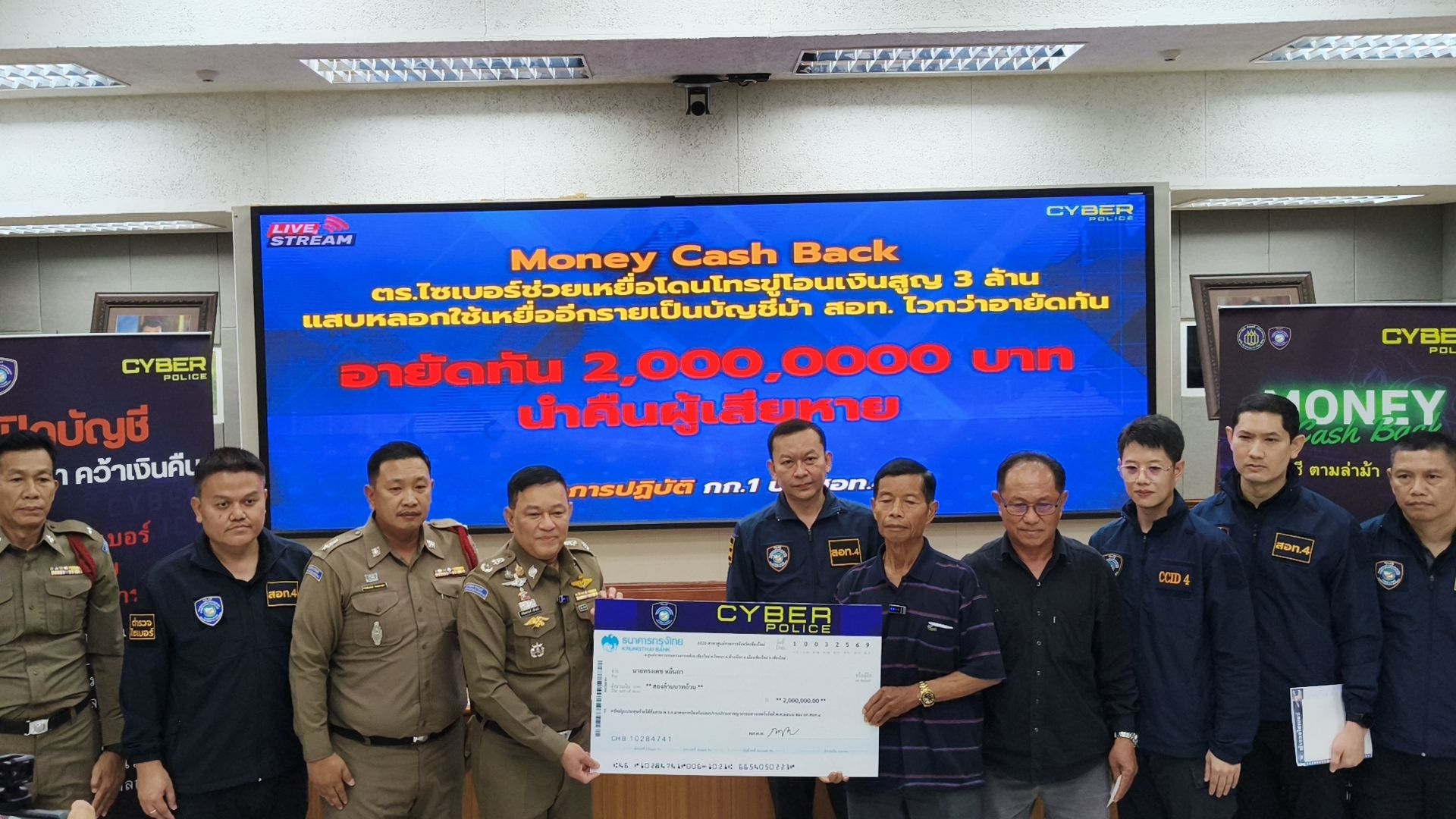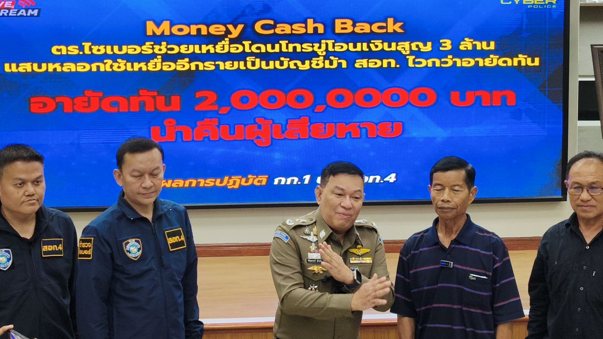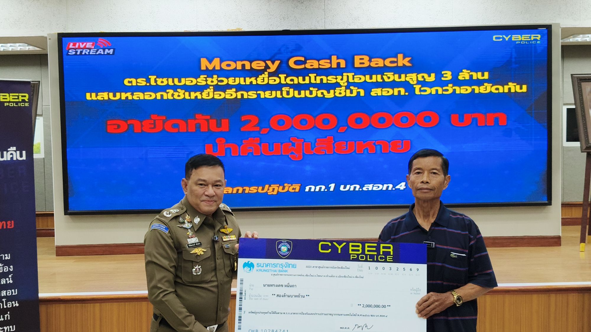 โดยวันนี้ พล.ต.ต.ชัชปัณฑกาณฑ์ คล้ายคลึง รอง ผบช.สอท. พร้อมเจ้าหน้าที่ตำรวจชุดติดตามคดี จึงได้ร่วมกันนำเงินจำนวน 2,000,000 บาท คืนให้แก่ผู้เสียหาย ตามโครงการ “MONEY Cash Back ปิดบัญชี ตามล่าม้า คว้าเงินคืน” ณ บก.สอท.4 อ.แม่ริม จ.เชียงใหม่.