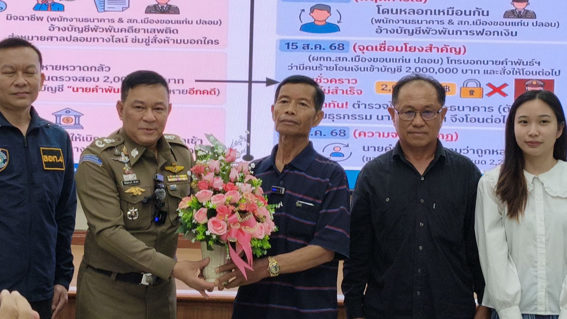 สืบเนื่องจาก เมื่อวันที่ 14 ส.ค.68 ได้มีผู้เสียหายรายหนึ่งโดนมิจฉาชีพแอบอ้างเป็นพนักงานธนาคารโทรศัพท์มาหาเรื่องบัญชีธนาคารของผู้เสียหาย จากนั้นได้มีเจ้าหน้าที่ตำรวจ สภ.เมืองขอนแก่น (ปลอม) ข่มขู่ว่าบัญชีธนาคารของผู้เสียหายเข้าไปพัวพันกับคดียาเสพติดร้ายแรง พร้อมทั้งให้แอดไลน์แล้วส่งหมายศาลปลอมมาให้เพื่อสร้างความน่าเชื่อถือและทำให้ผู้เสียหายเกิดความหวาดกลัว พร้อมทั้งข่มขู่ว่าหากไม่ให้ความร่วมมือ ผู้เสียหายจะถูกอายัดบัญชีและดำเนินคดีตามกฎหมาย จากนั้นมิจฉาชีพได้สั่งให้ผู้เสียหายโอนเงินที่มีอยู่ทั้งหมดไปให้เจ้าหน้าที่ตรวจสอบ