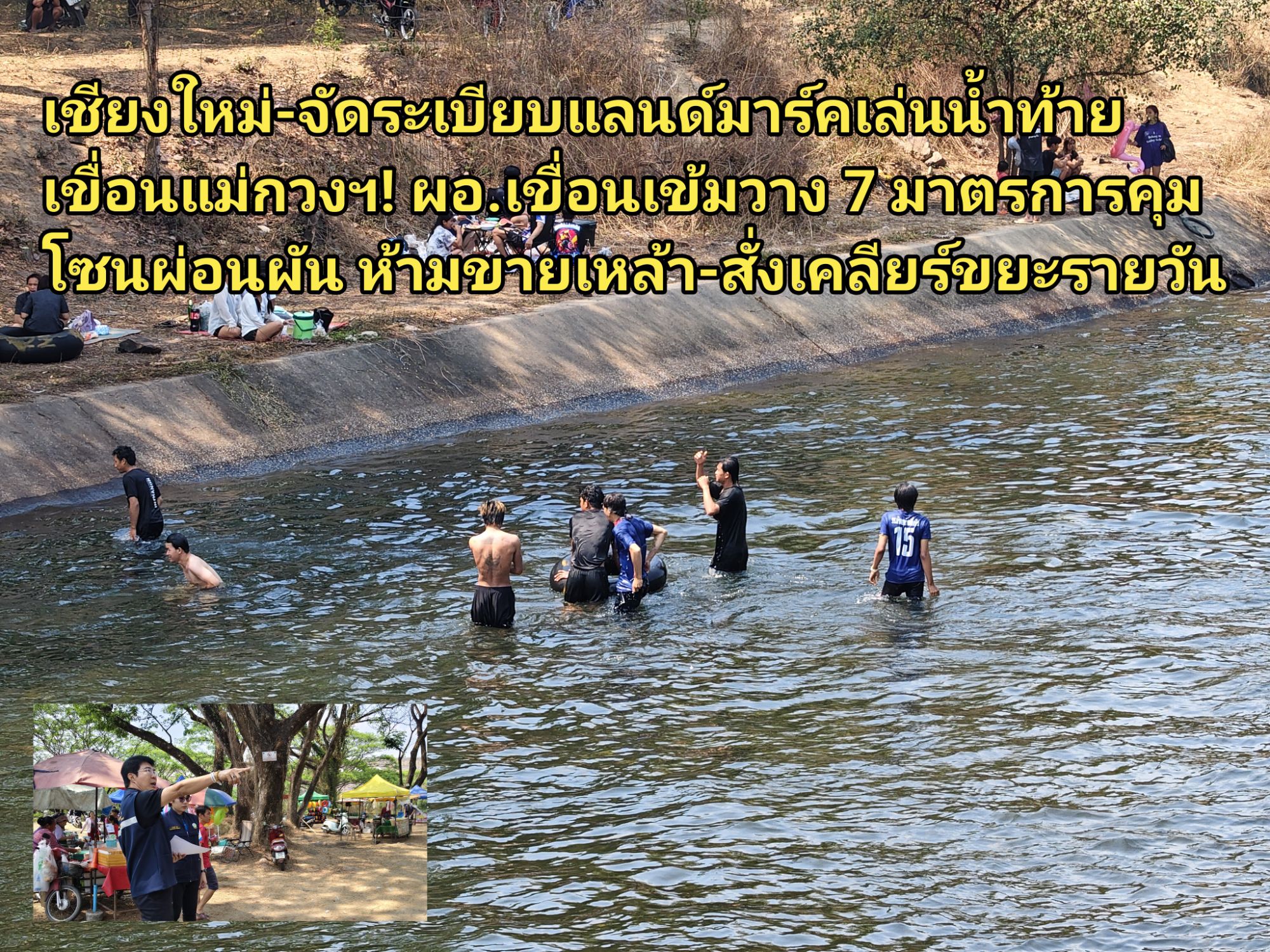 สำหรับมาตรการทั้ง 7 ประกอบด้วย การตรวจสอบขอบเขตการใช้พื้นที่ตามกฎหมายชลประทาน, การประกาศกำหนดโซนผ่อนผันชั่วคราวโดยระบุวันเวลาและสถานที่ค้าขายที่ชัดเจนโดยไม่มีการเก็บค่าใช้จ่าย, การให้ผู้ค้ามายื่นขออนุญาตลงทะเบียนแจ้งชื่อ-นามสกุลและประเภทสินค้าที่จะขาย พร้อมสั่งห้ามขายเครื่องดื่มแอลกอฮอล์ทุกชนิดโดยเด็ดขาด, การสั่งห้ามปลูกสร้างสิ่งปลูกสร้างถาวรใกล้คลองและอาคารชลประทาน, การจัดโซนพื้นที่เล่นน้ำและพื้นที่ค้าขายให้มีความเหมาะสมในช่วงเดือนมีนาคม-เมษายน, การประสานงานร่วมกับ สภ.สันทราย, สภ.ดอยสะเก็ด รวมถึงเทศบาลตำบลลวงเหนือและเทศบาลตำบลหนองแหย่ง เพื่อจัดกำลังเจ้าหน้าที่และอาสาสมัครดูแลความปลอดภัย