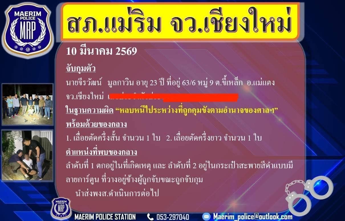 เชียงใหม่ – เมื่อช่วงดึกของวันที่ 10 มีนาคม 2569 เจ้าหน้าที่ตำรวจชุดสืบสวน สภ.แม่ริม ภายใต้การอำนวยการของ พ.ต.อ.ยุทธการ เมธา ผกก.สภ.แม่ริม และ พ.ต.ท.อัครพล อมรเวช รอง ผกก.สส.สภ.แม่ริม ร่วมกับนายมงคล จันทะจร ผู้บัญชาการเรือนจำกลางเชียงใหม่ ได้สนธิกำลังบุกเข้าจับกุมตัวผู้ต้องหาหลบหนีการคุมขังได้อย่างรวดเร็ว