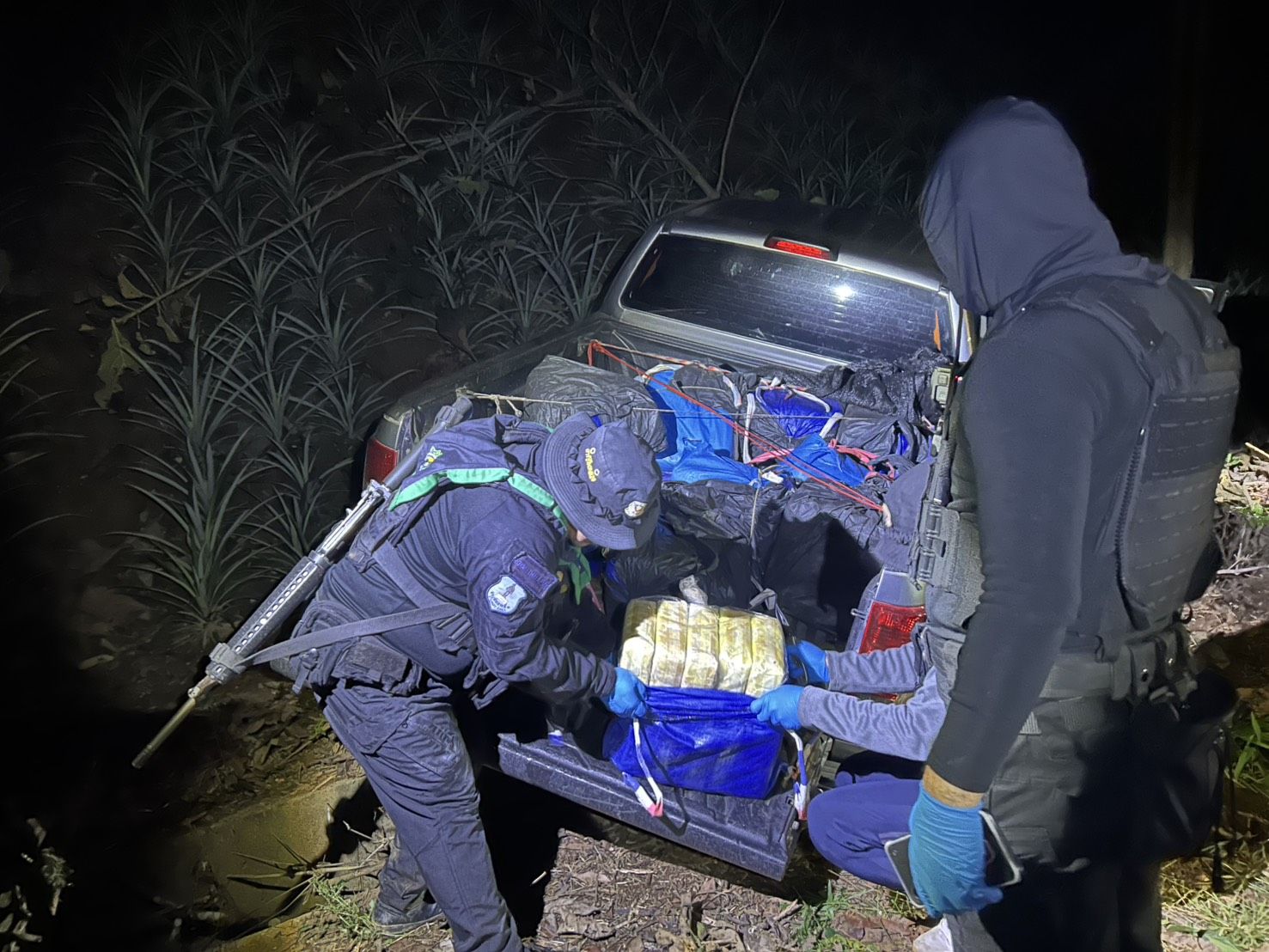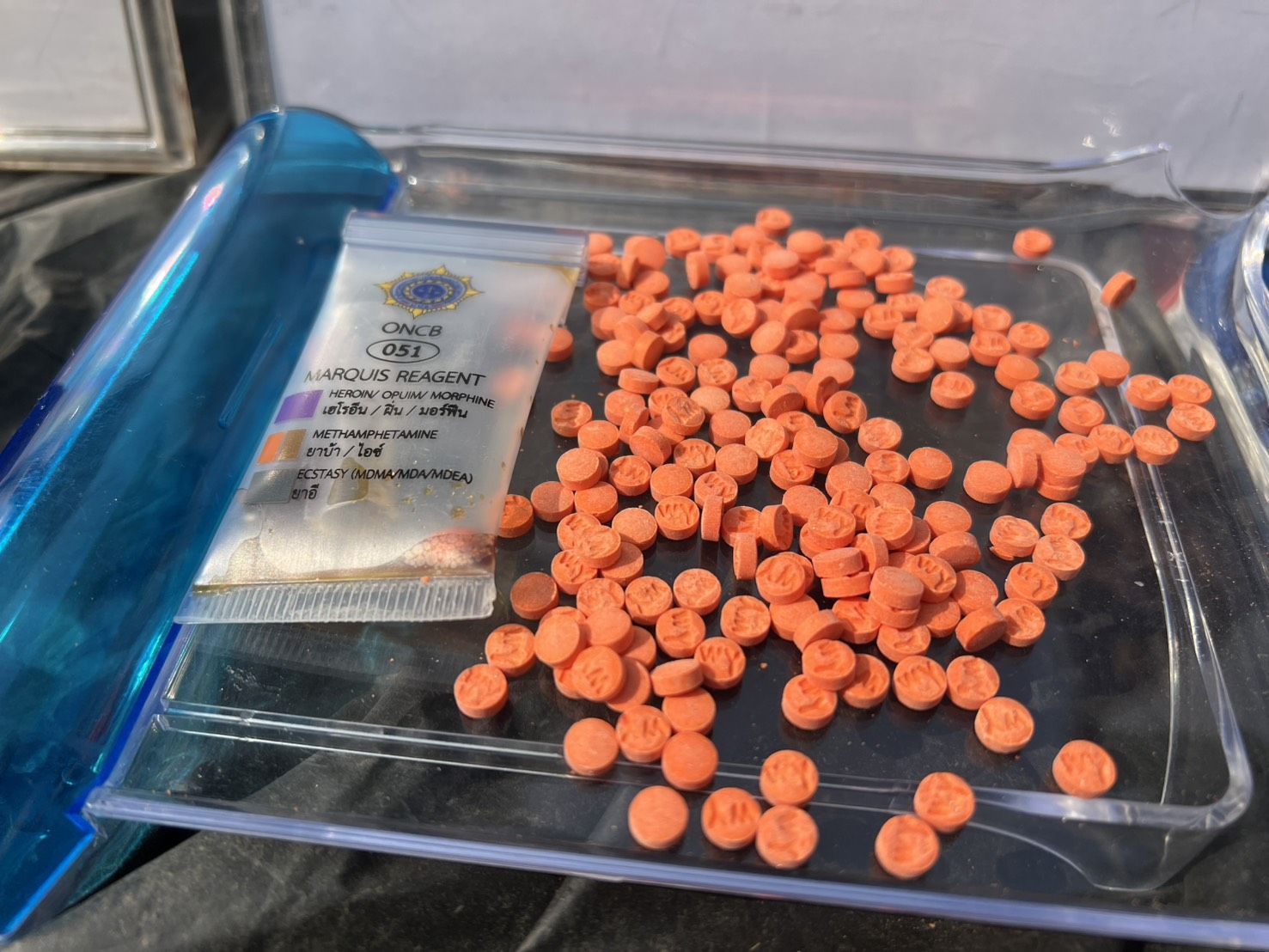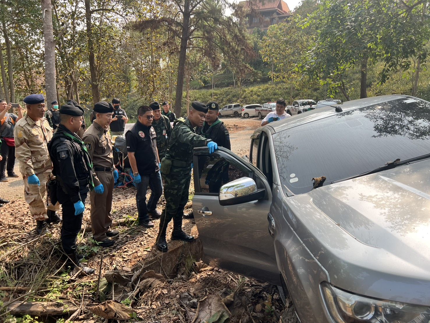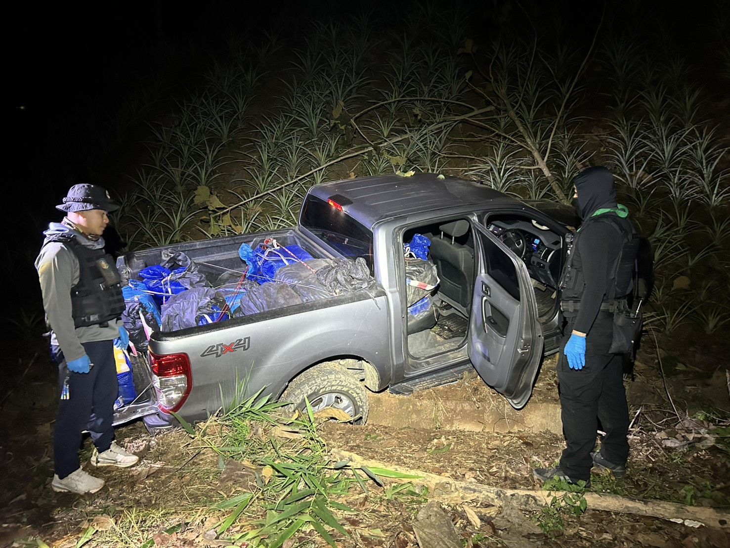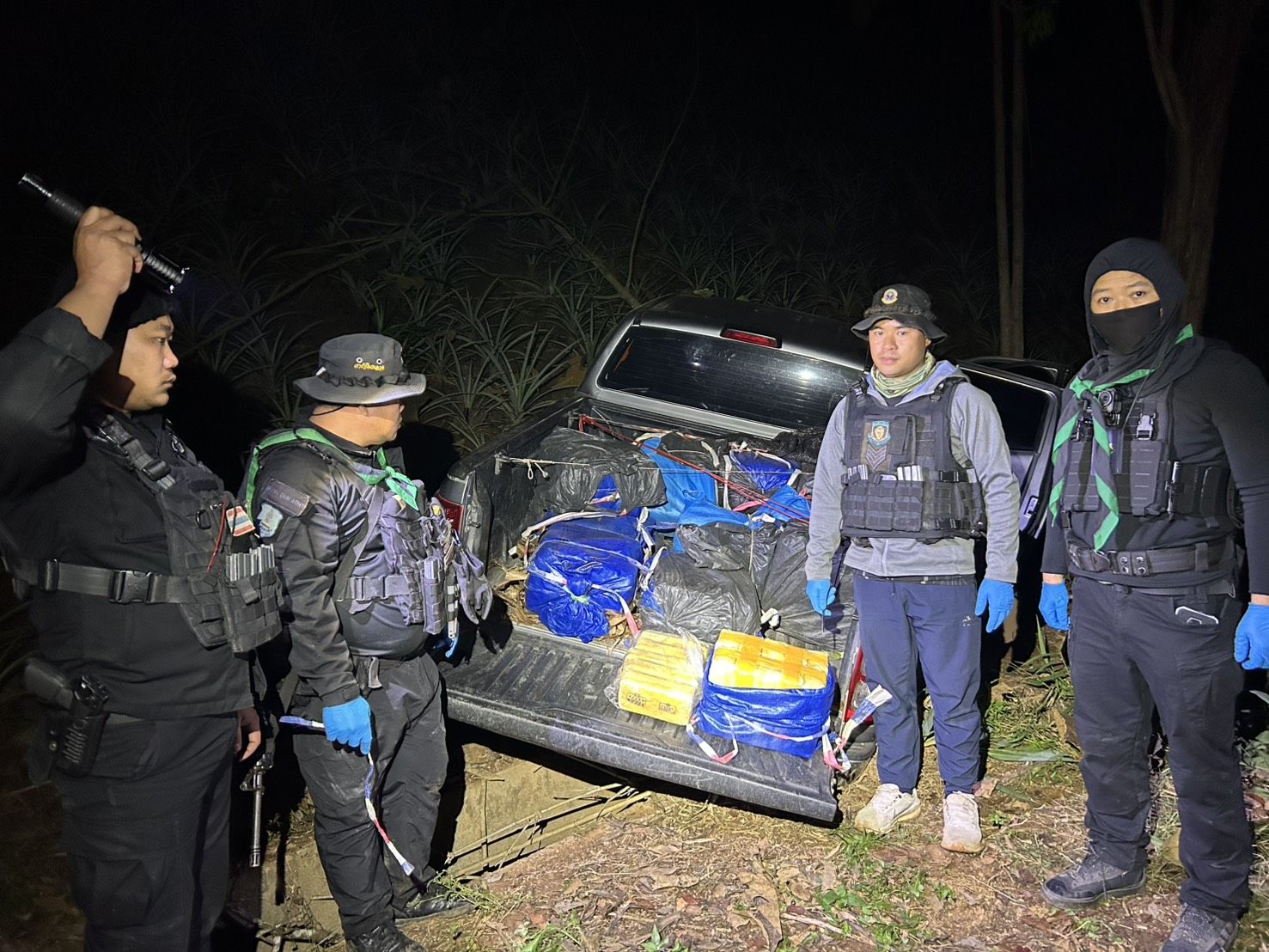 ต่อมาเมื่อวันที่ 15 มีนาคม 2569 เวลา 00.50 น. ได้ตรวจพบรถยนต์ต้องสงสัย จำนวน 1 คัน จึงแสดงตัวเพื่อขอตรวจค้น แต่รถยนต์คัดดังกล่าวได้ขับหลบหนี หน่วยจึงได้ทำการติดตามรถยนต์คันกล่าว จนถึงบริเวณ บ้านรุ่งเจริญ หมู่ที่ 11 ตำบลศรีค้ำ อำเภอแม่จัน จังหวัดเชียงราย พบรถยนต์ต้องสงสัยจอดทิ้งไว้ และผู้ต้องสงสัยได้ทำการหลบหนีไปได้ จากการตรวจสอบพบ รถยนต์ ยี่ห้อ ฟอร์ด สีบรอนซ์ – เงิน ทะเบียน ขธ 1512 เชียงราย ภายในรถพบ กระสอบฟางสีฟ้า ห่อหุ้มด้วยถุงพลาสติกสีดำ จำนวน 14 กระสอบ ด้านหลังกระบะรถยนต์ และ ภายในรถยนต์บริเวณหลังคนขับ จำนวน 6 กระสอบ รวมทั้งสิ้น 20 กระสอบ ภายในบรรจุยาเสพติดให้โทษประเภท 1 (ยาบ้า) กระสอบละประมาณ 150,000 เม็ด รวมทั้งสิ้นประมาณ 3,000,000 เม็ด