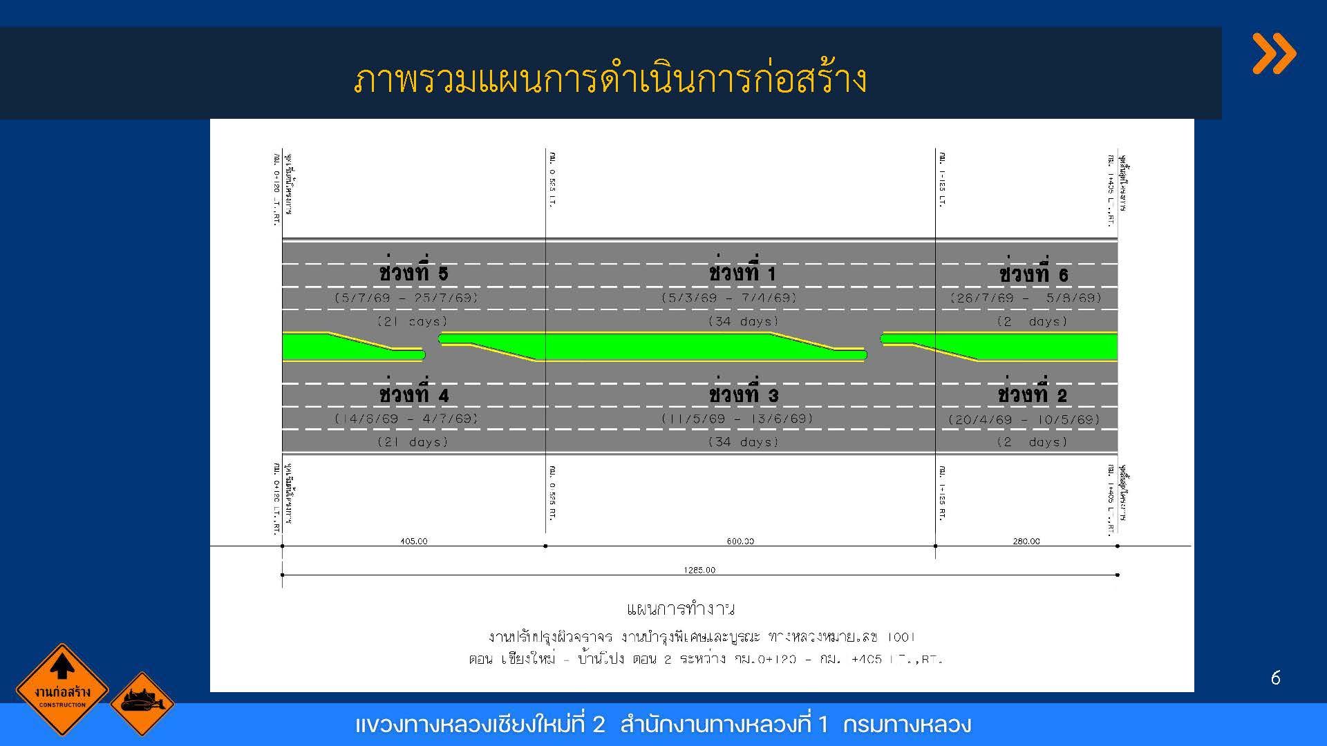 สำหรับแผนงานที่วางไว้ในการดำเนินการก่อสร้างปรับปรุงทาง โครงการฯ จะคำนึงถึงผลกระทบของผู้ใช้ทางอย่างมาก แล้วก็ประชาชนสองข้างทาง เนื่องจากมีปริมาณการจราจรที่เยอะ ปกติการสัญจรผ่านเส้นทางนี้การจราจรก็มักติดขัดอยู่แล้ว จึงมีการประชุมหารือกันหลายครั้ง สรุปมีการกำหนดแผนการก่อสร้างไว้เป็น 6 ช่วง โดยในช่วงกลางจะมีระยะประมาณ 600 เมตร ส่วนช่วงหัวและปลายโครงการฯ ทั้งทางด้านโรงพยาบาลเทพปัญญาและด้านแยกรวมโชค จะมีระยะประมาณ 300 เมตร