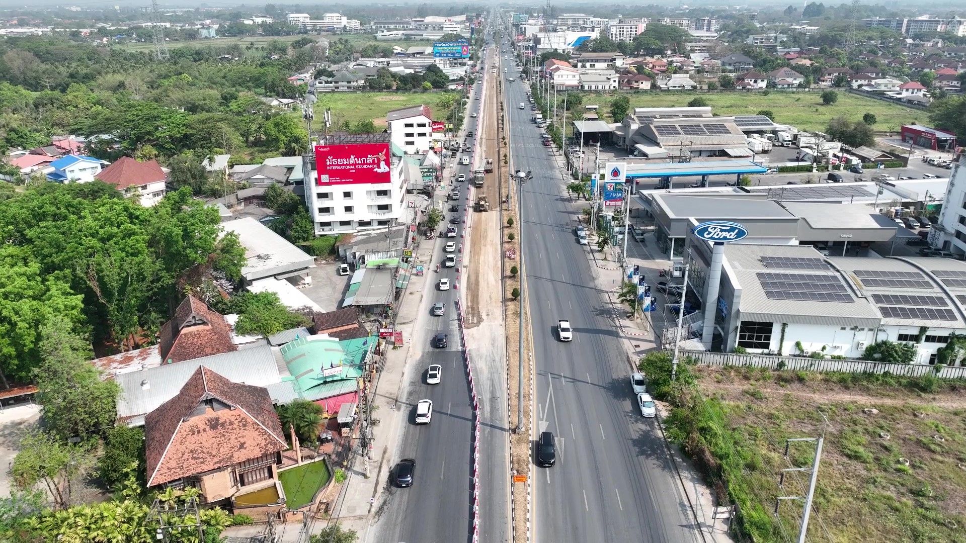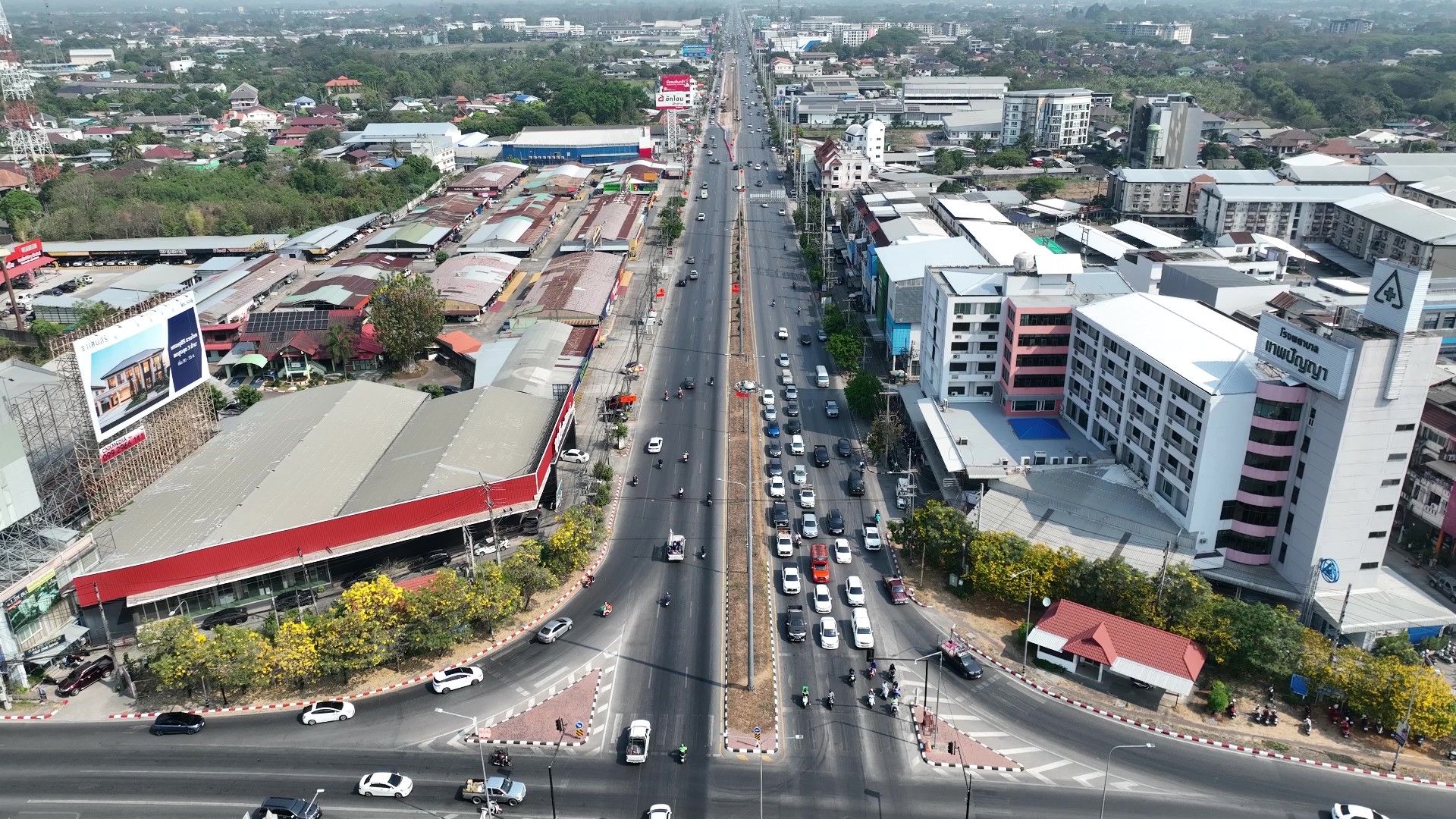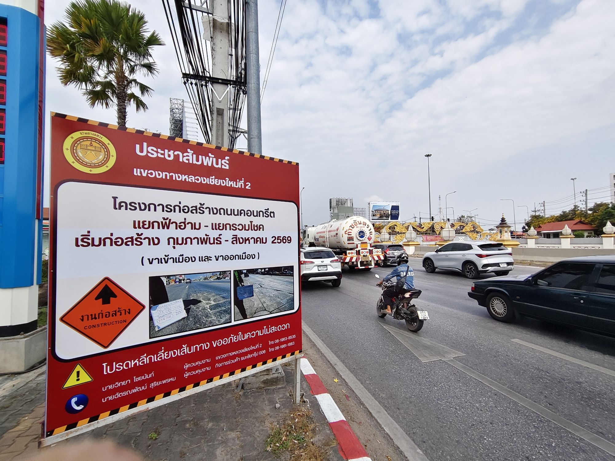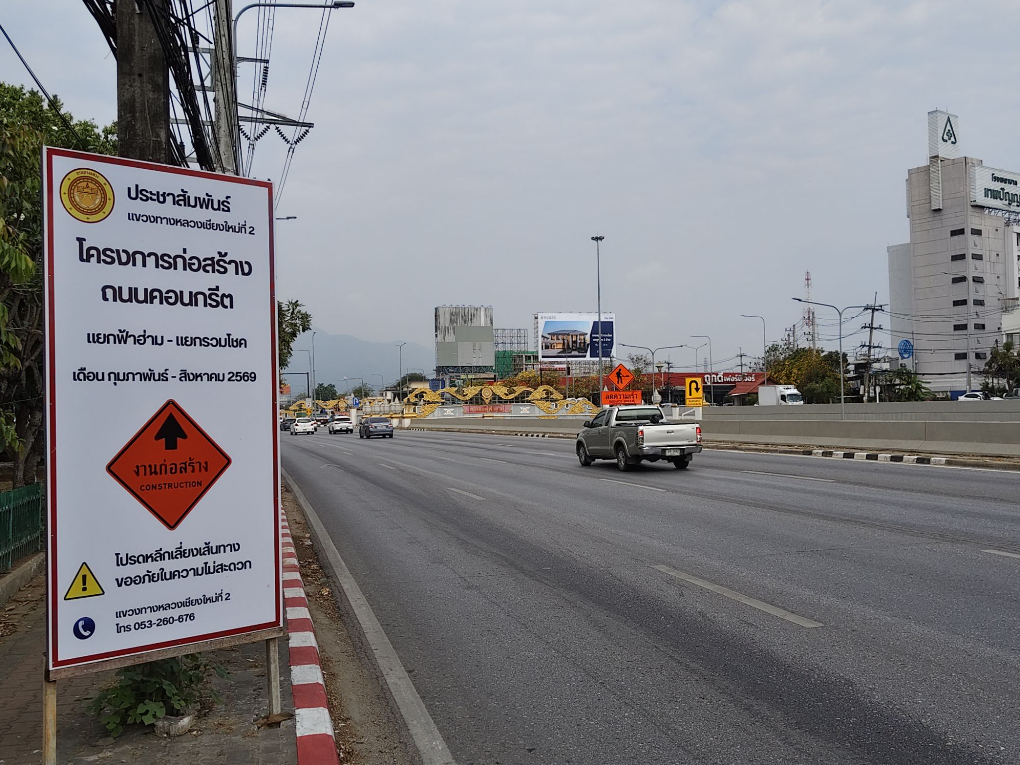 เชียงใหม่-แจงยิบงานปรับปรุงผิวทางแยกเทพปัญญา-แยกรวมโชค จำเป็นต้องรื้อทำเป็นผิวคอนกรีต เพราะพื้นทางเดิมปรับปรุงยากใช้เวลาก่อสร้างนาน แบ่งงานเป็น 6 ช่วง ทำช่วงละ 30 วัน ทำเสร็จทีละช่วงเปิดใช้เลย คอนกรีตผิวทางใช้ชนิดพิเศษเซตตัวไว เพื่อให้งานไวขึ้นปรับแบบจากงานบดอัดพื้นทางเป็นเทรีนคอนกรีตแทน ก่อวางเหล็กเทคอนกรีตผิวทางหนา 25 ซม. ช่วงแรกจะจบก่อนสงกรานต์แล้วเป็นใช้ครบ 6 ช่องทาง คาดปิดจบเดือนสิงหาคมหรืออาจไวกว่านั้น ชี้ Overlay ทำให้ถนนสูง กระทบชาวบ้าน 2 ข้างทางและระบบระบายน้ำ